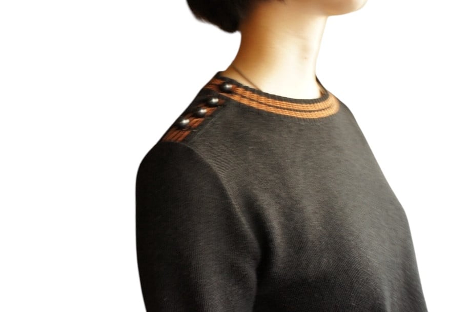 肩の丸ボタンや、袖やウェストのリブが上品。短めでフェミニンなスタイル。