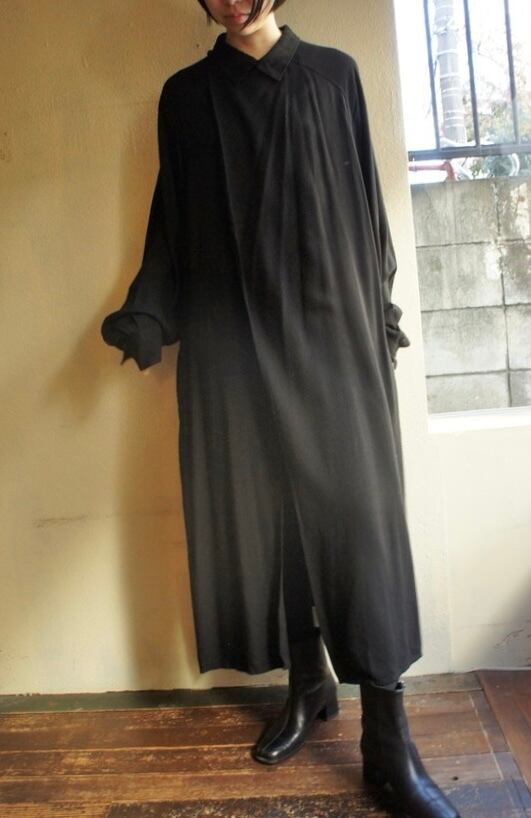 胸元を覆うデザインがモードな一着。