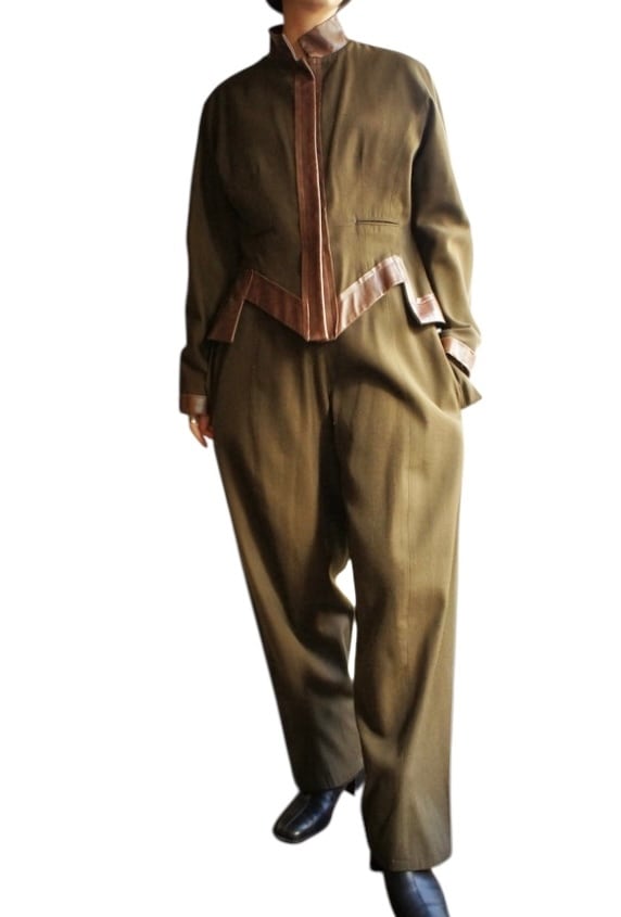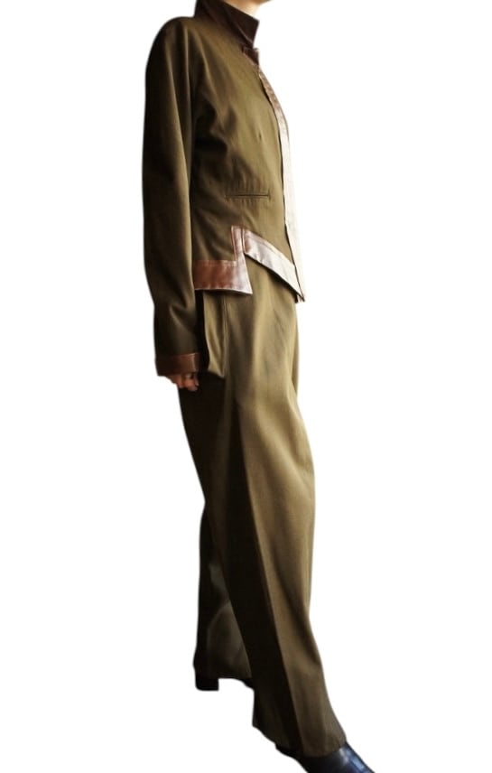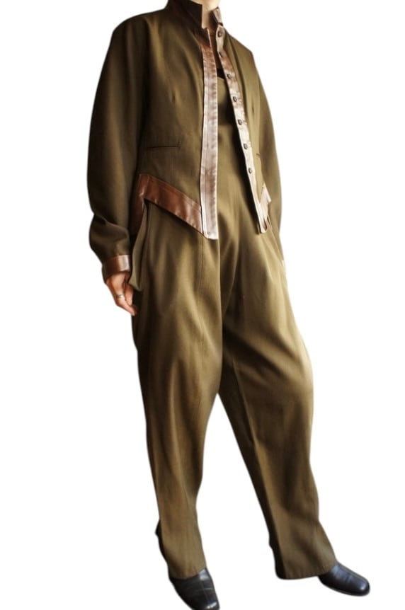 カーキブラウン地にブラウンレザーのパイピングがユニークなyohji yamamoto 80's Vintage Set up、初期のyohjiの貴重なアーカイブ!