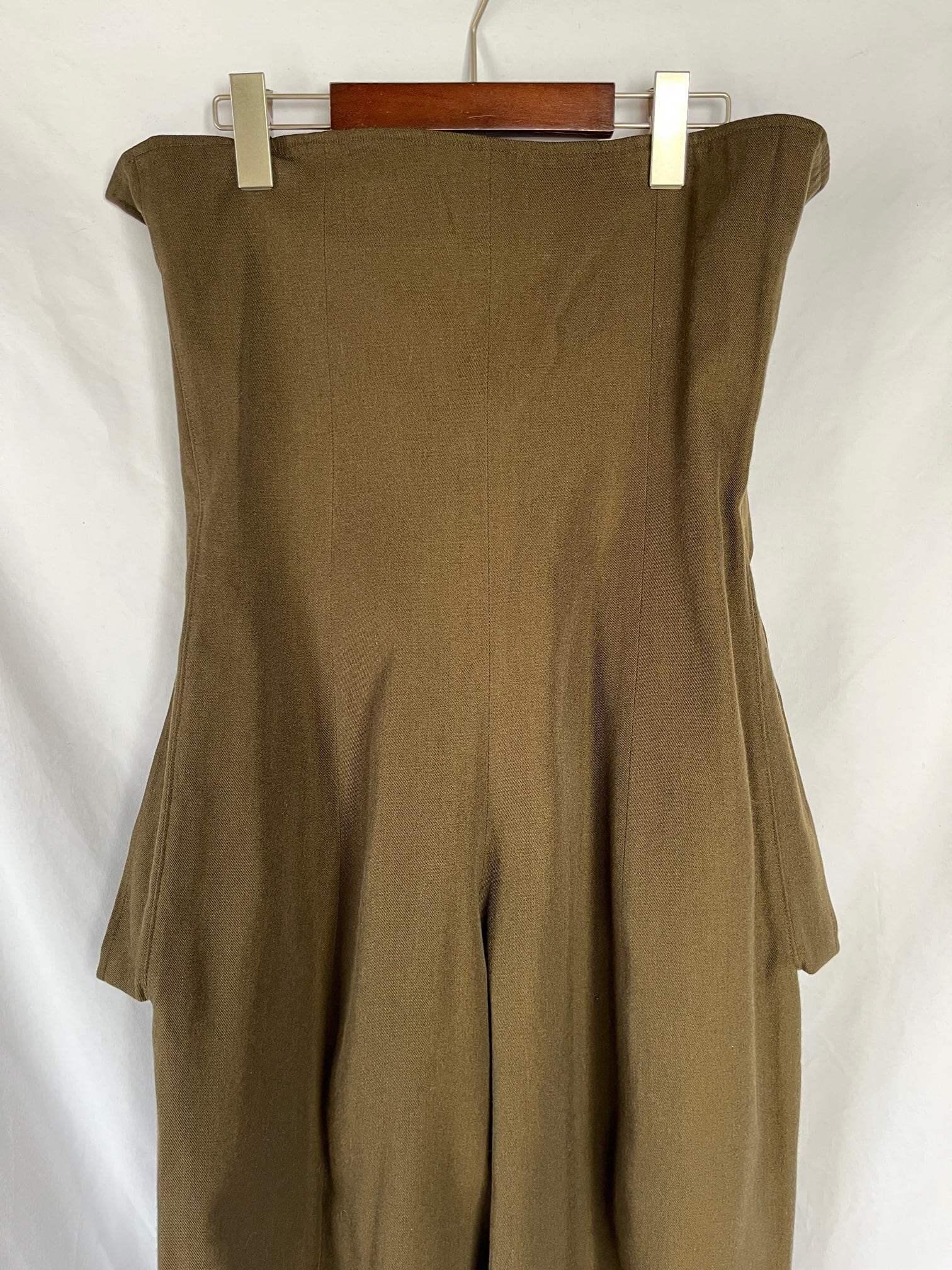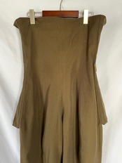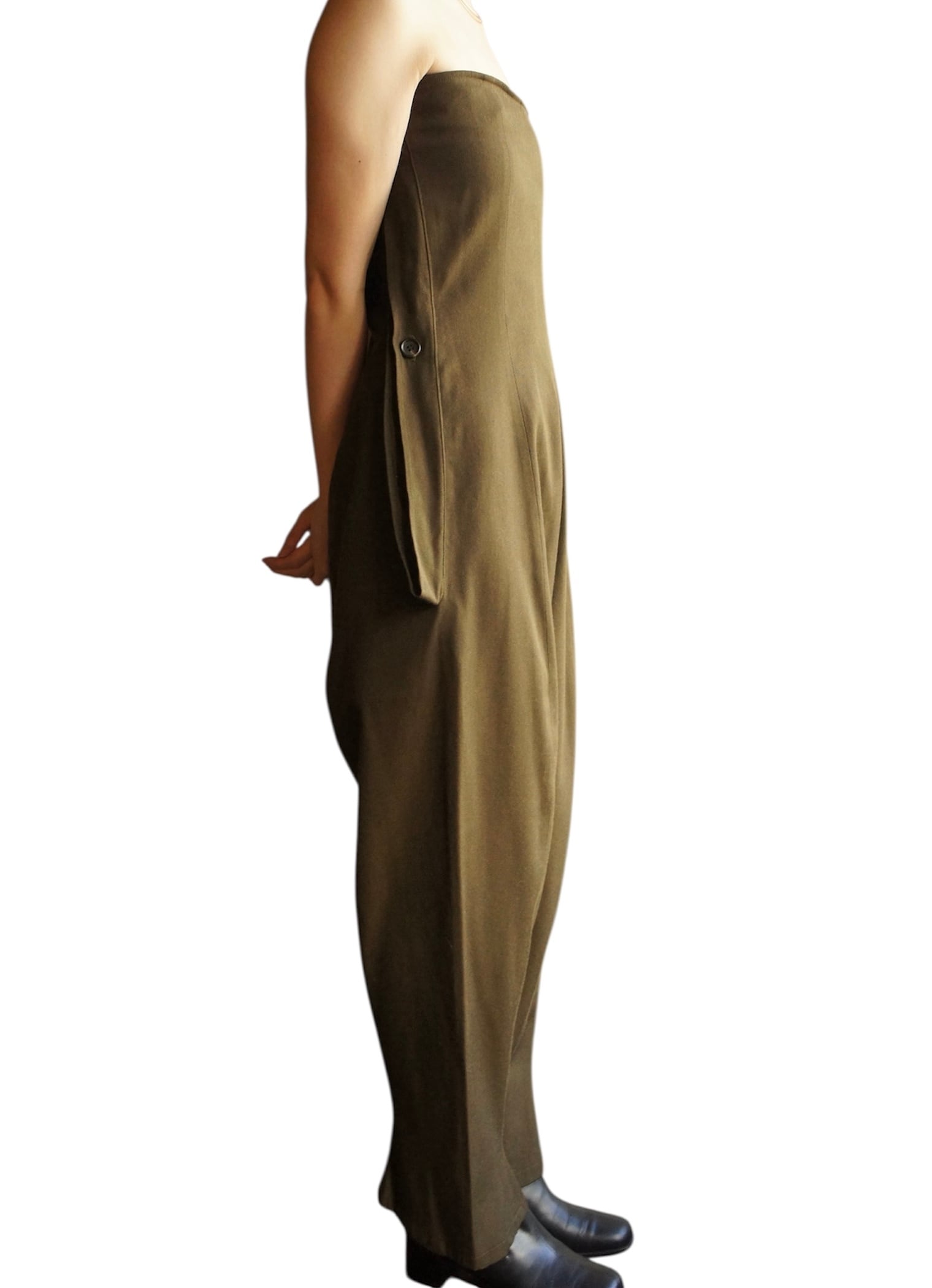 パンツはベアトップサロペットパンツになっていて、胸元まで上がるデザイン。 サイドのボタンがワーク感もあり、裾もさりげなく足首がシェイプされて広がるライン、カジュアルとモードの融合が絶妙な一着です。