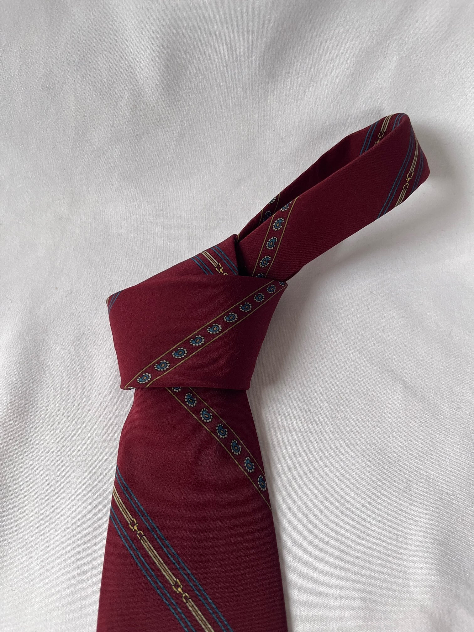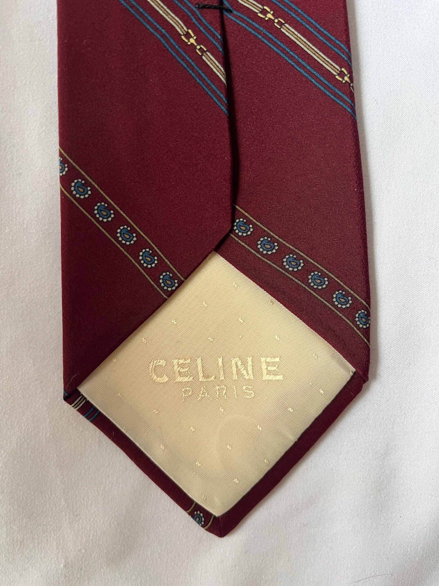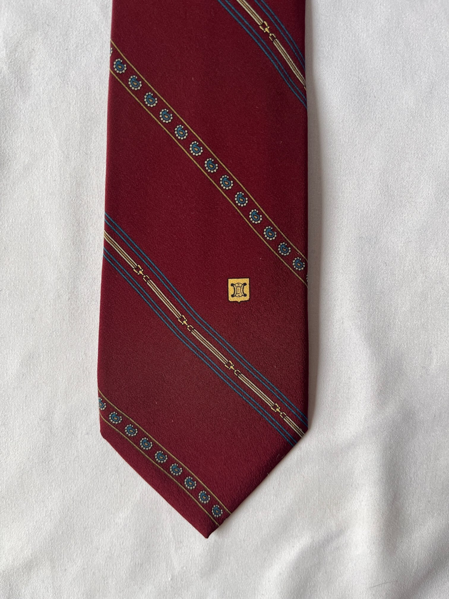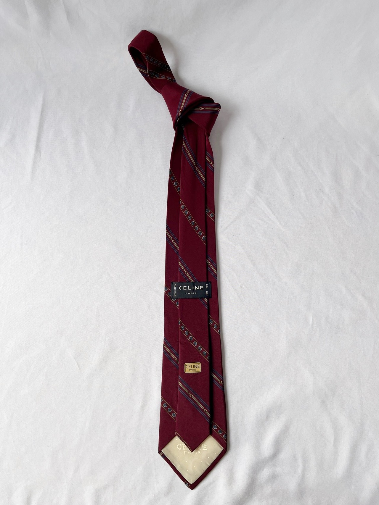 ボルドーベースにブルーのペイズリーラインがユニークなCELINE Vintageネクタイ。細いビットモチーフなどCELINEらしいエッセンスも魅力的な一品です。
