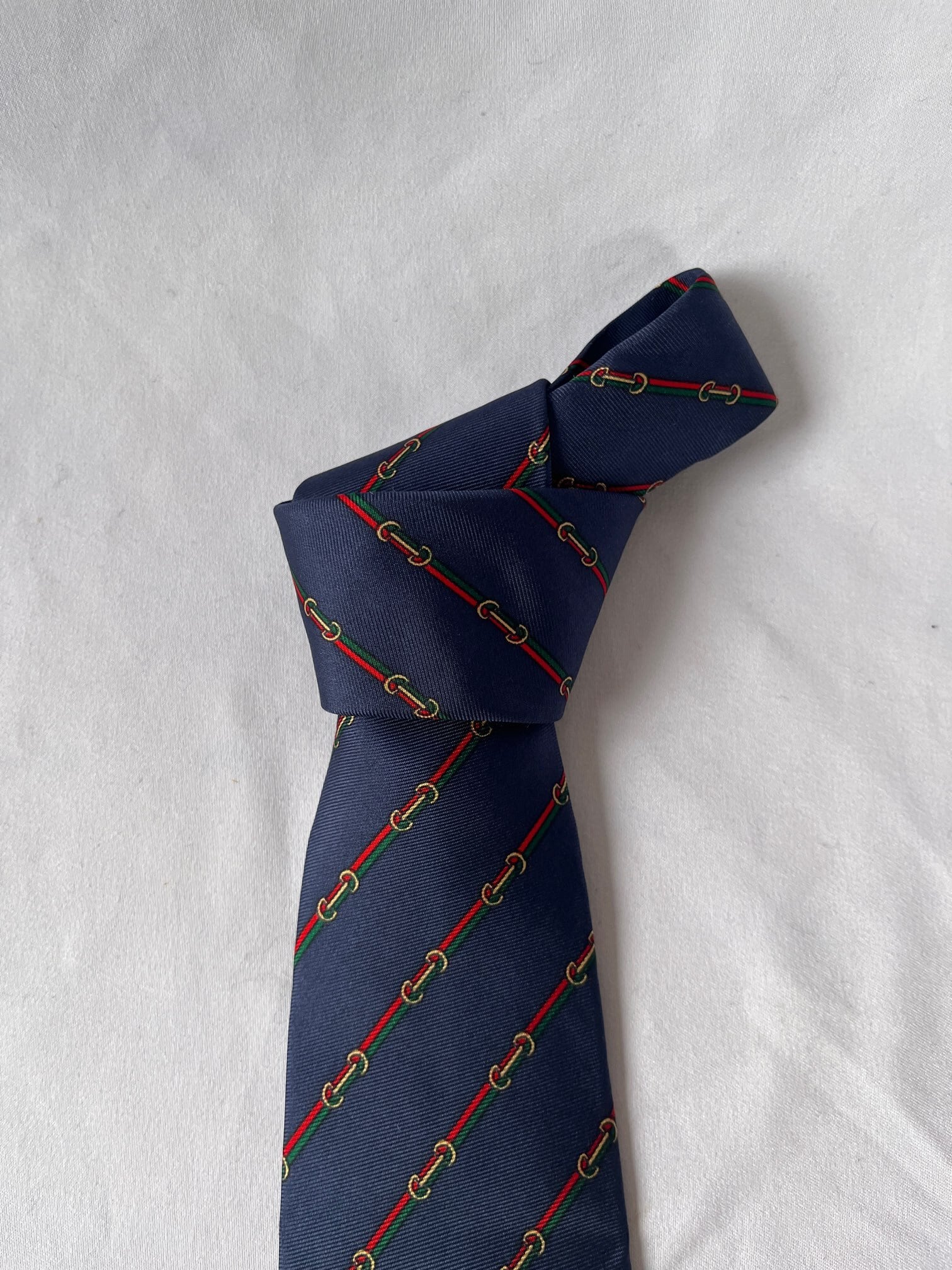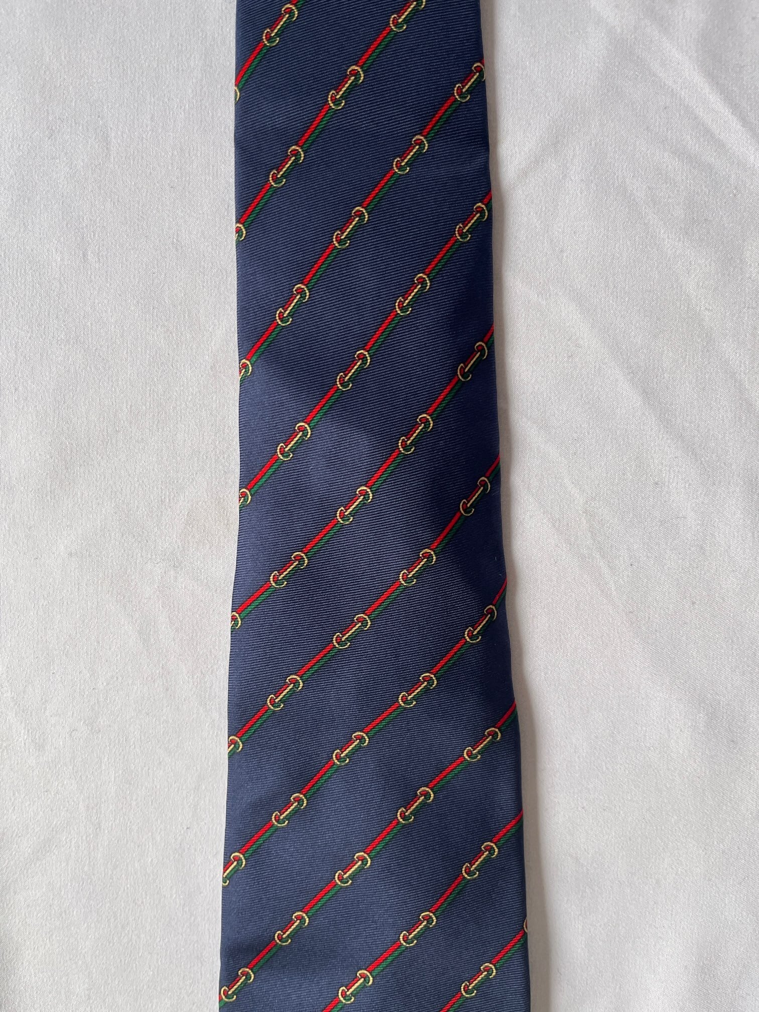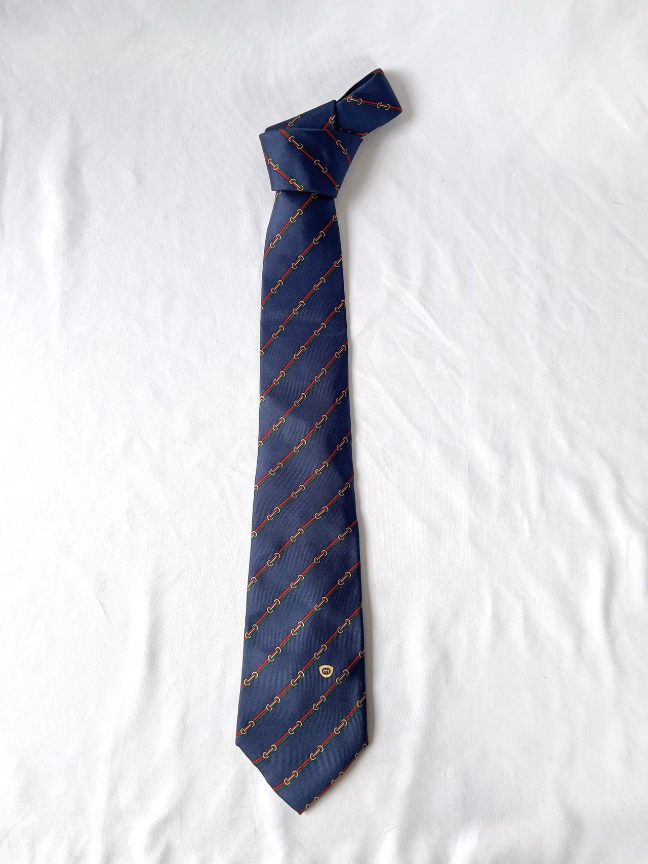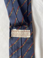 ネイビーベースにシェリーラインがGUCCIらしいVintageネクタイ。小さなビットモチーフもアクセントに効いた一品です。