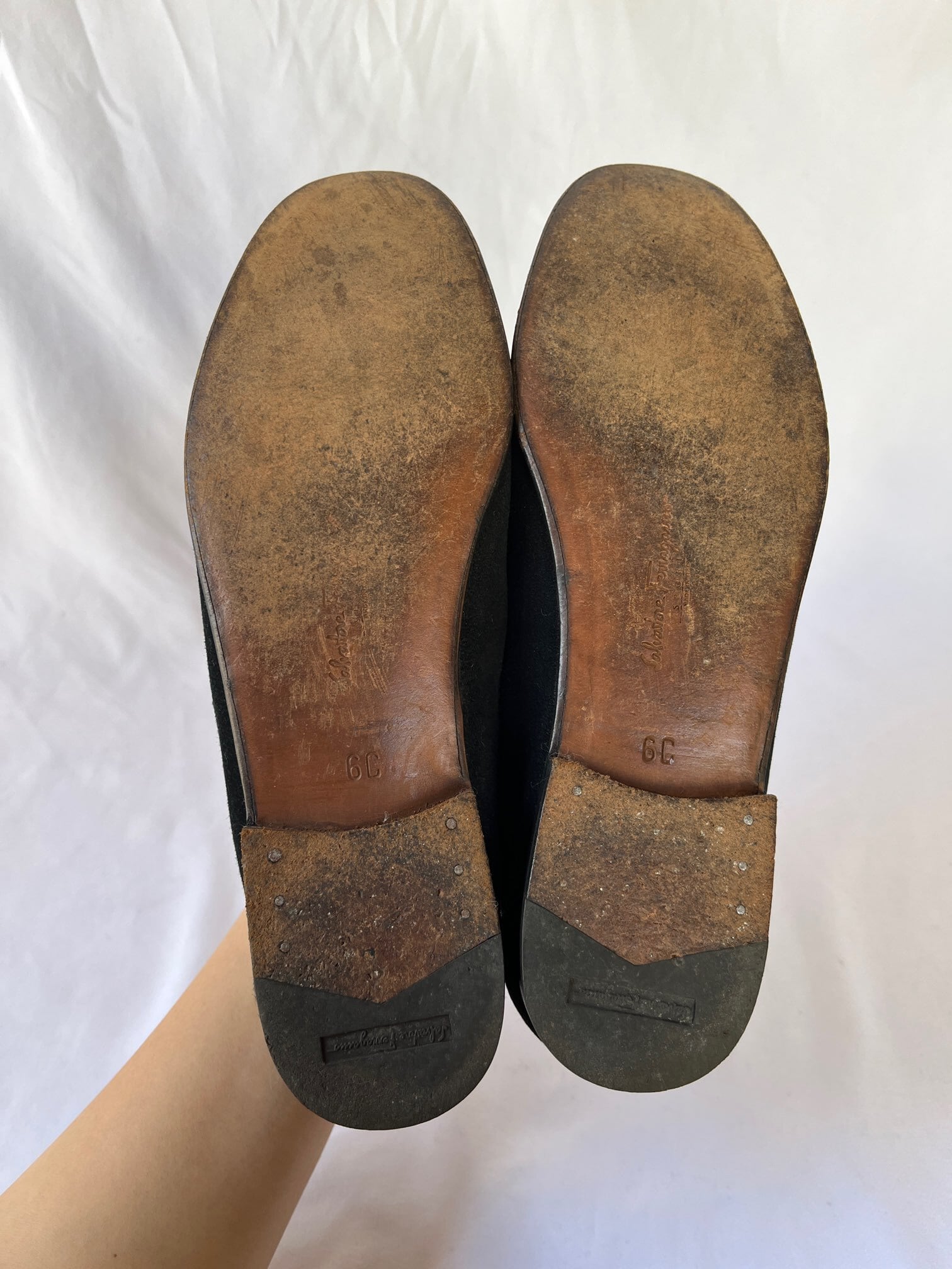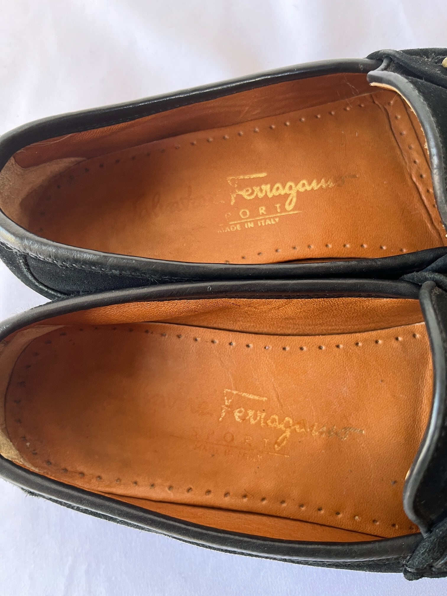 ブラックスエードにゴールドのガンチーニが極立つ Ferragamo のローファー。