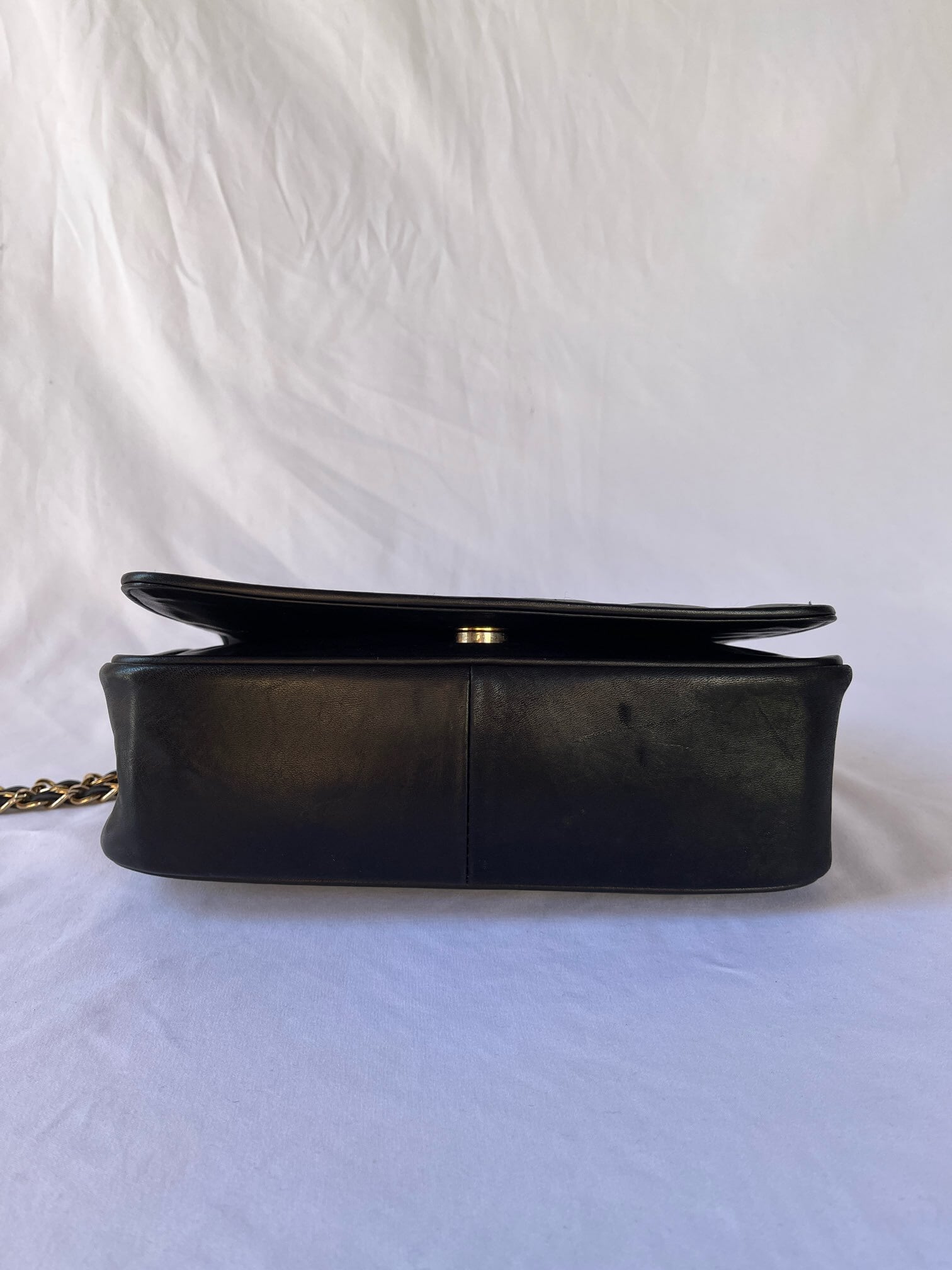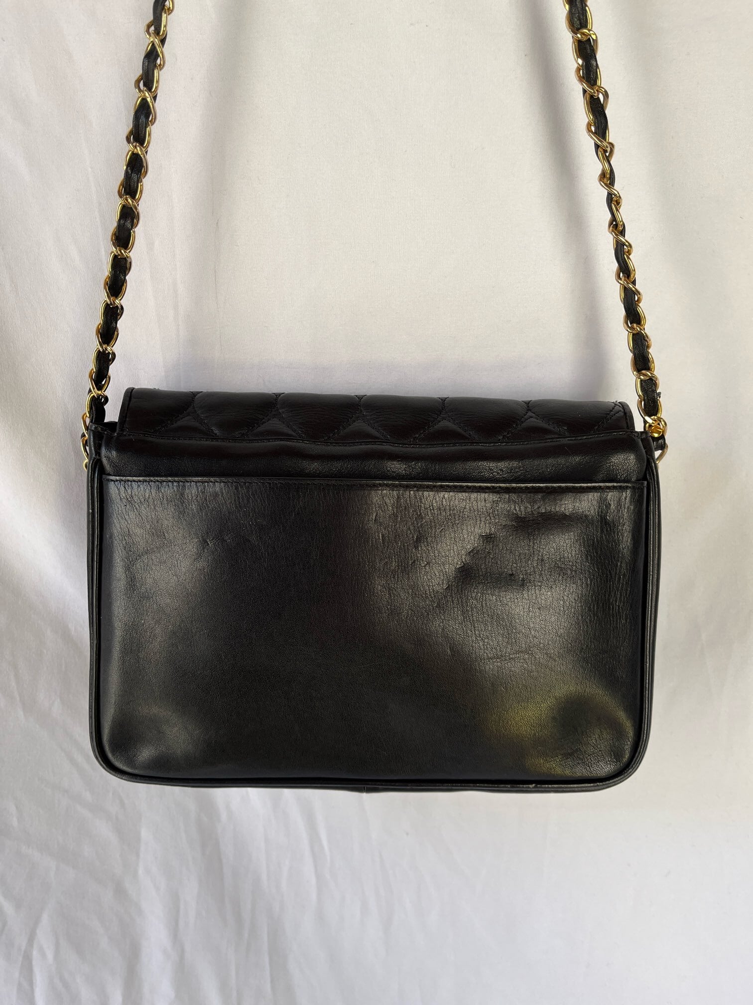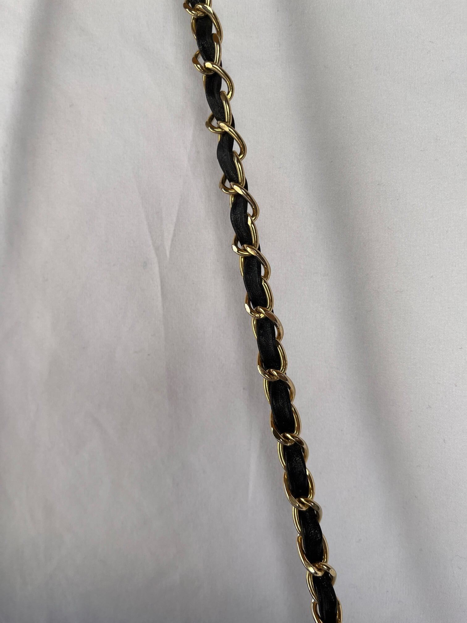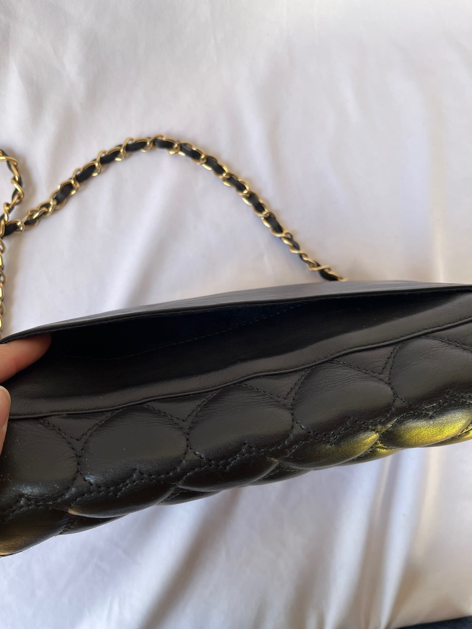ぷっくりと立体的な手触りがあたたかい印象。ブラックレザー×ゴールドメタルのチェーンが華やかなアクセントに。