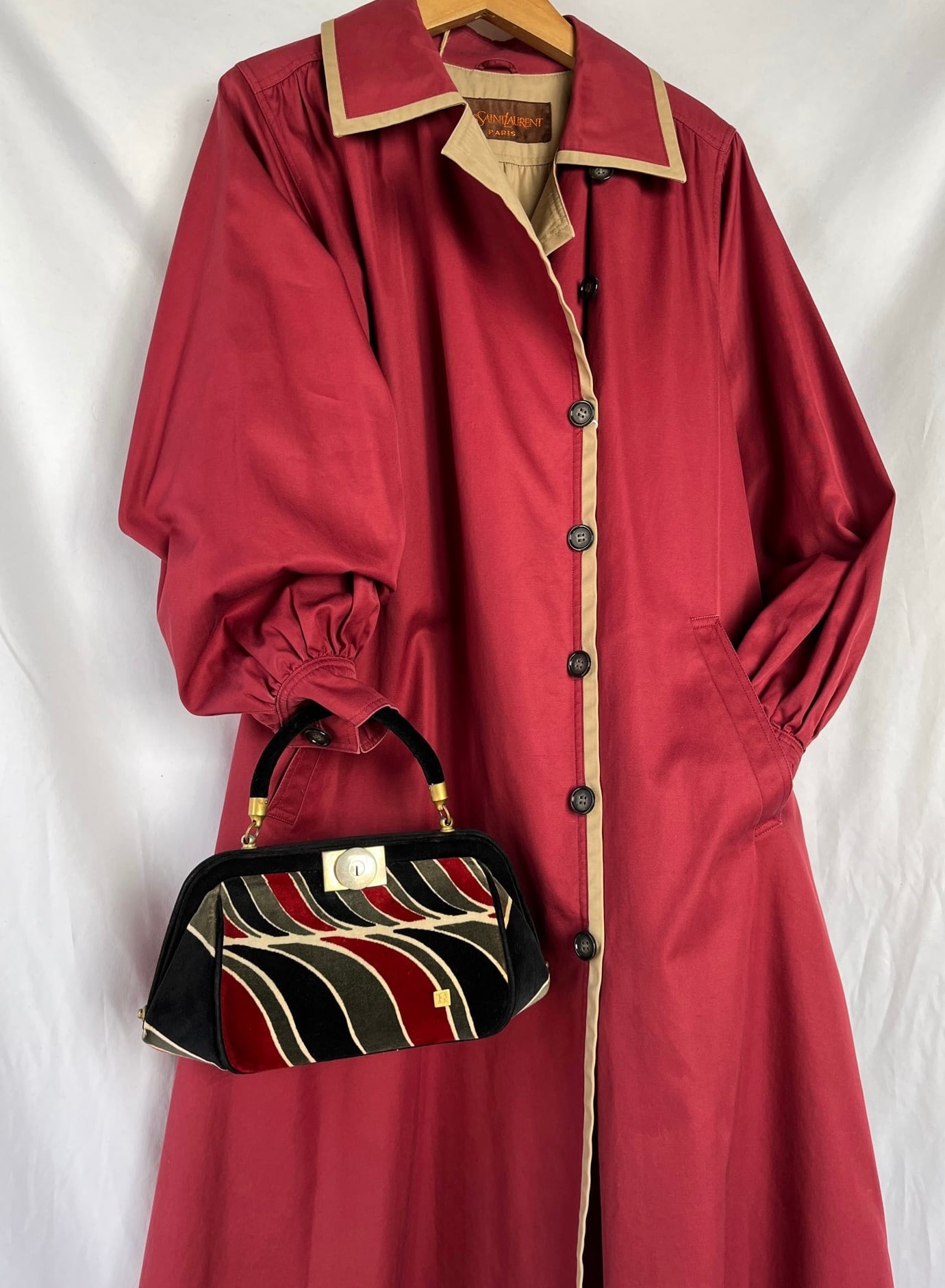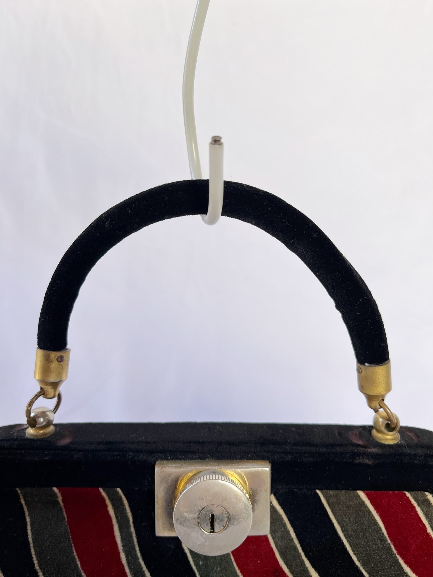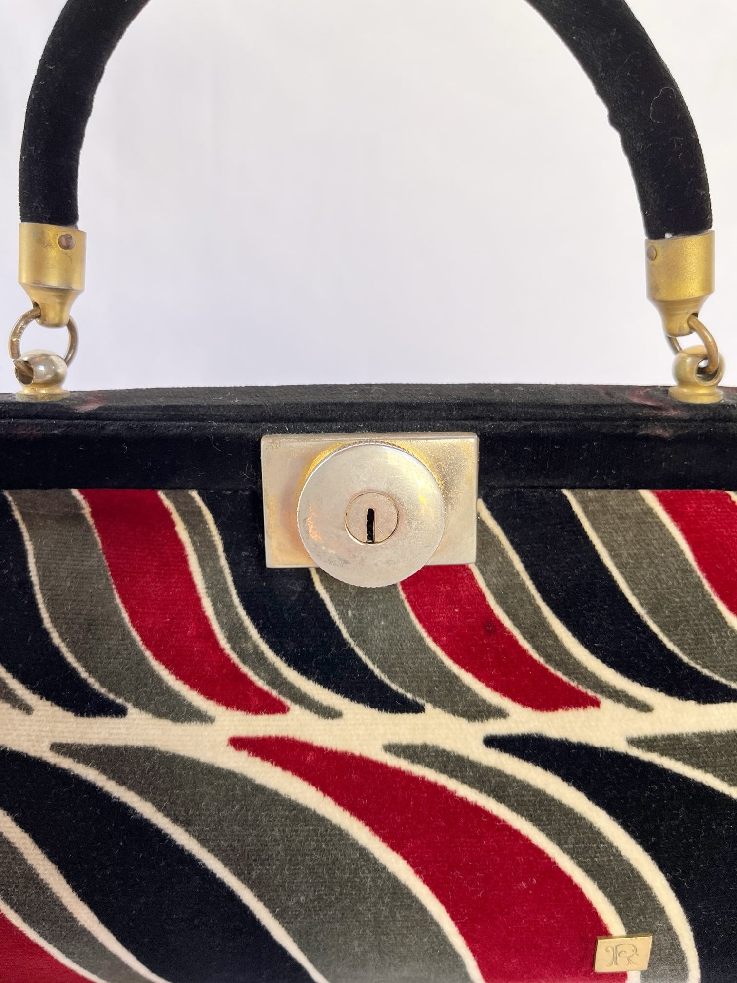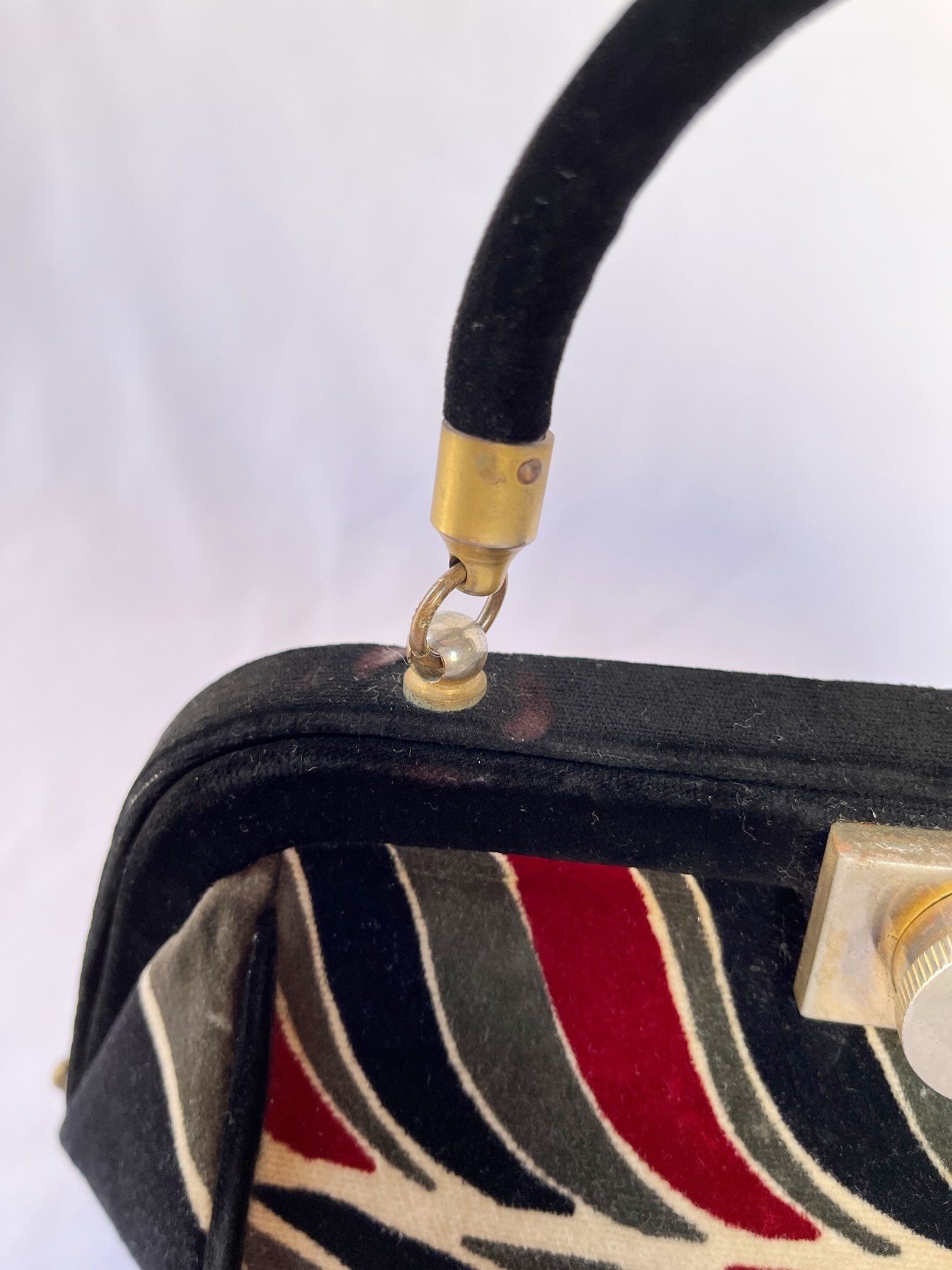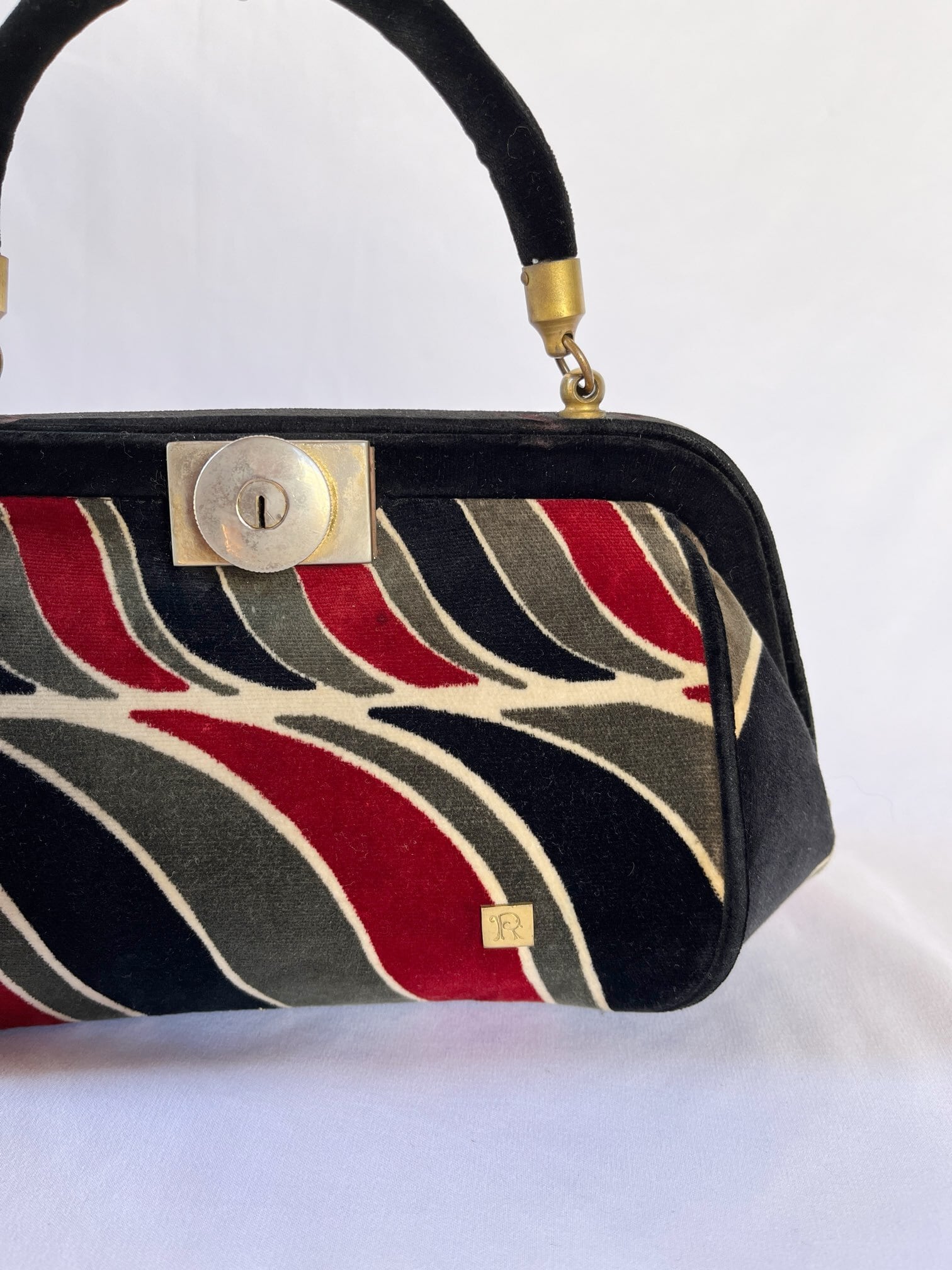 ベルベット地がRobertaらしい80's vintageハンドBag。ブラック地に赤とカーキの波打ちデザインなモードな一品。