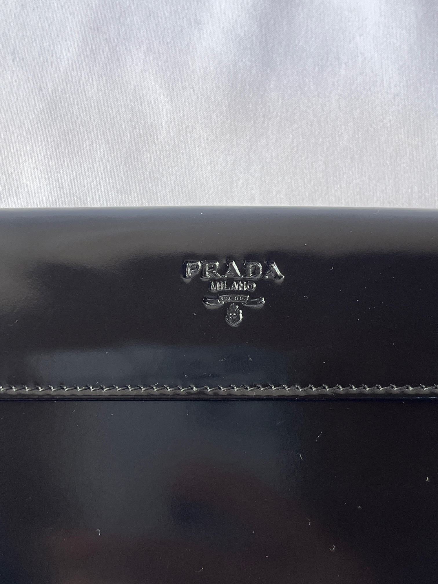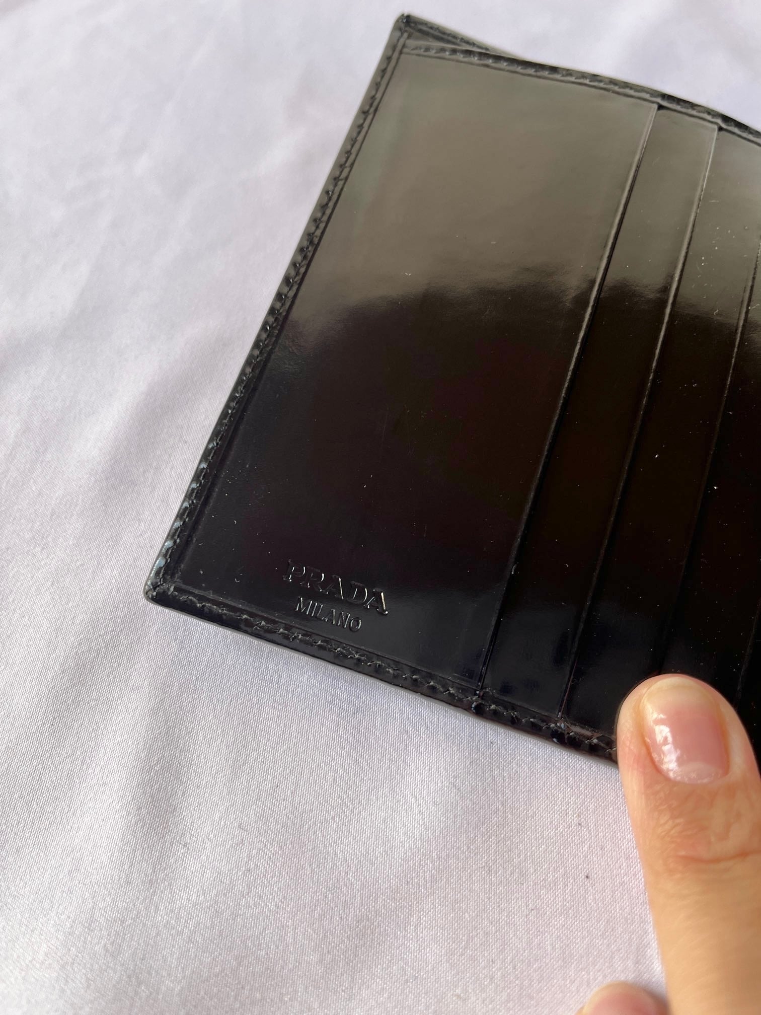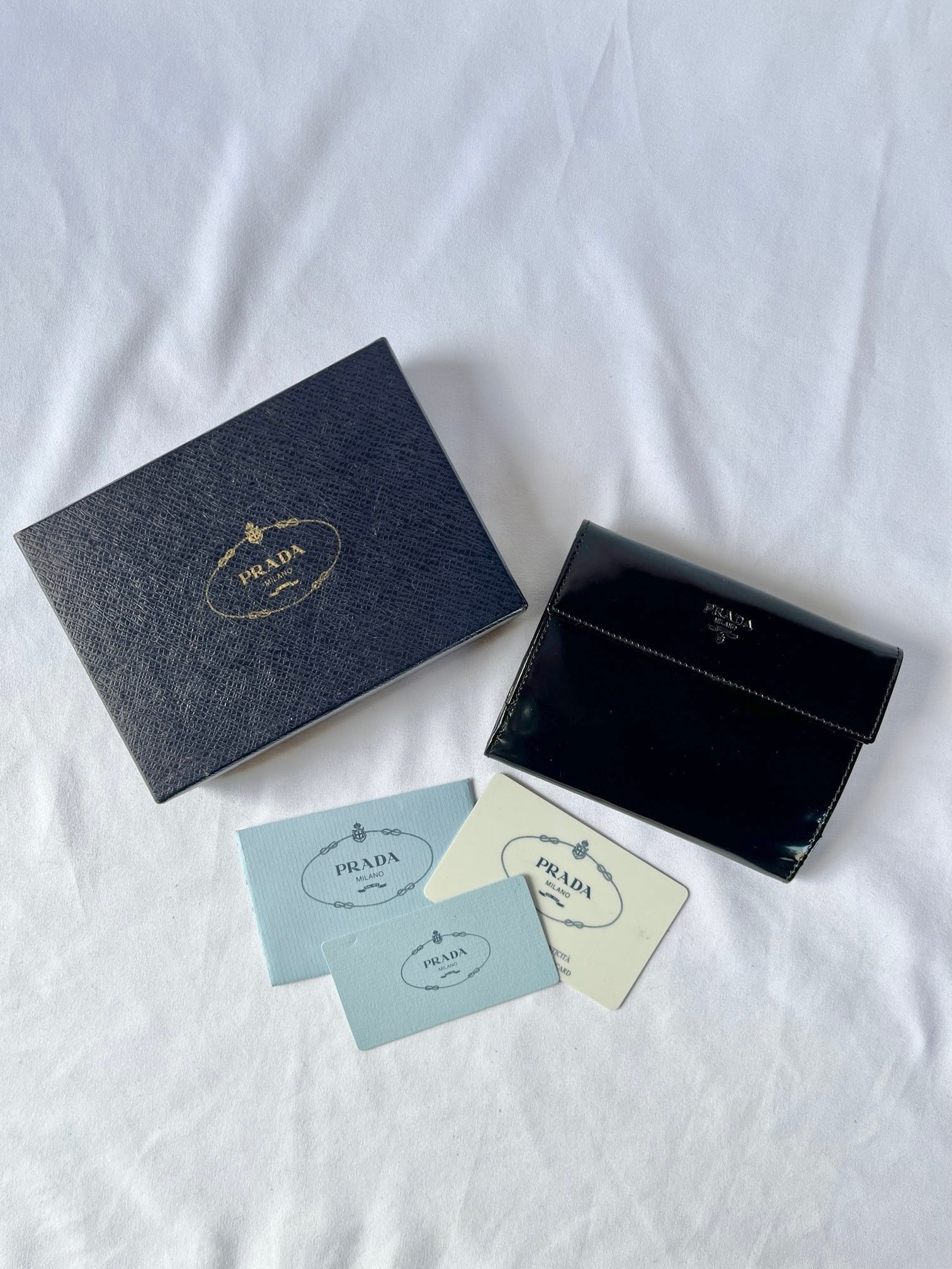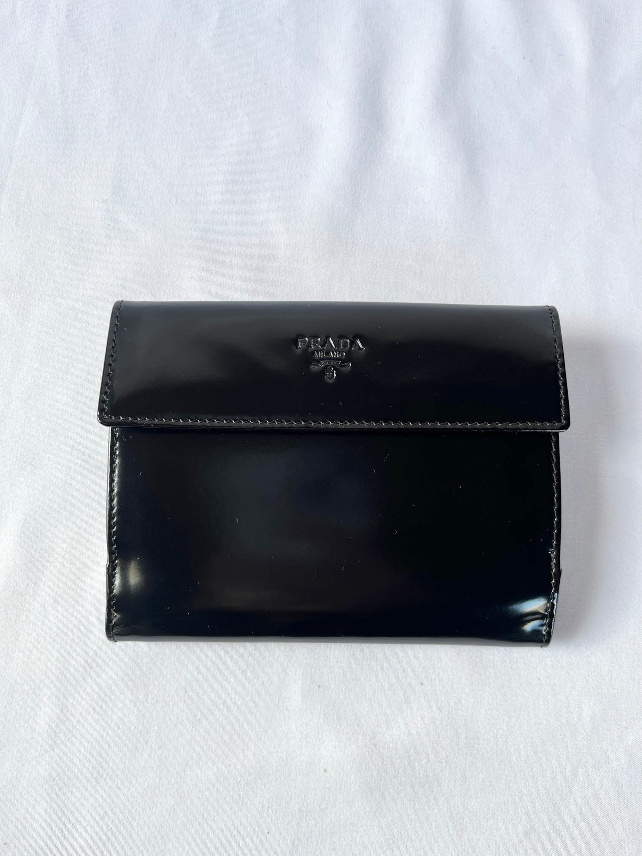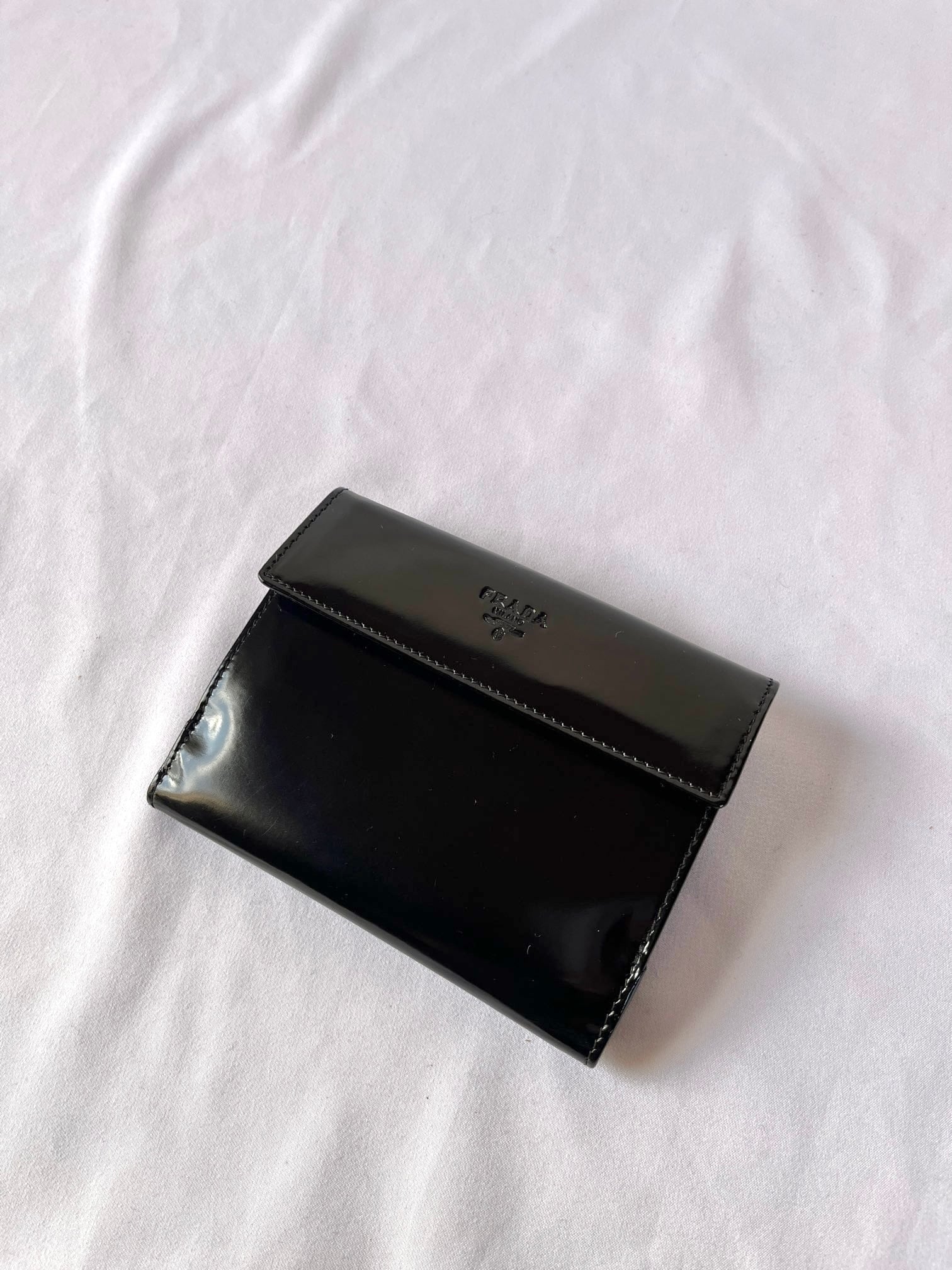 ブラックのエナメル地がスタイリッシュなPRADAのおりたたみ財布。