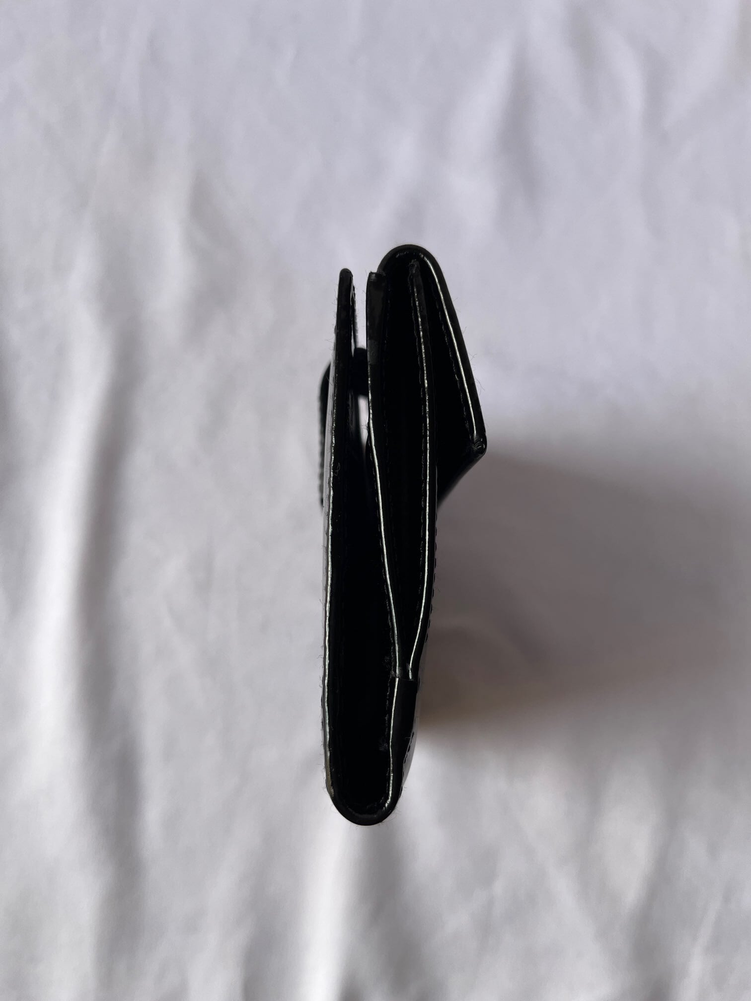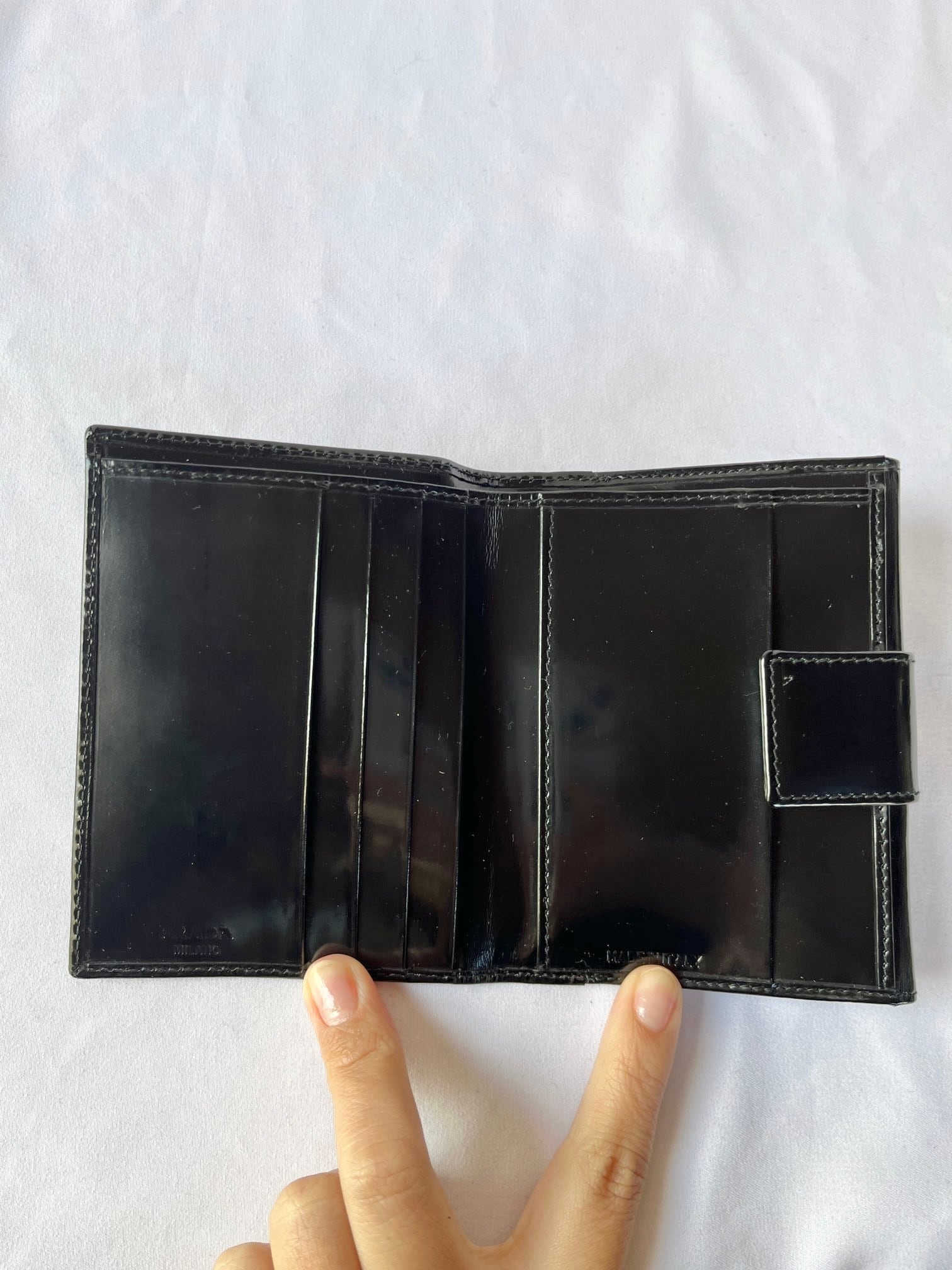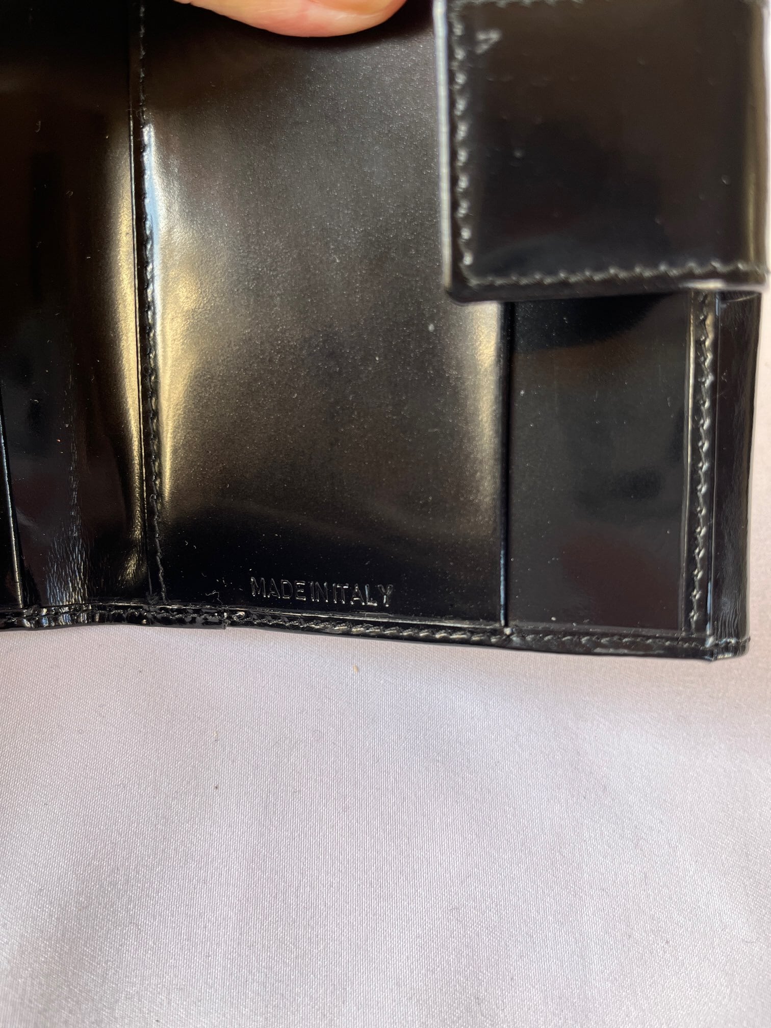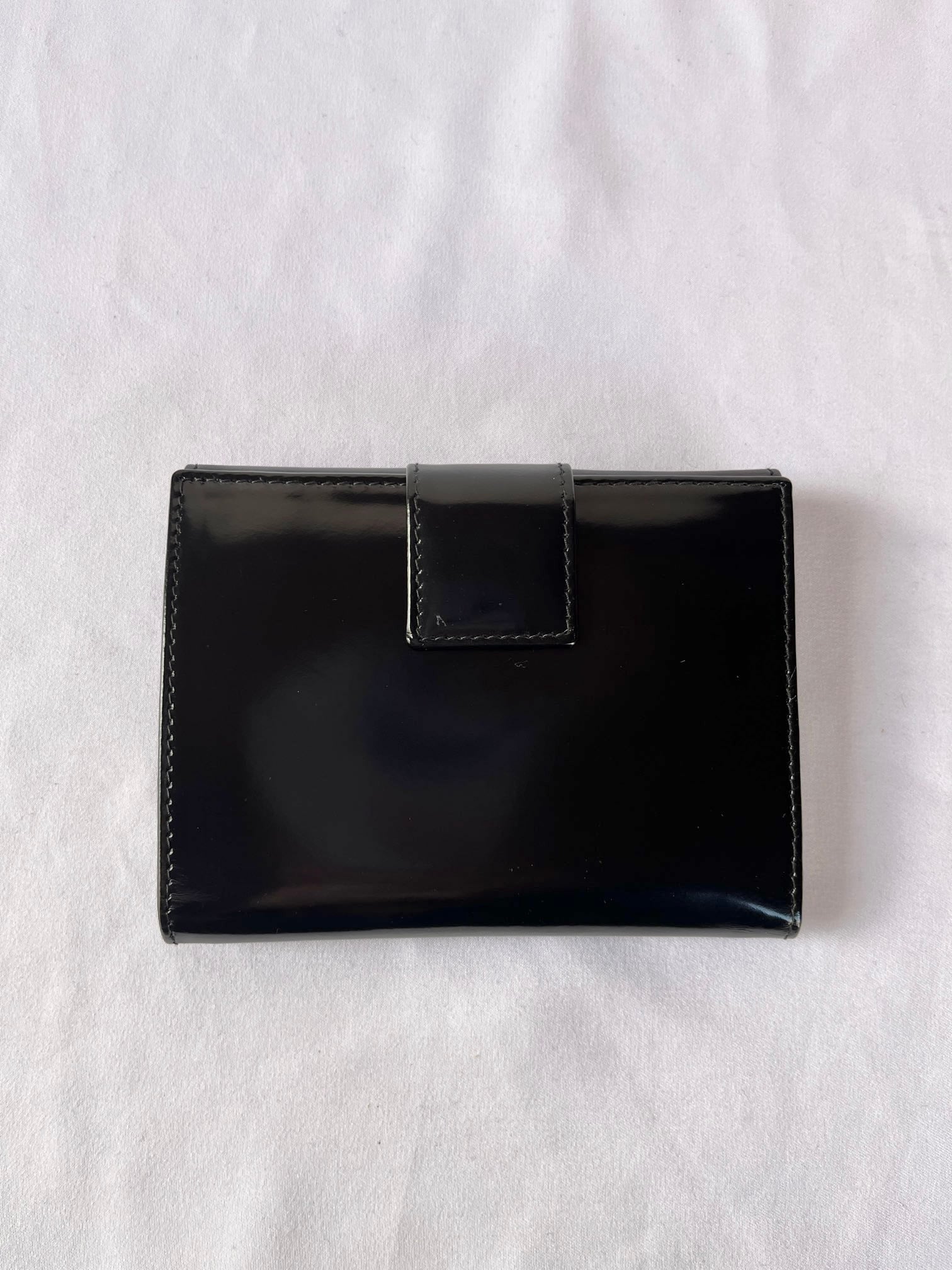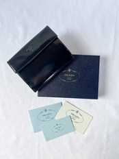 ブラックのエナメル地がスタイリッシュなPRADAのおりたたみ財布。