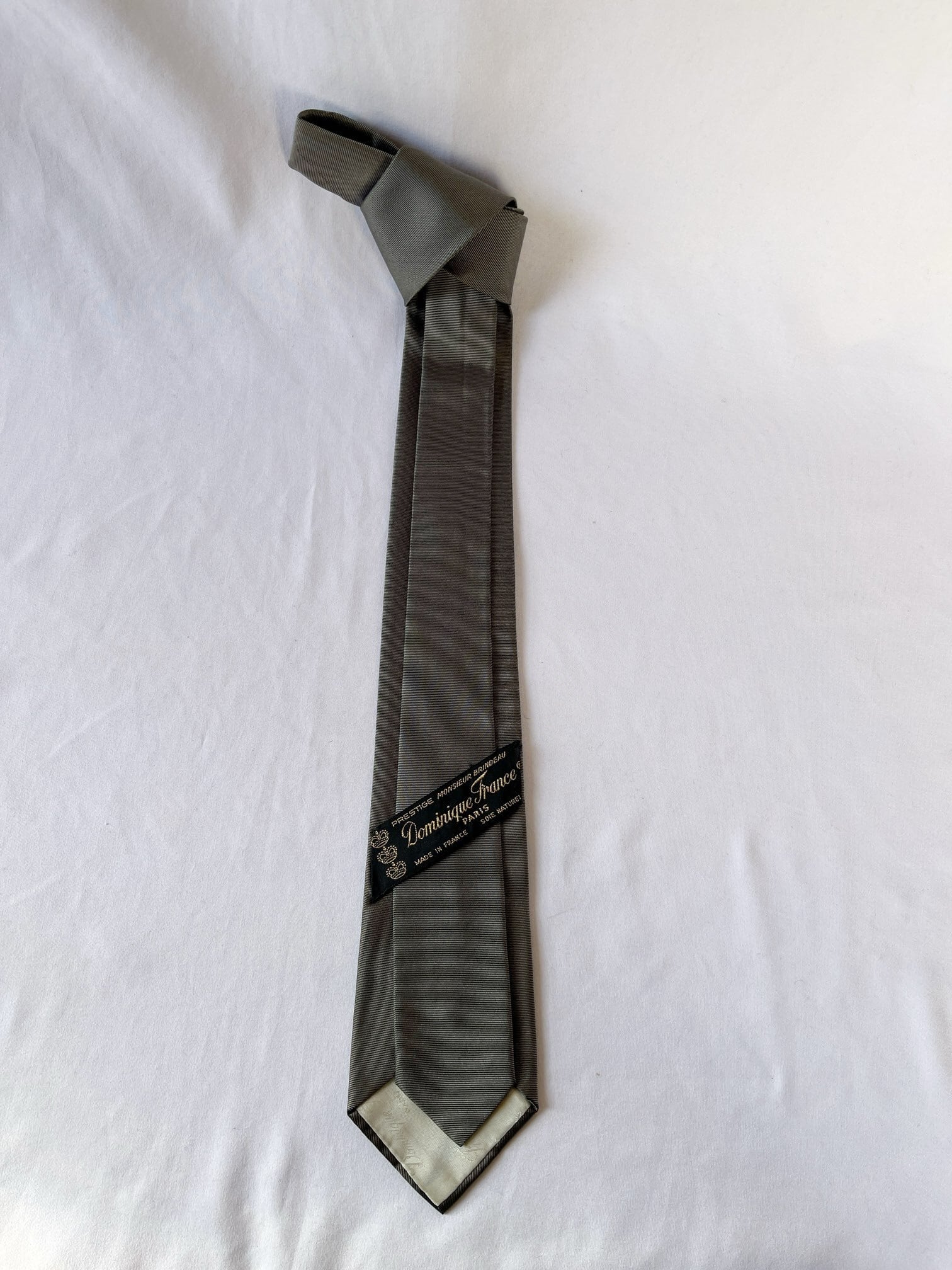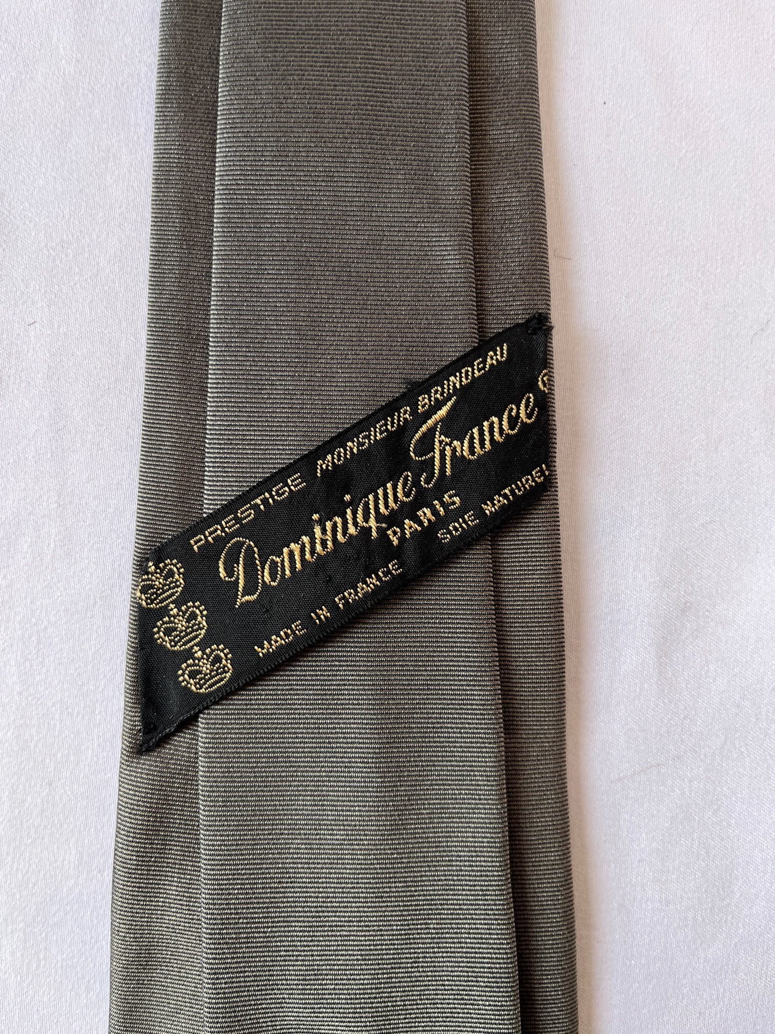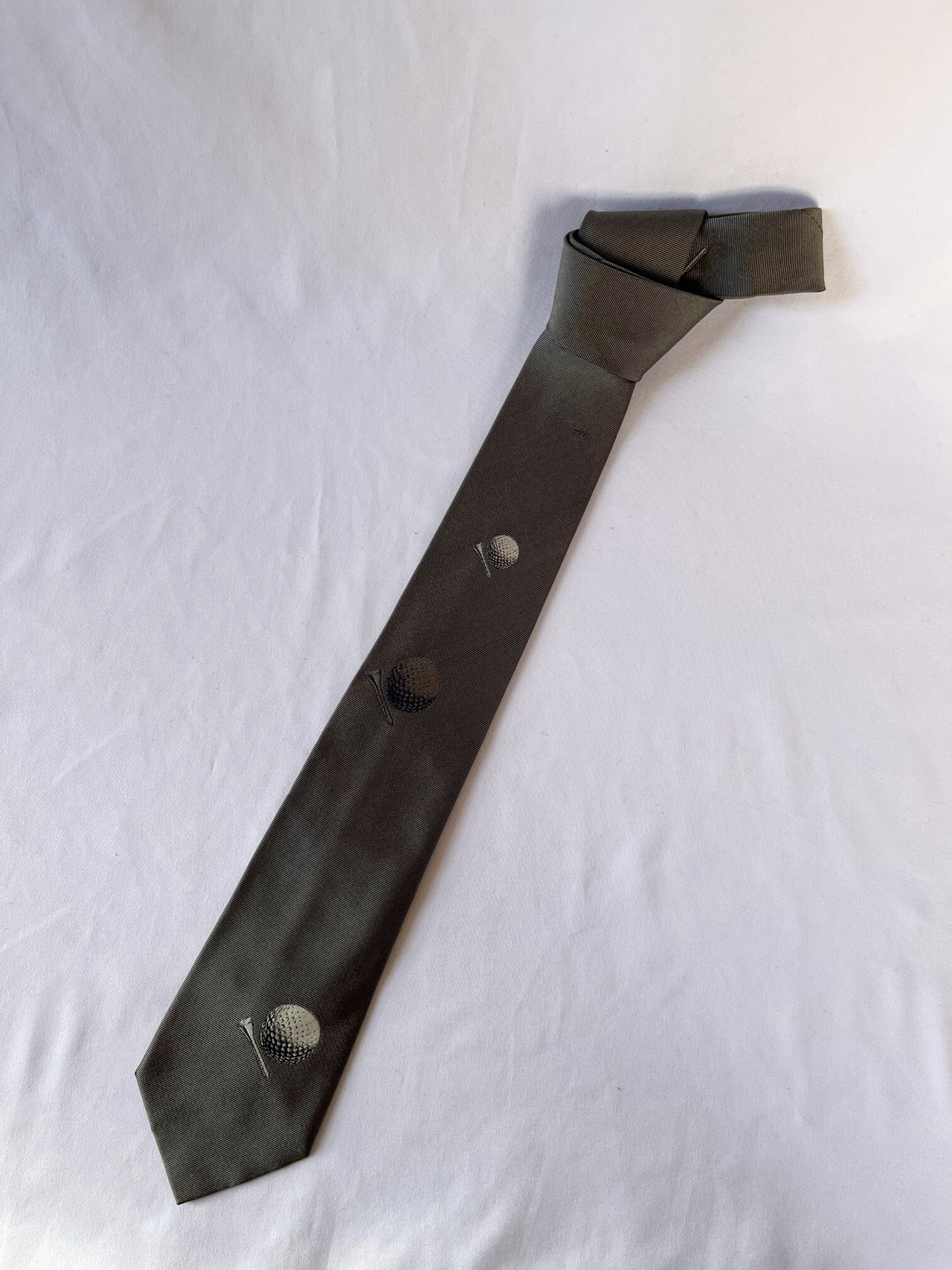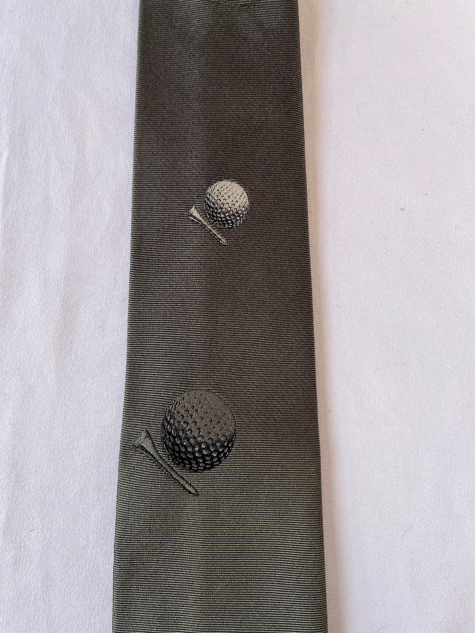 パリの老舗ネクタイメーカー「ドミニクフランス」の Vintage ネクタイ。通常の絹の3倍近い密度を持つヘビーシルクを使用した最高級品質。グレー地にゴルフボールとピンのモチーフが紳士的な一品です。