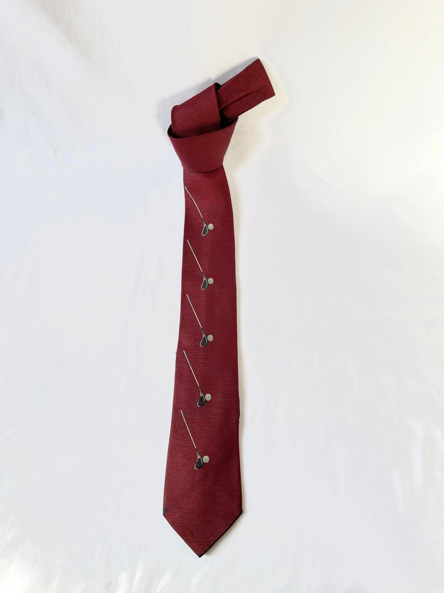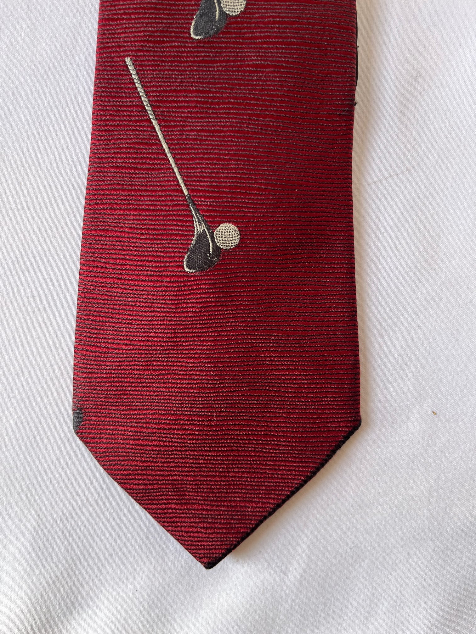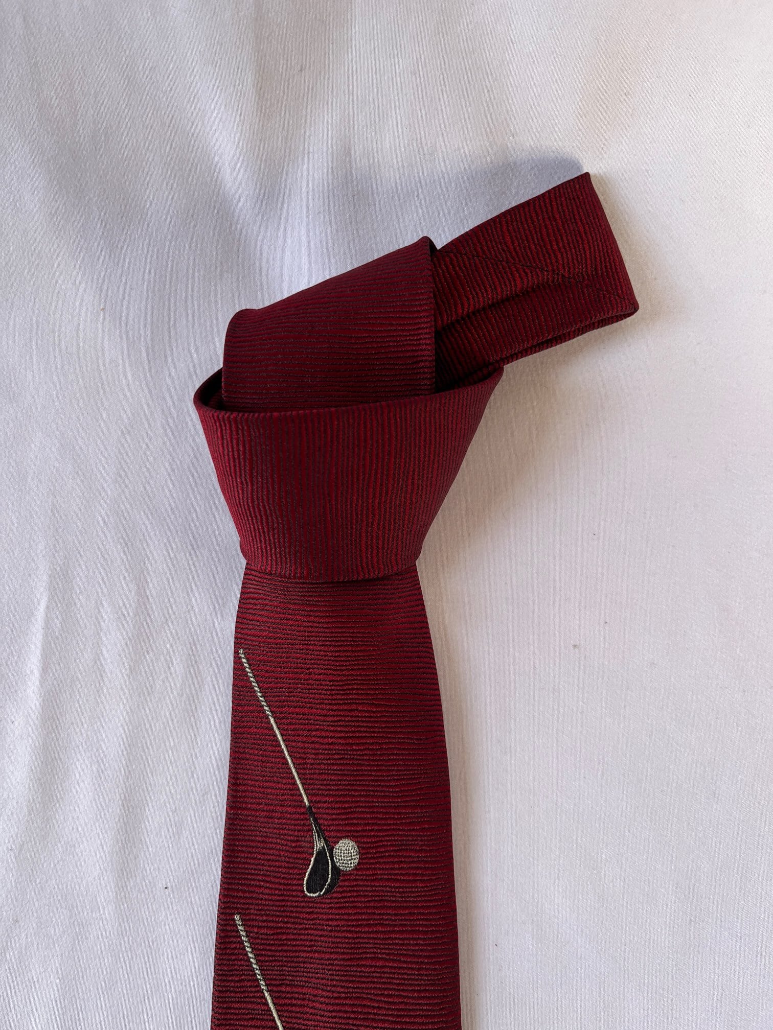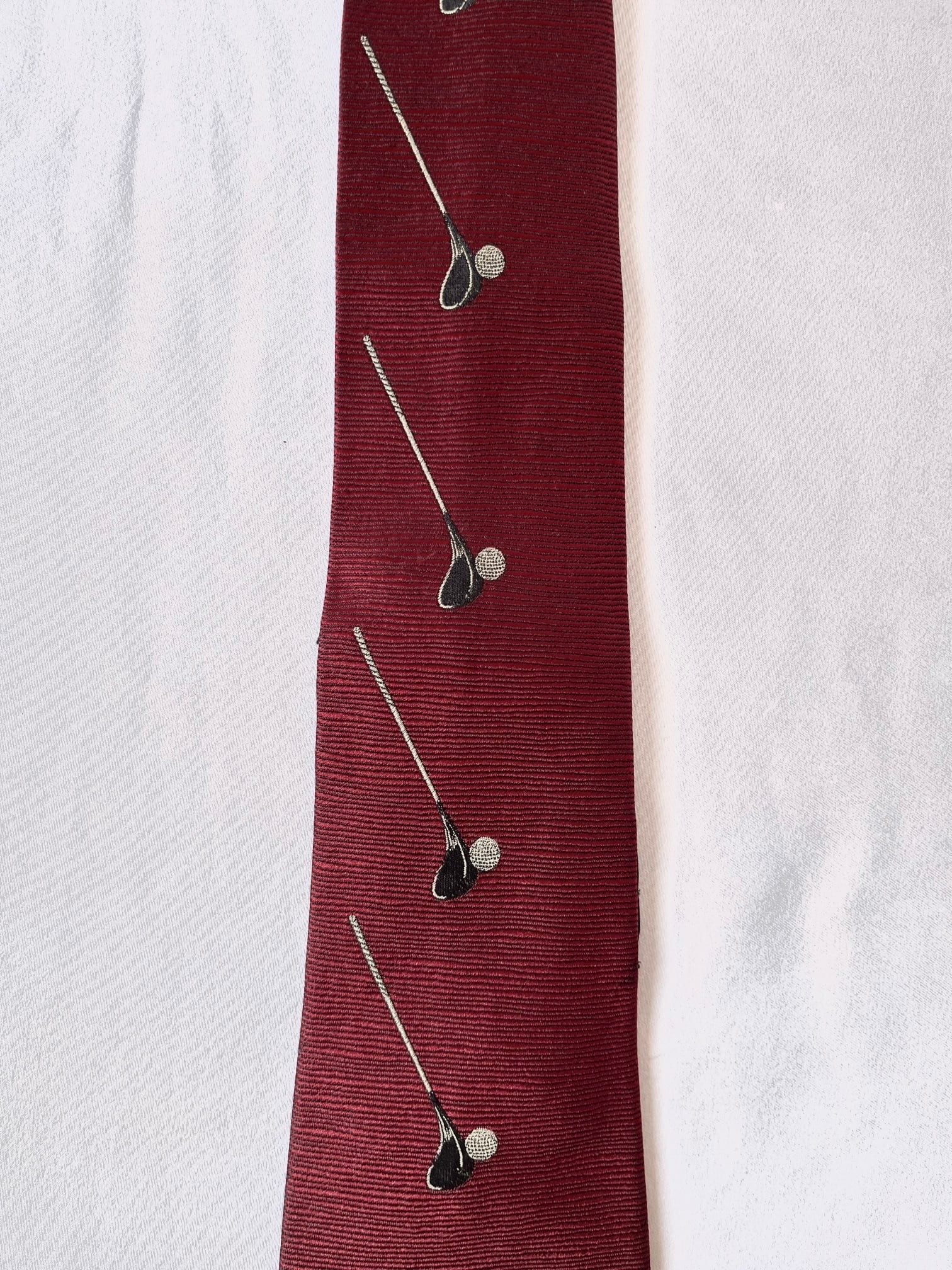 パリの老舗ネクタイメーカー「ドミニクフランス」の Vintage ネクタイ。通常の絹の3倍近い密度を持つヘビーシルクを使用した最高級品質。ボルドー地にゴルフパットとボールが遊び心のあるデザインです。