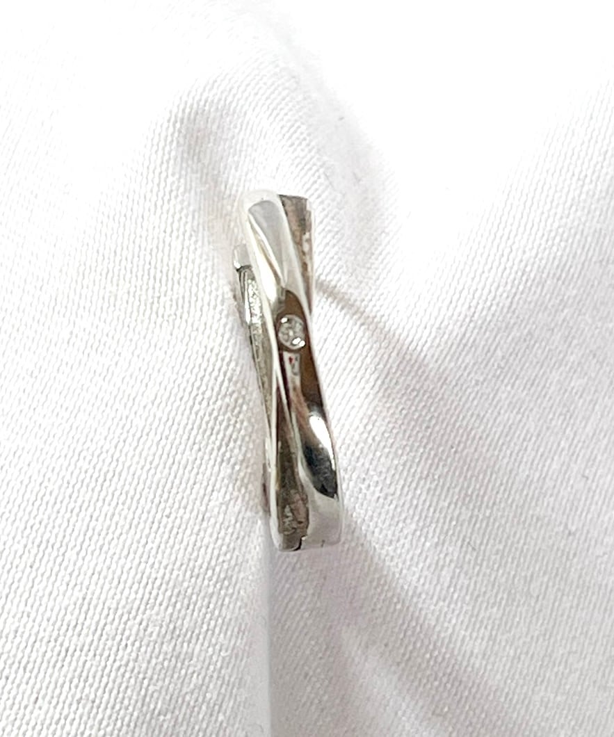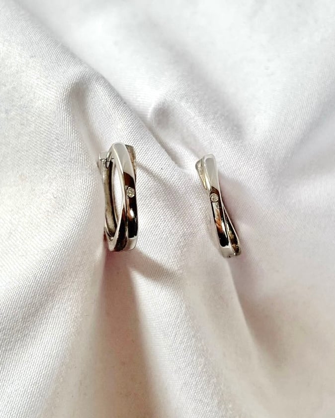 一粒のラインストーンがさりげなく光る Vintage Silver925 ピアス。よく見るとSilverのフープが交差していて、リングのようなデザインがユニークな一品です。