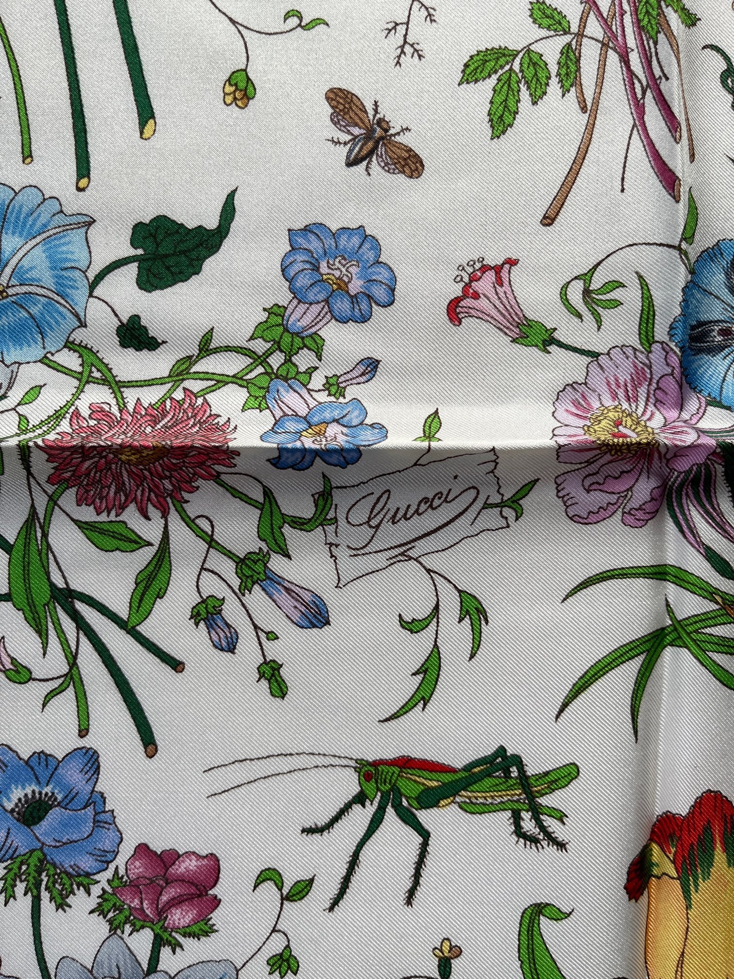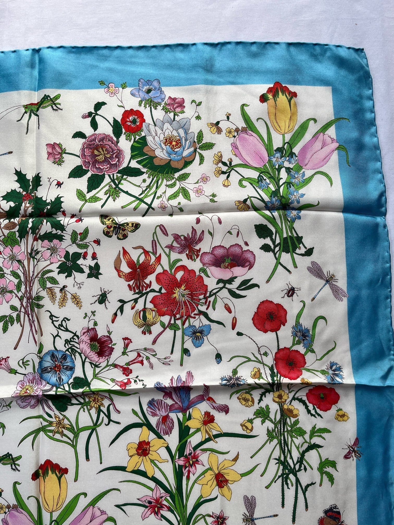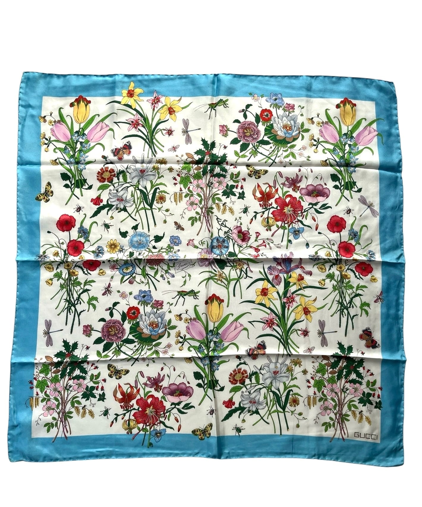 色とりどりの花々のモチーフが美しいGucel Vintage スカーフ。チューリップやユリに、蝶やトンボなど生き生き とくた絵柄が心躍るデザイン。程良い小ぶりなサイズが使い勝手の良い一枚です。Lt.Blueがさわやかなカラーリング!