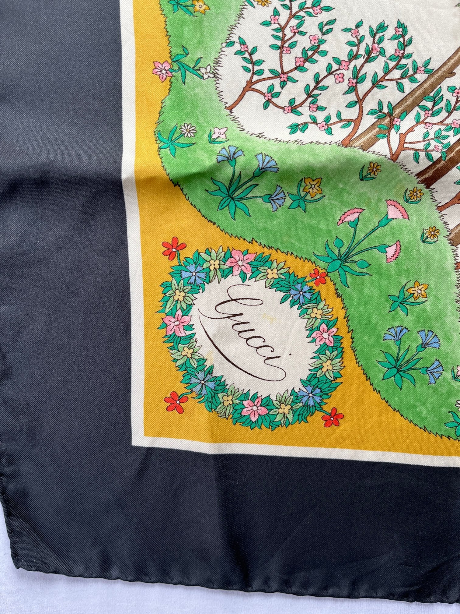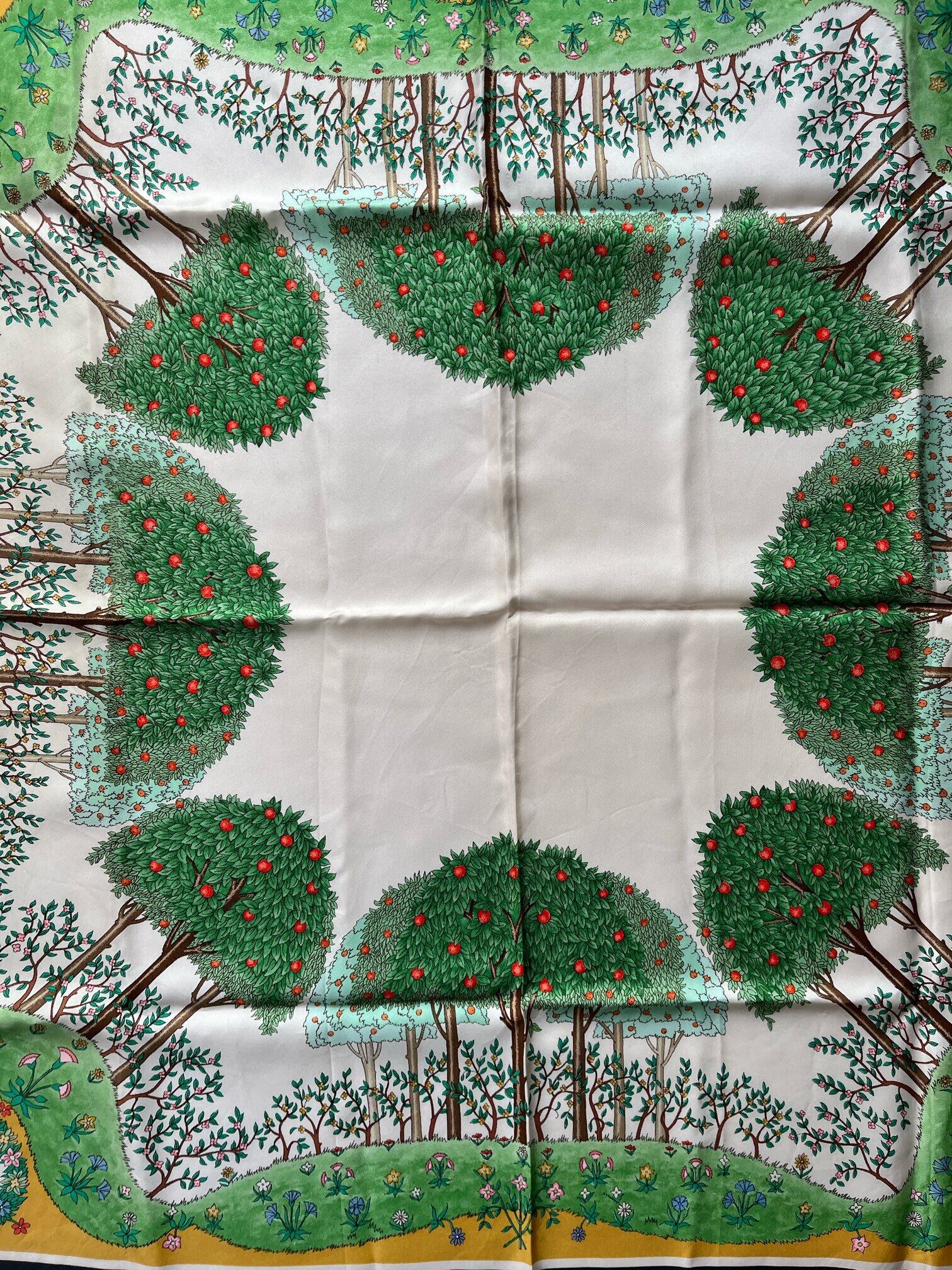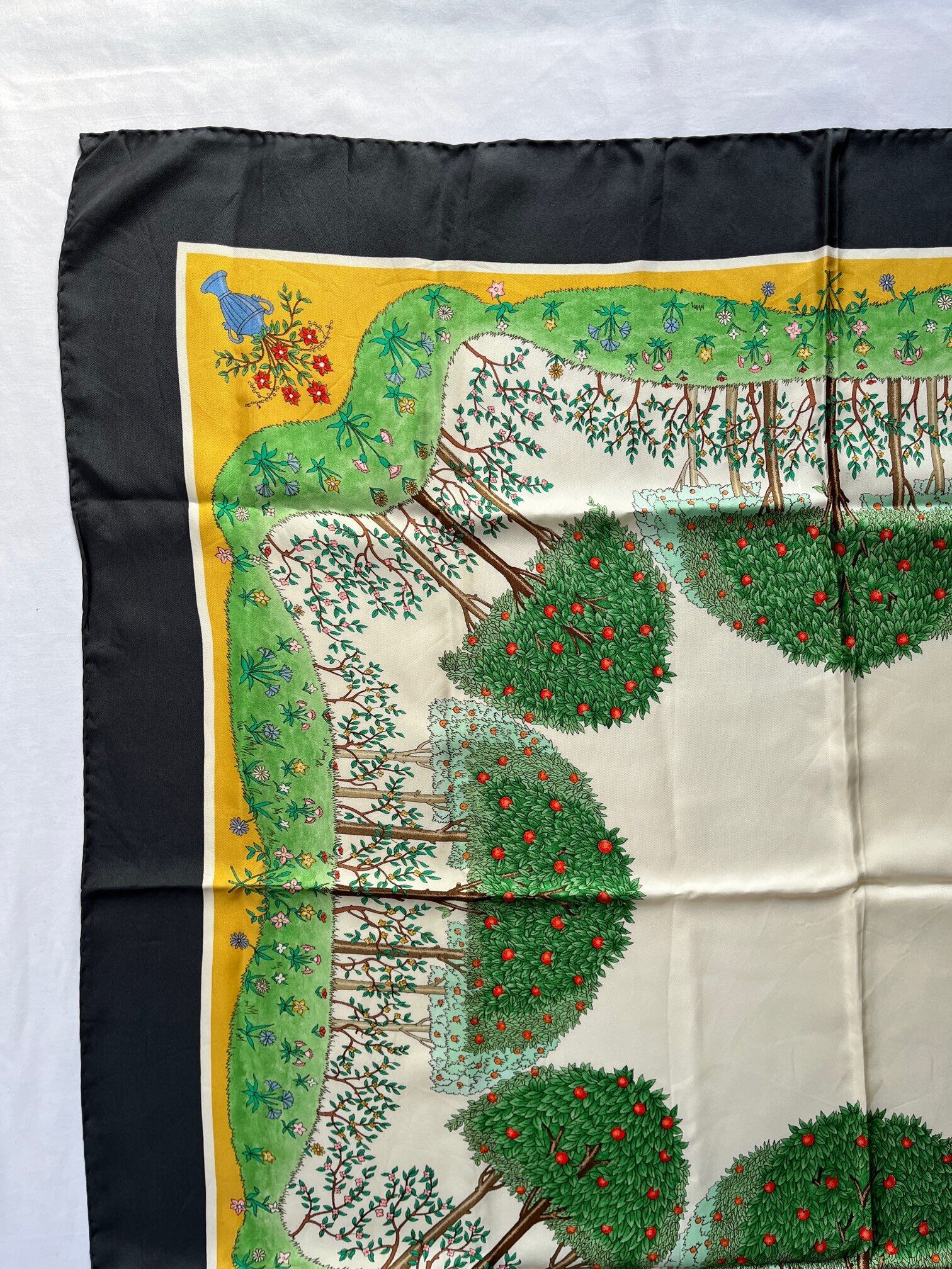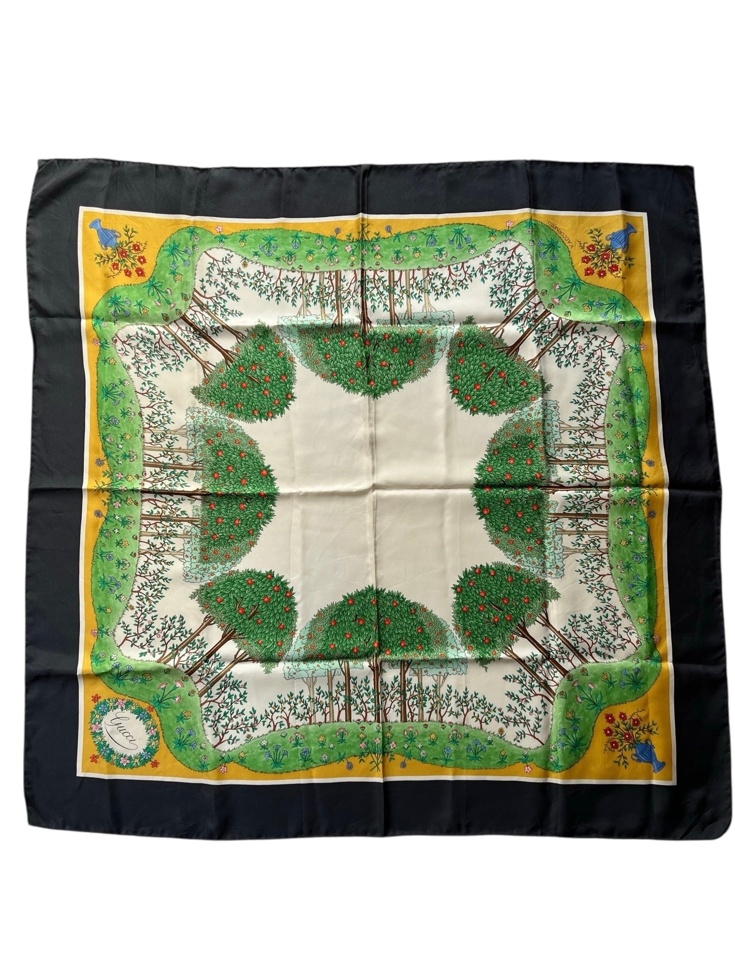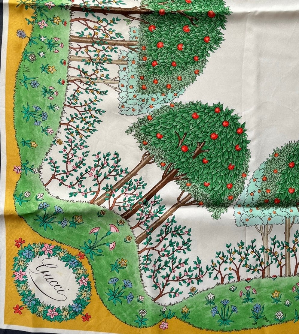 りんごの木のモチーフがユニークなGUCCI80's Vintage スカーフ。草原の色づけが手描きのようなタッチで あたたかい雰囲気が魅力的☆ Dk.greyの囲いがシックで抑揚のある一枚です。