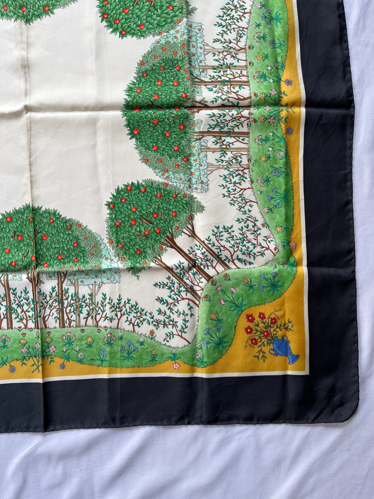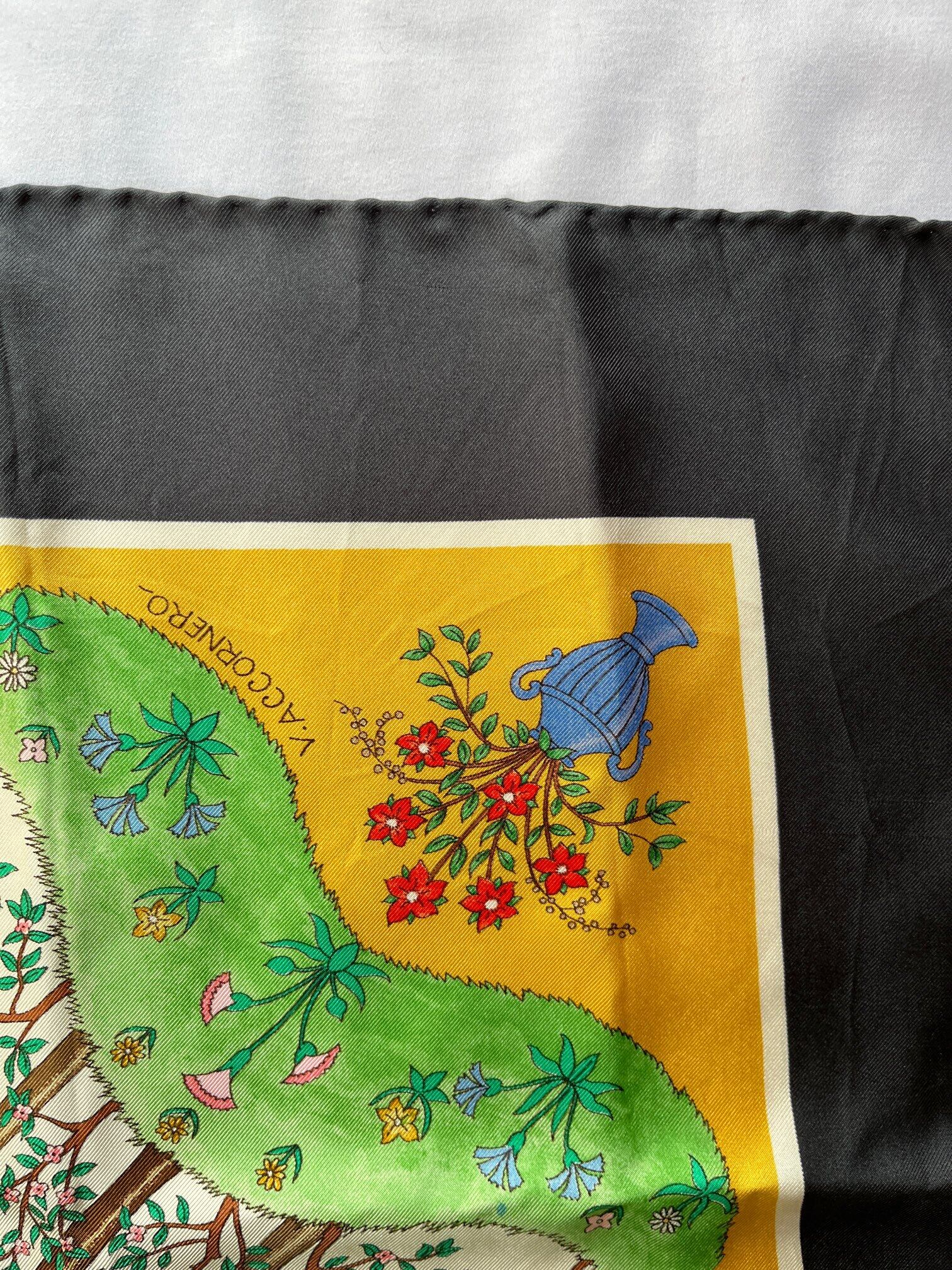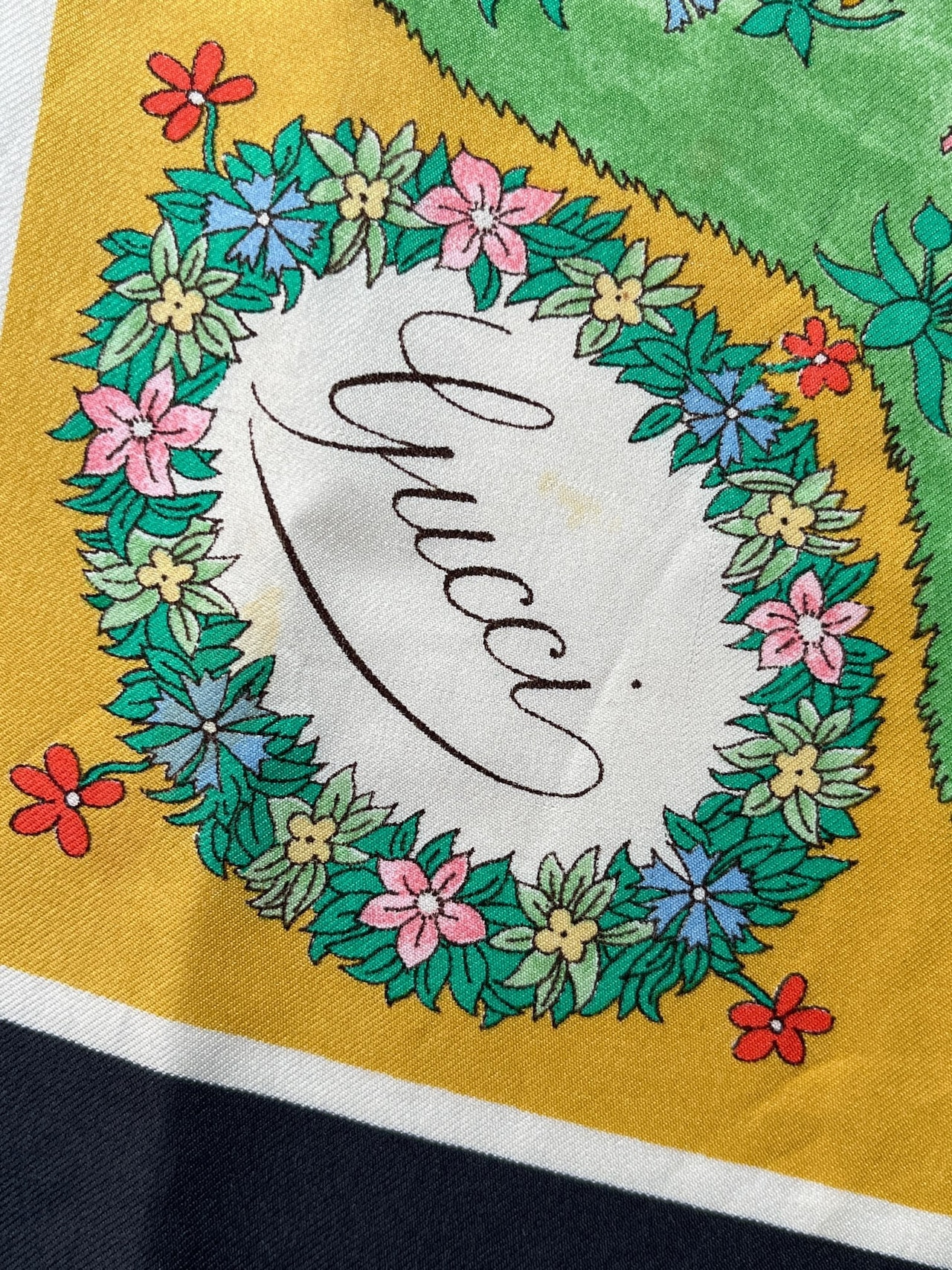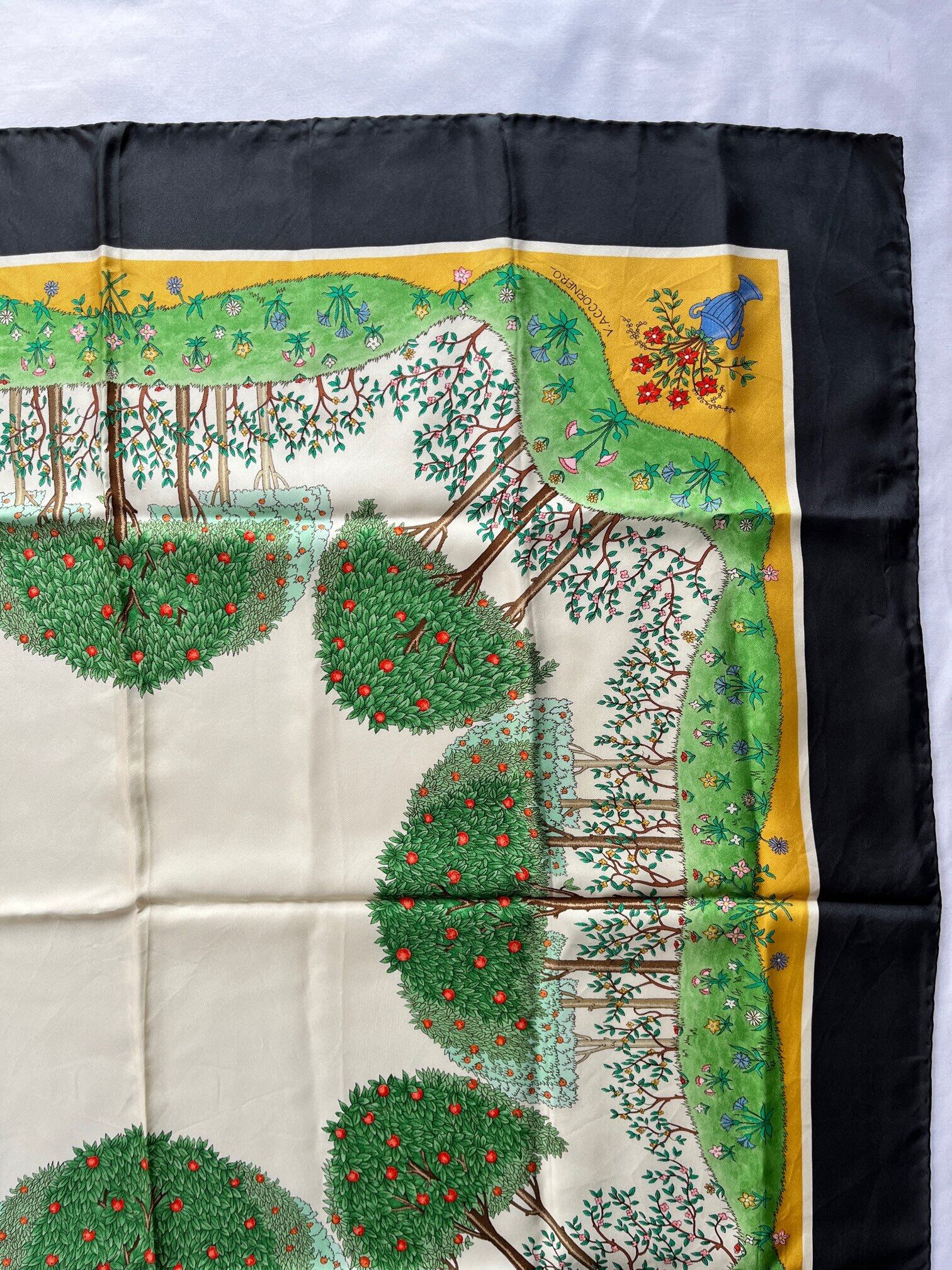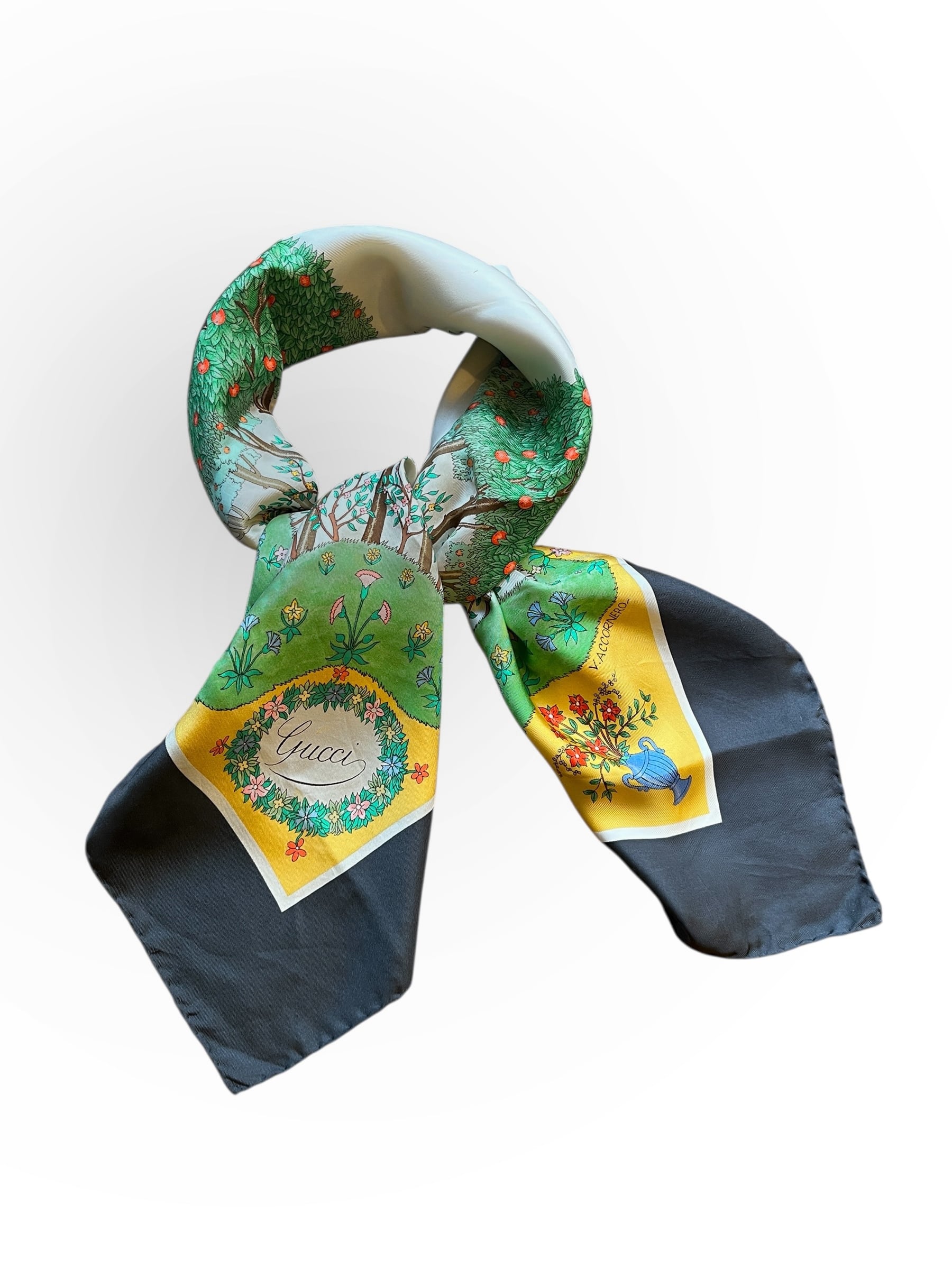 りんごの木のモチーフがユニークなGUCCI80's Vintage スカーフ。草原の色づけが手描きのようなタッチで あたたかい雰囲気が魅力的☆ Dk.greyの囲いがシックで抑揚のある一枚です。