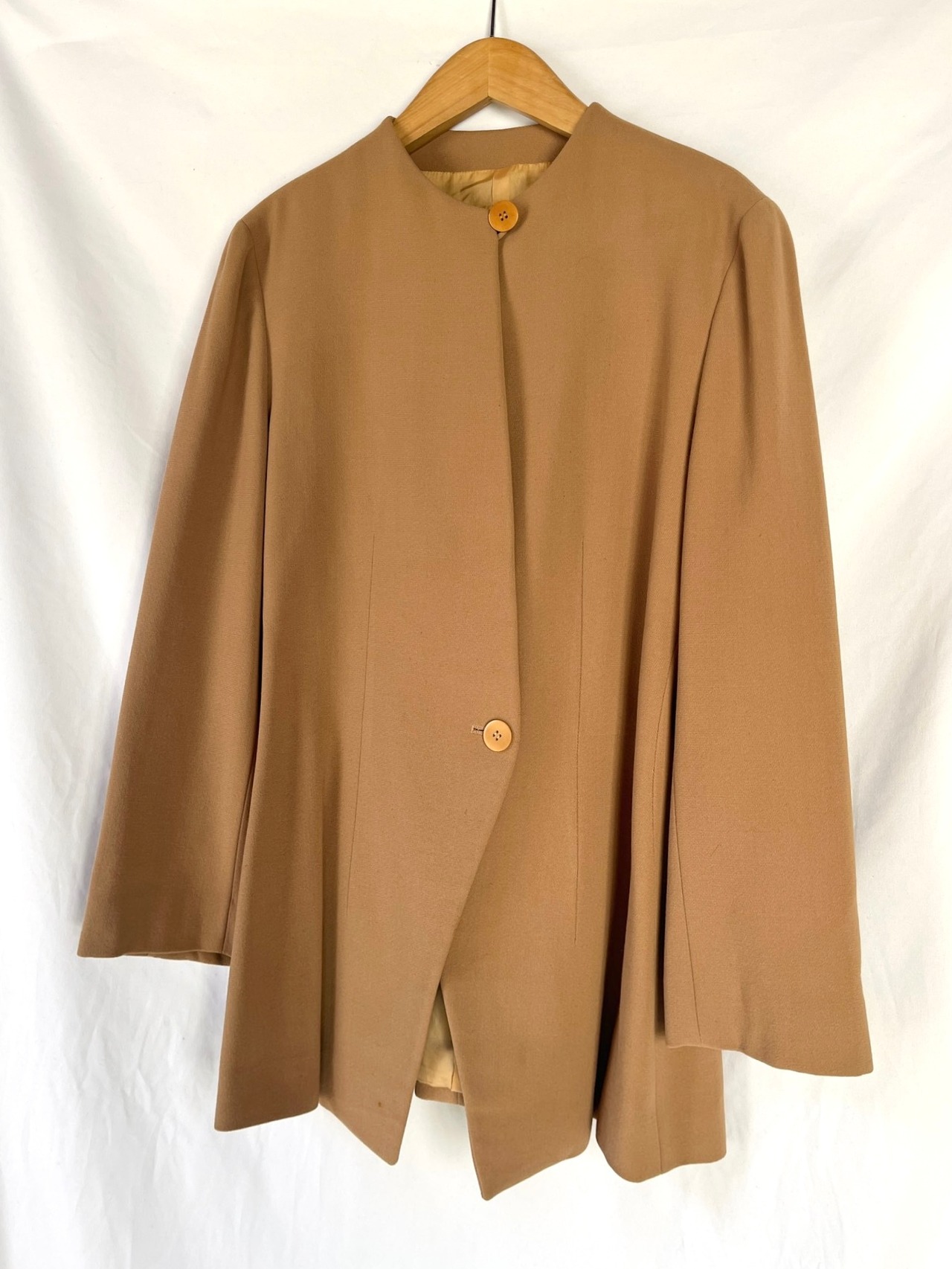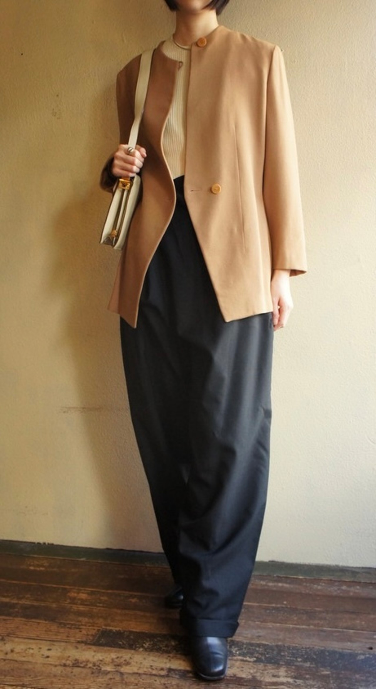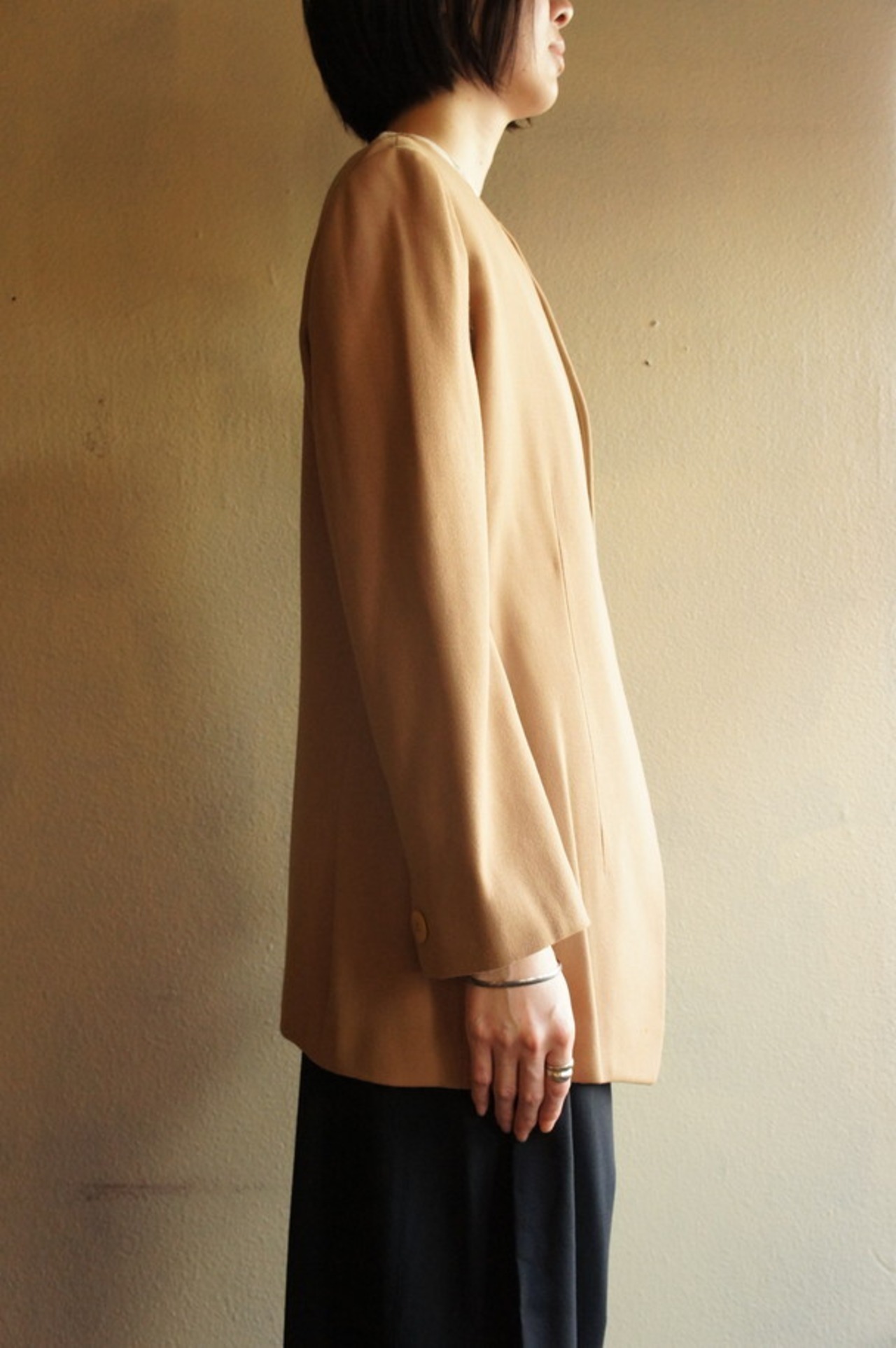 ノーカラーの長めの丈感でウエストにはほんのり締まりのある美しいシルエット。