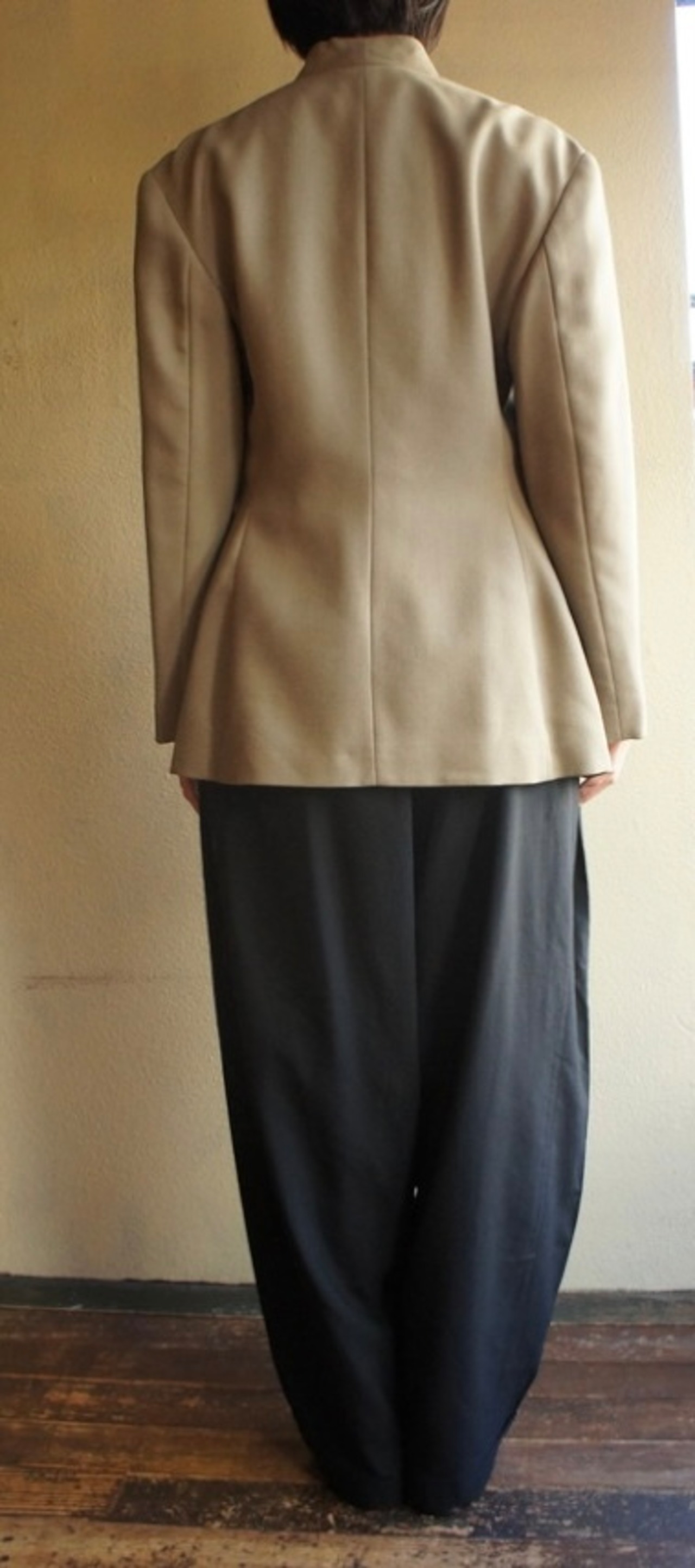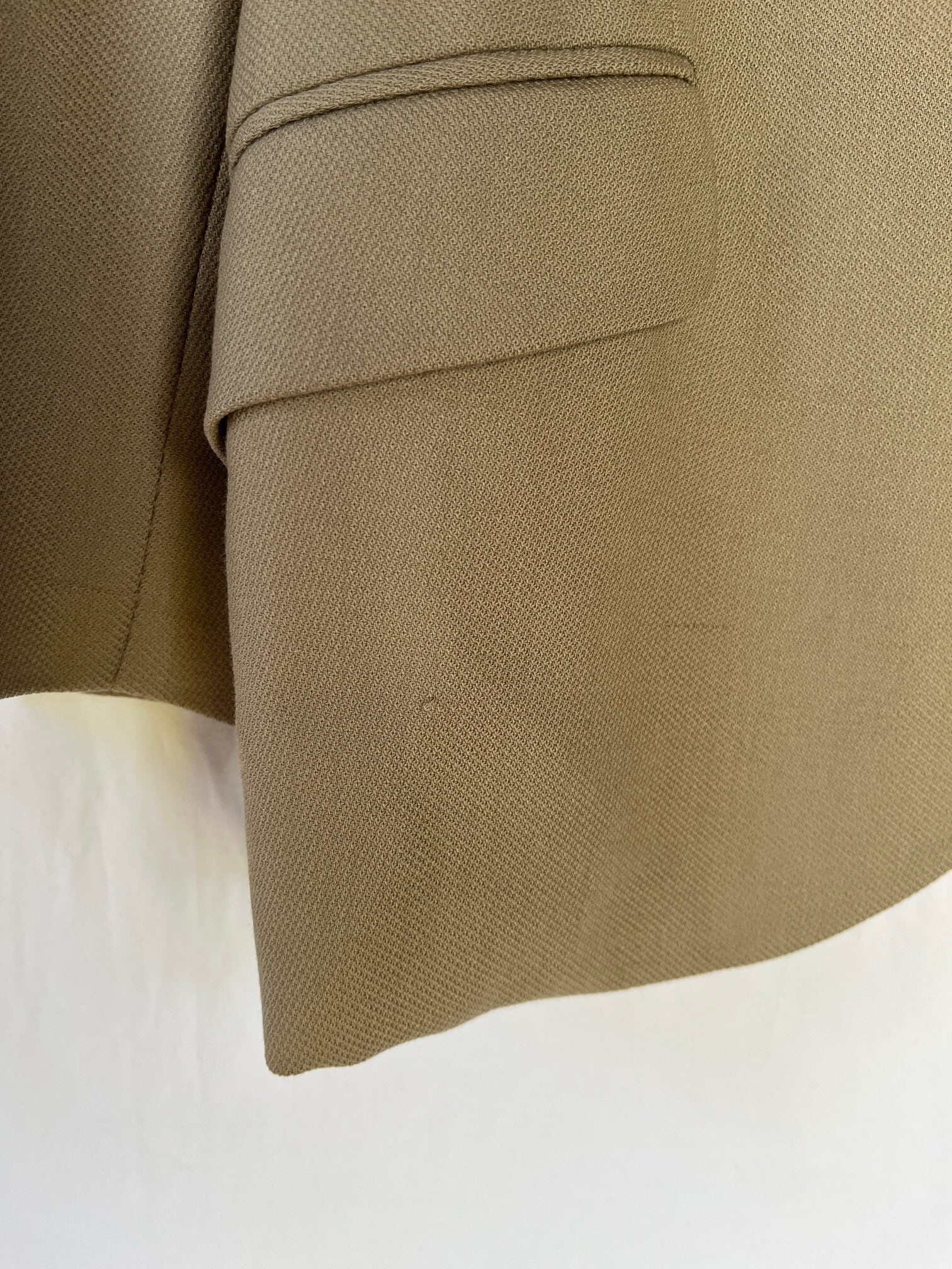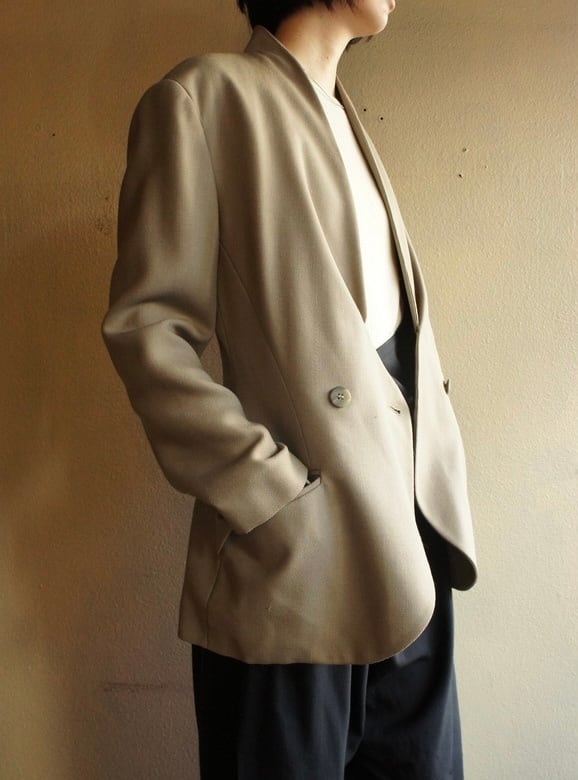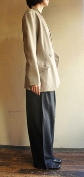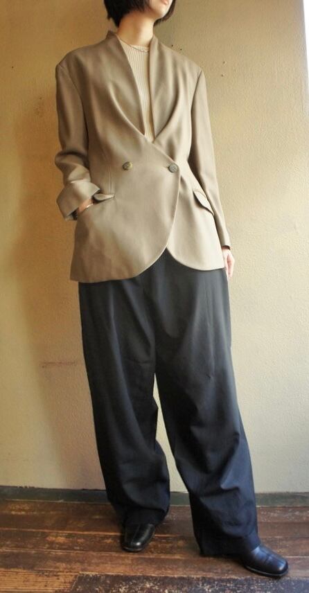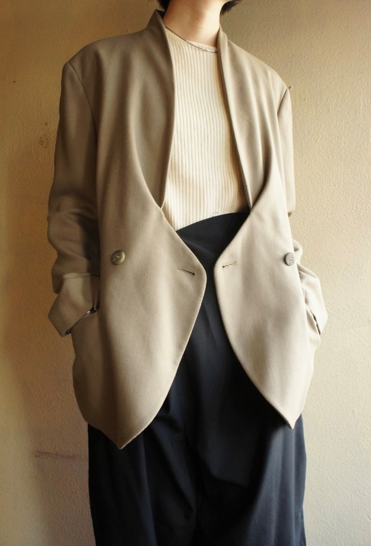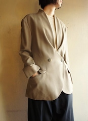 Lt.Khakiの色味がシックなARMANI vintageジャケット。ショールカラーの襟元がエッジの効いたデザイン。さらっとしたウール素材で着心地も◎中間色なのでコーデにも合わせやすい一枚です。