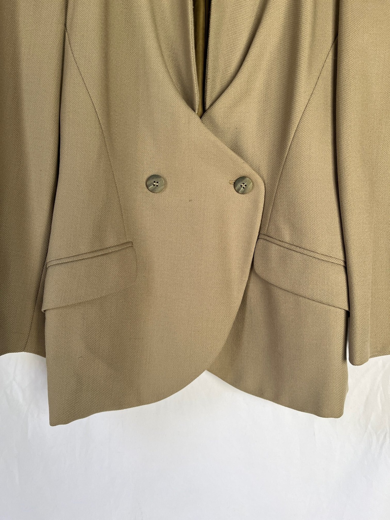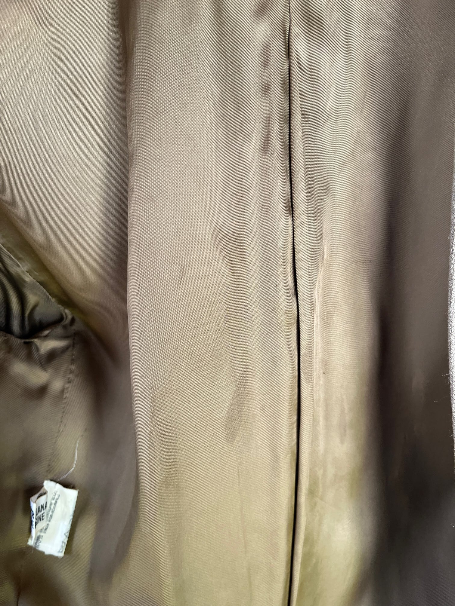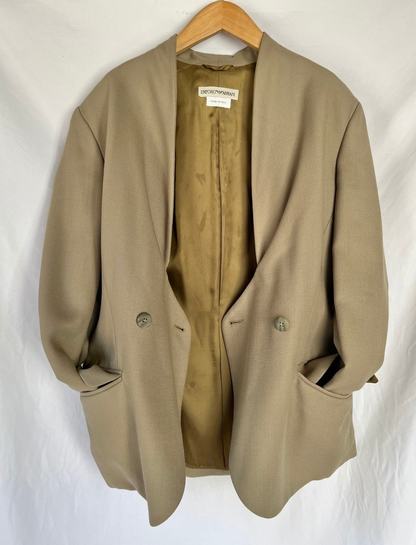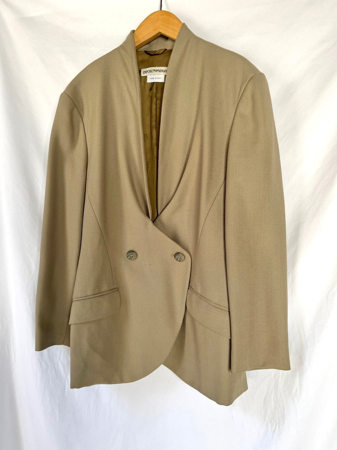 Lt.Khakiの色味がシックなARMANI vintageジャケット。ショールカラーの襟元がエッジの効いたデザイン。さらっとしたウール素材で着心地も◎中間色なのでコーデにも合わせやすい一枚です。