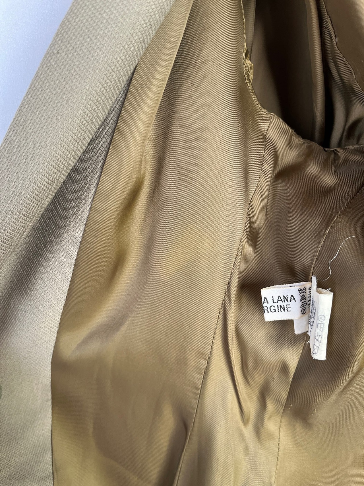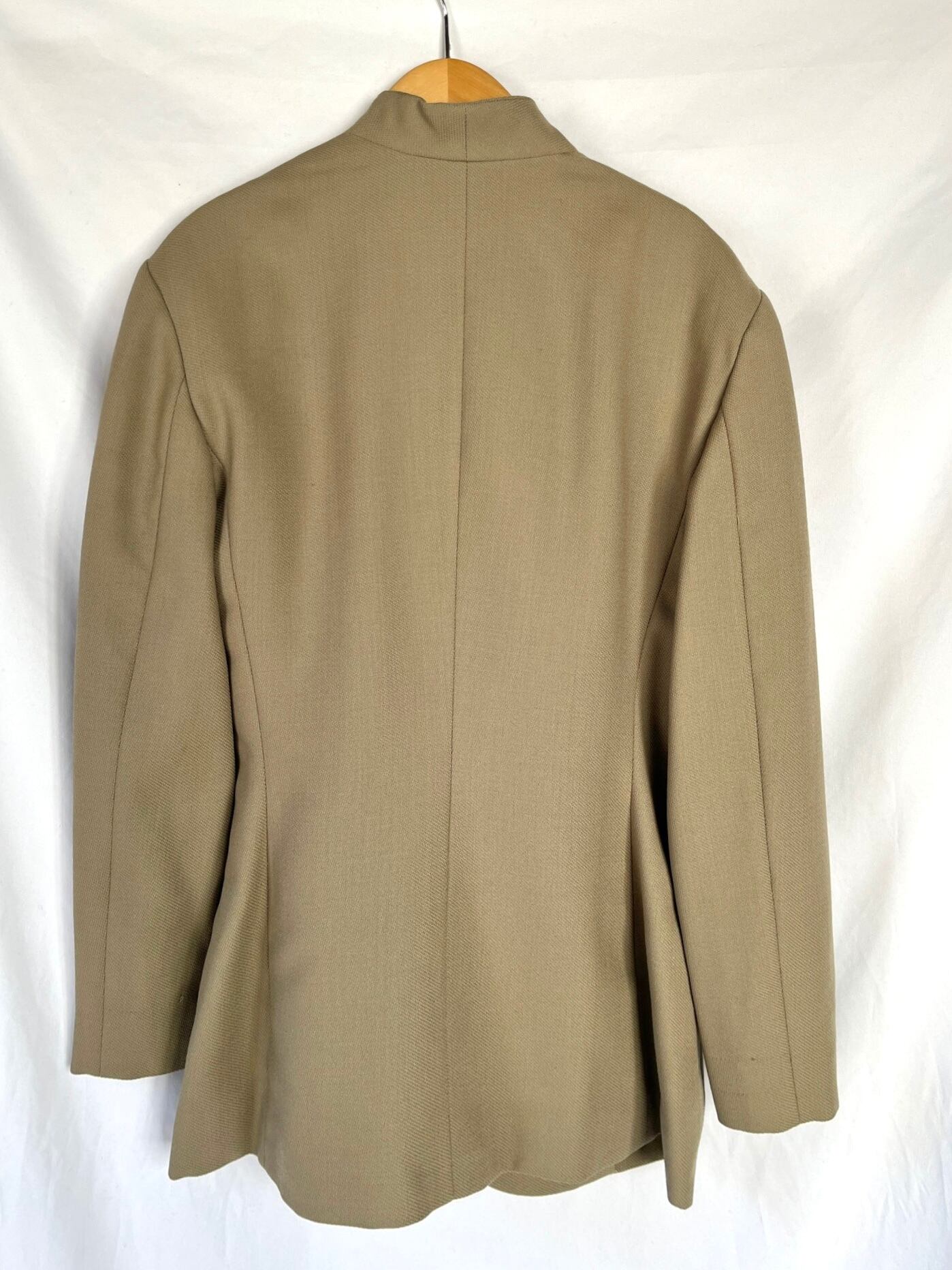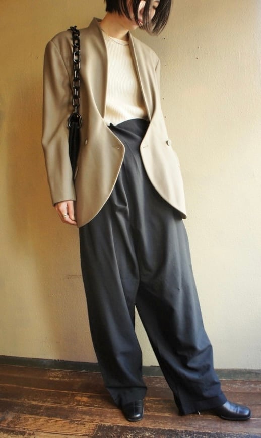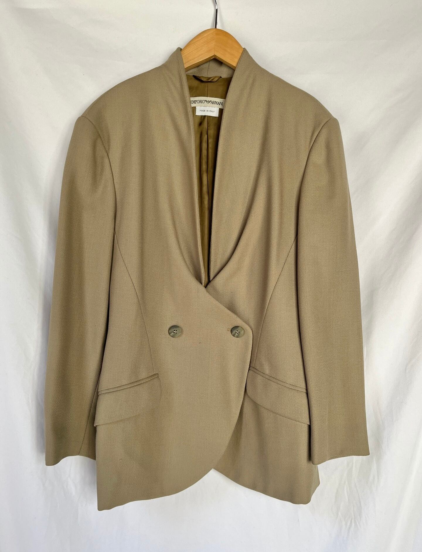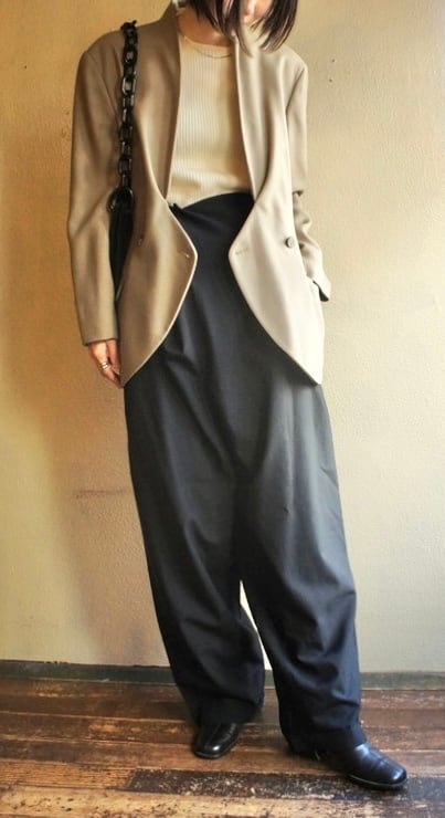 Lt.Khakiの色味がシックなARMANI vintageジャケット。ショールカラーの襟元がエッジの効いたデザイン。さらっとしたウール素材で着心地も◎中間色なのでコーデにも合わせやすい一枚です。