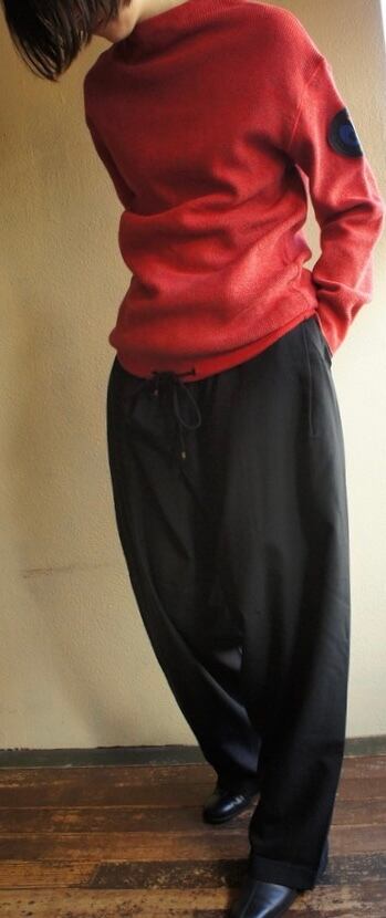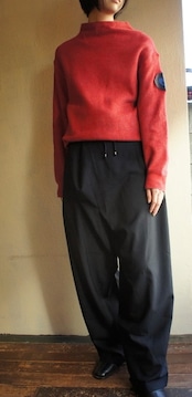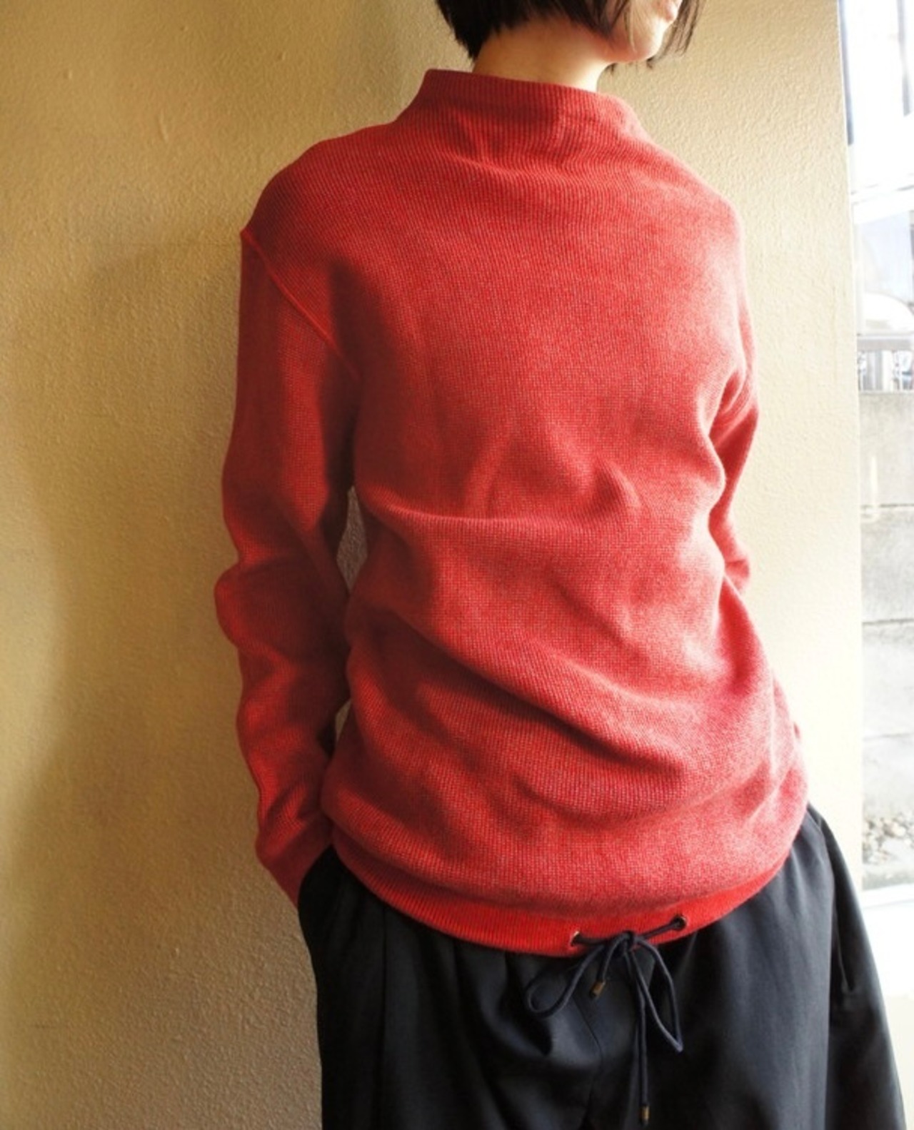 モックネックにキュッと絞れるドロストの裾がモード感のあるシルエット。