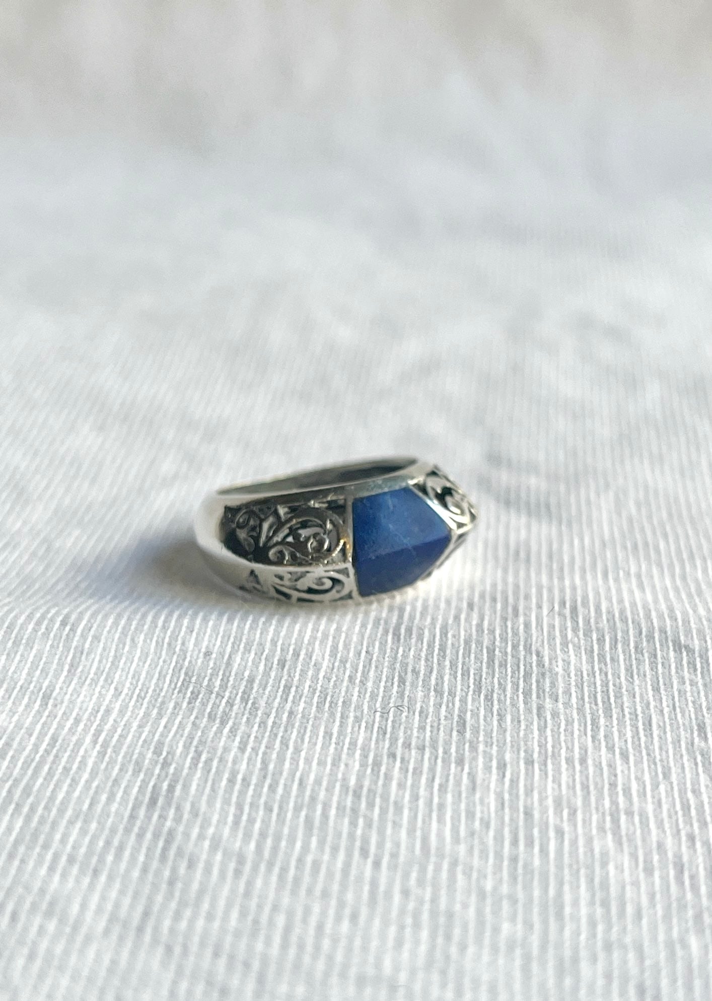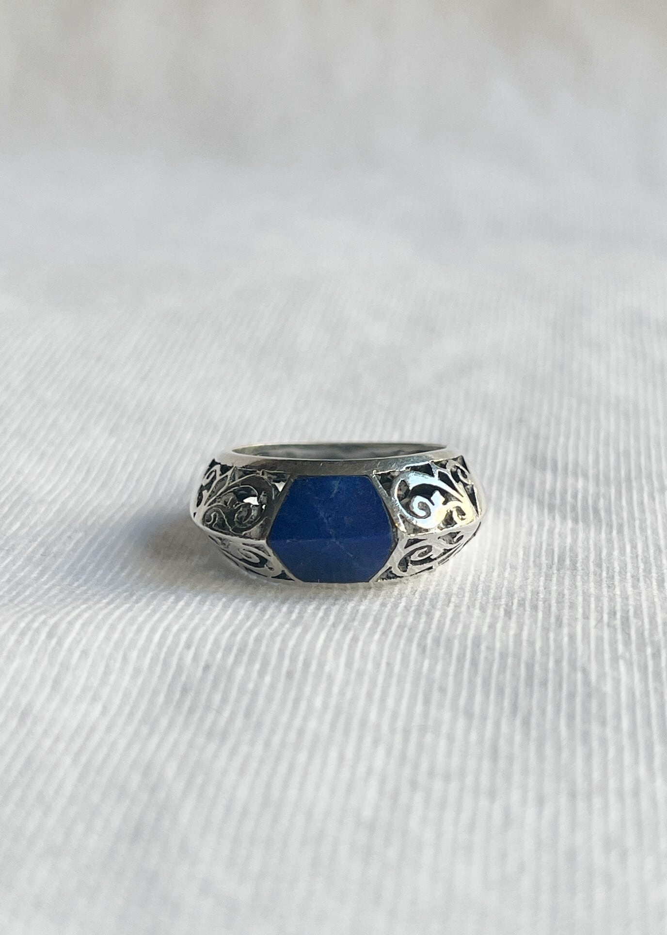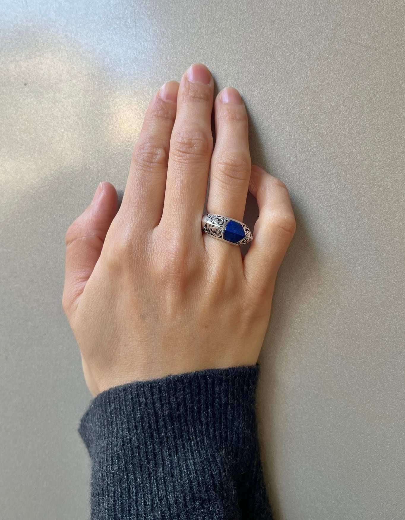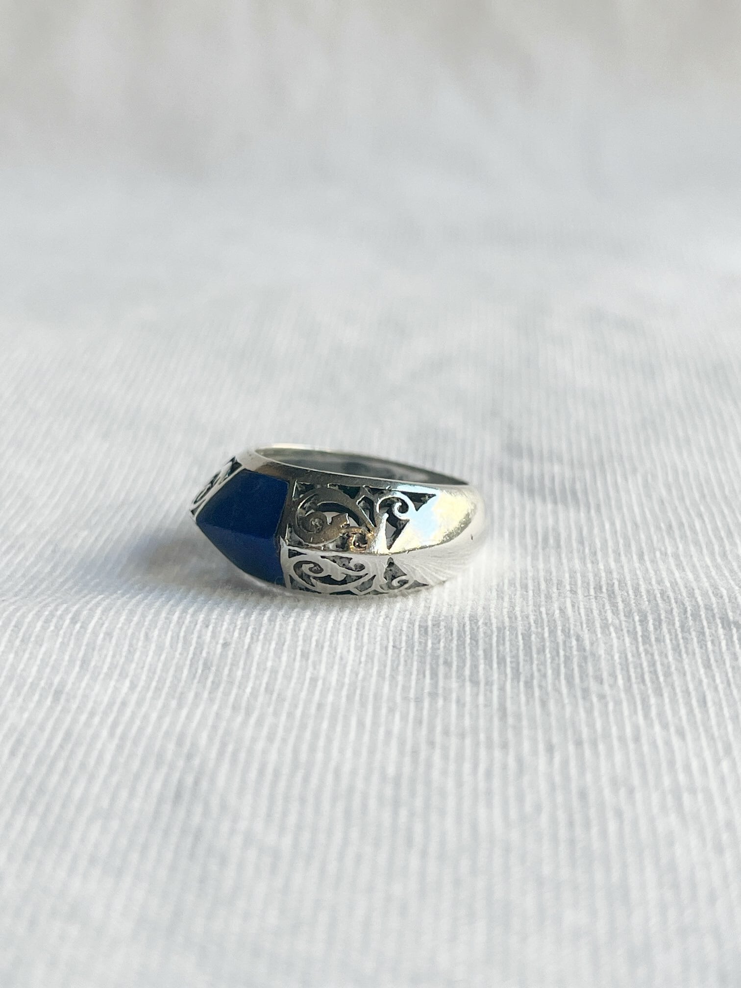 ネイビーのストーンがシックなVintage Silver リング。カクっと立体的でユニークなカットが魅力的。アラベスク模様な切り込みが芸術的な 一品です。