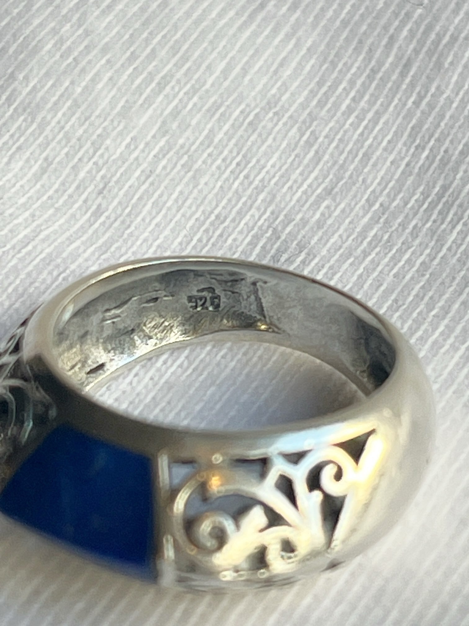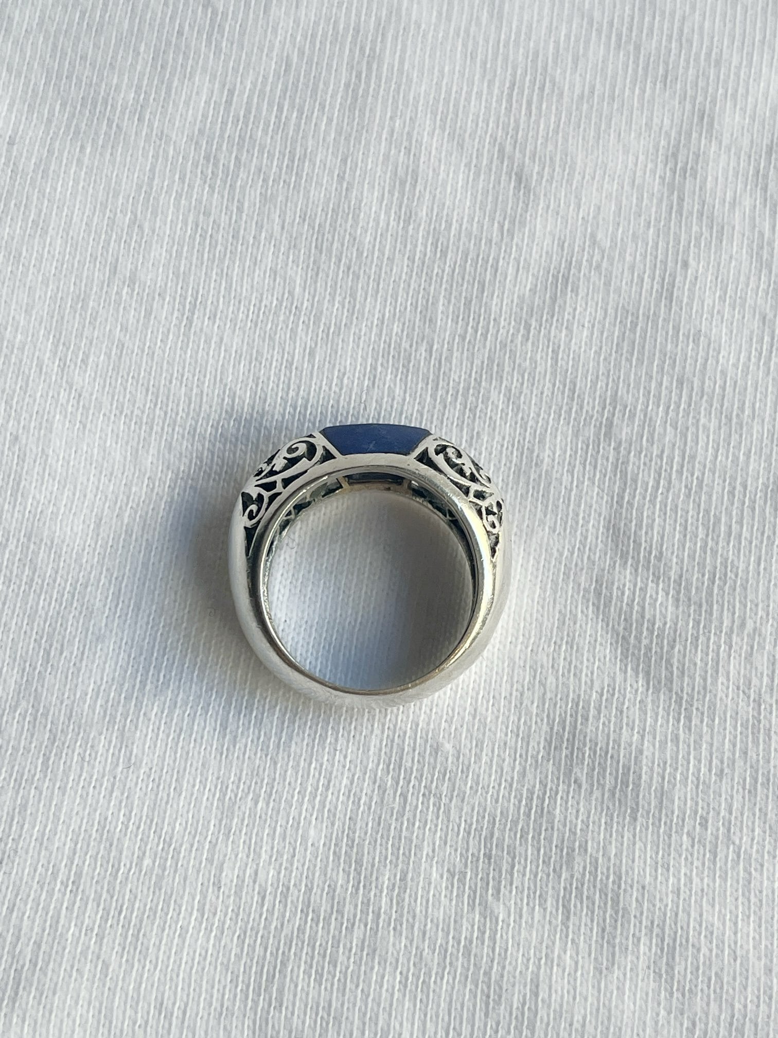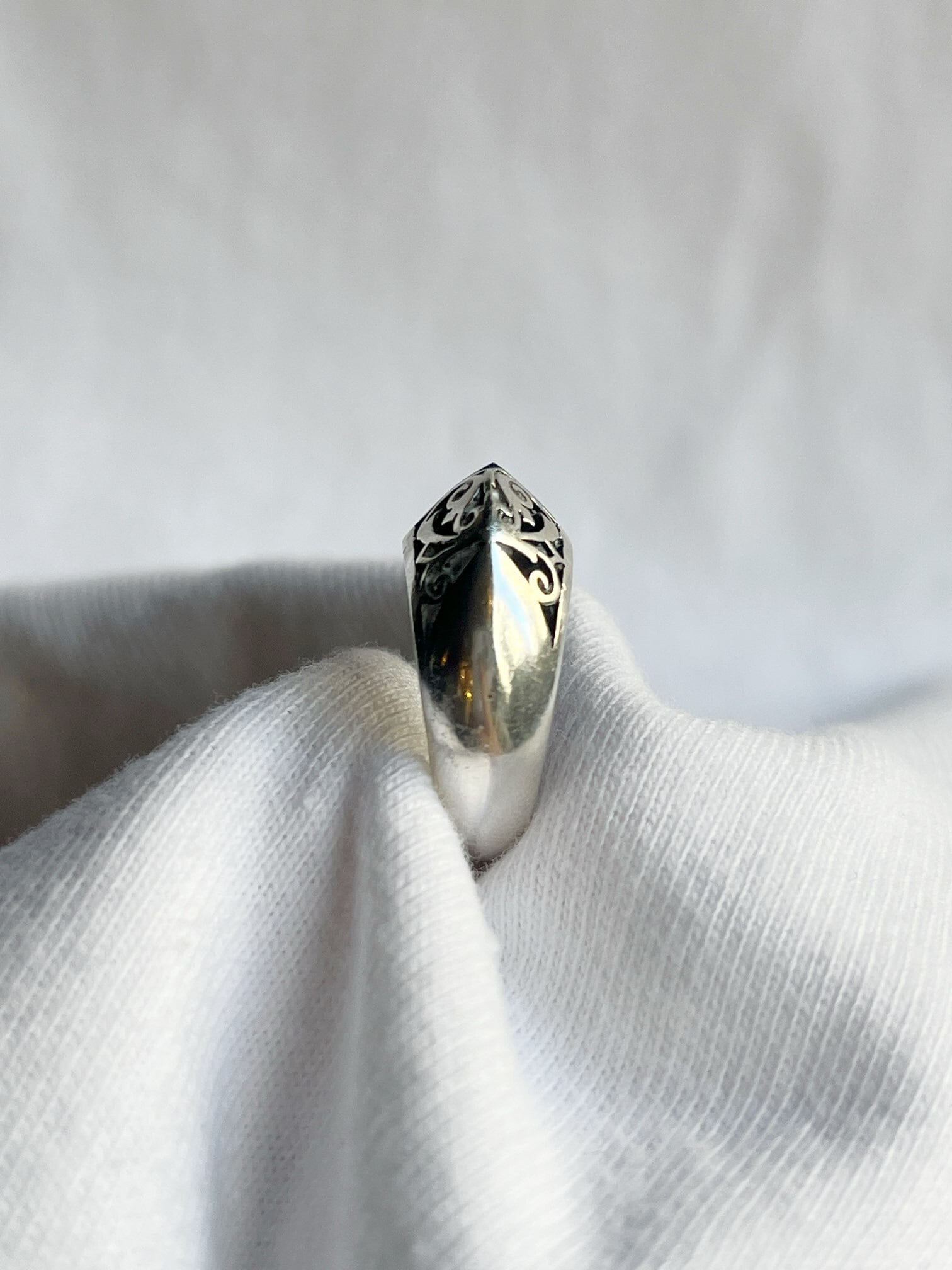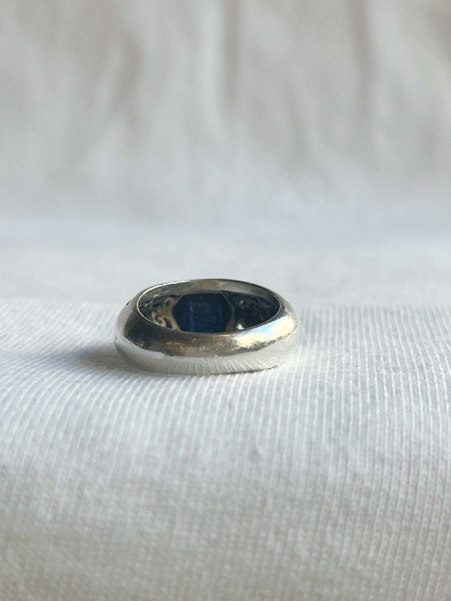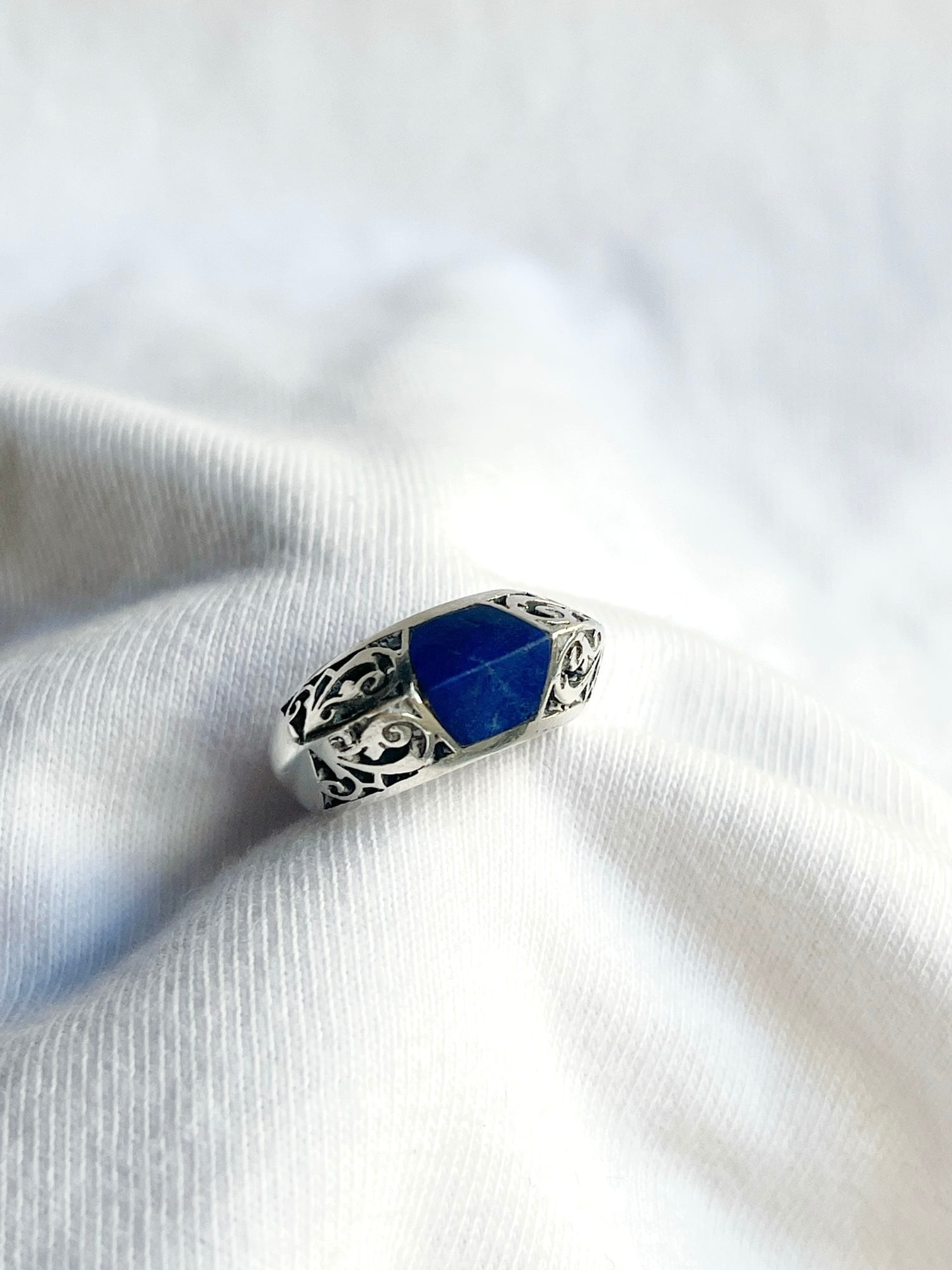 ネイビーのストーンがシックなVintage Silver リング。カクっと立体的でユニークなカットが魅力的。アラベスク模様な切り込みが芸術的な 一品です。
