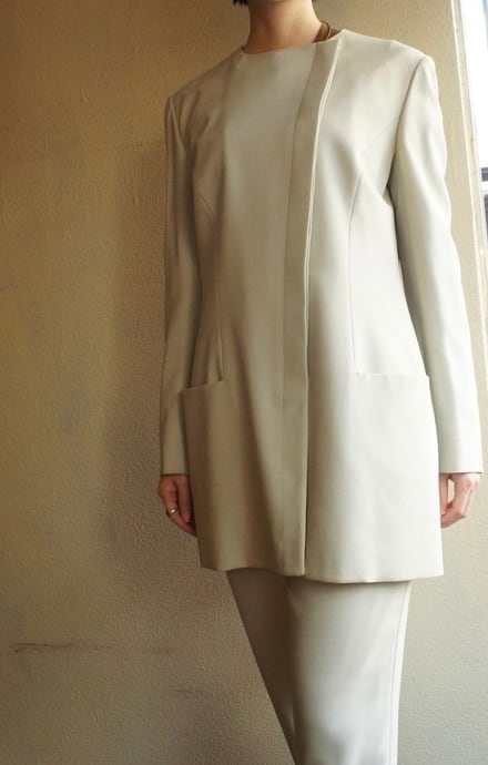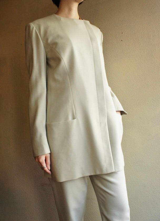 ロング丈のJKTは、隠しボタンで洗練されたデザイン。