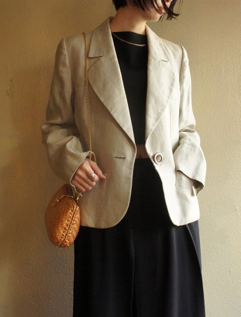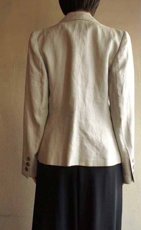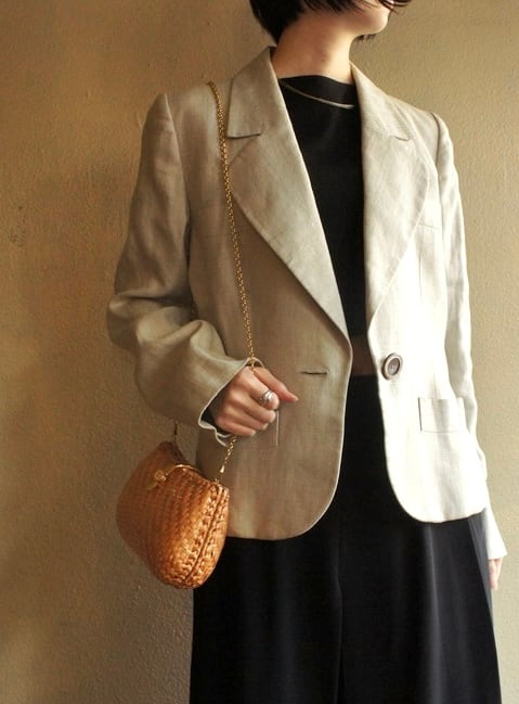 直線とカーブのバランスが絶妙な襟元もポイント。ウエストにややくびれの効いた美しい一枚です。