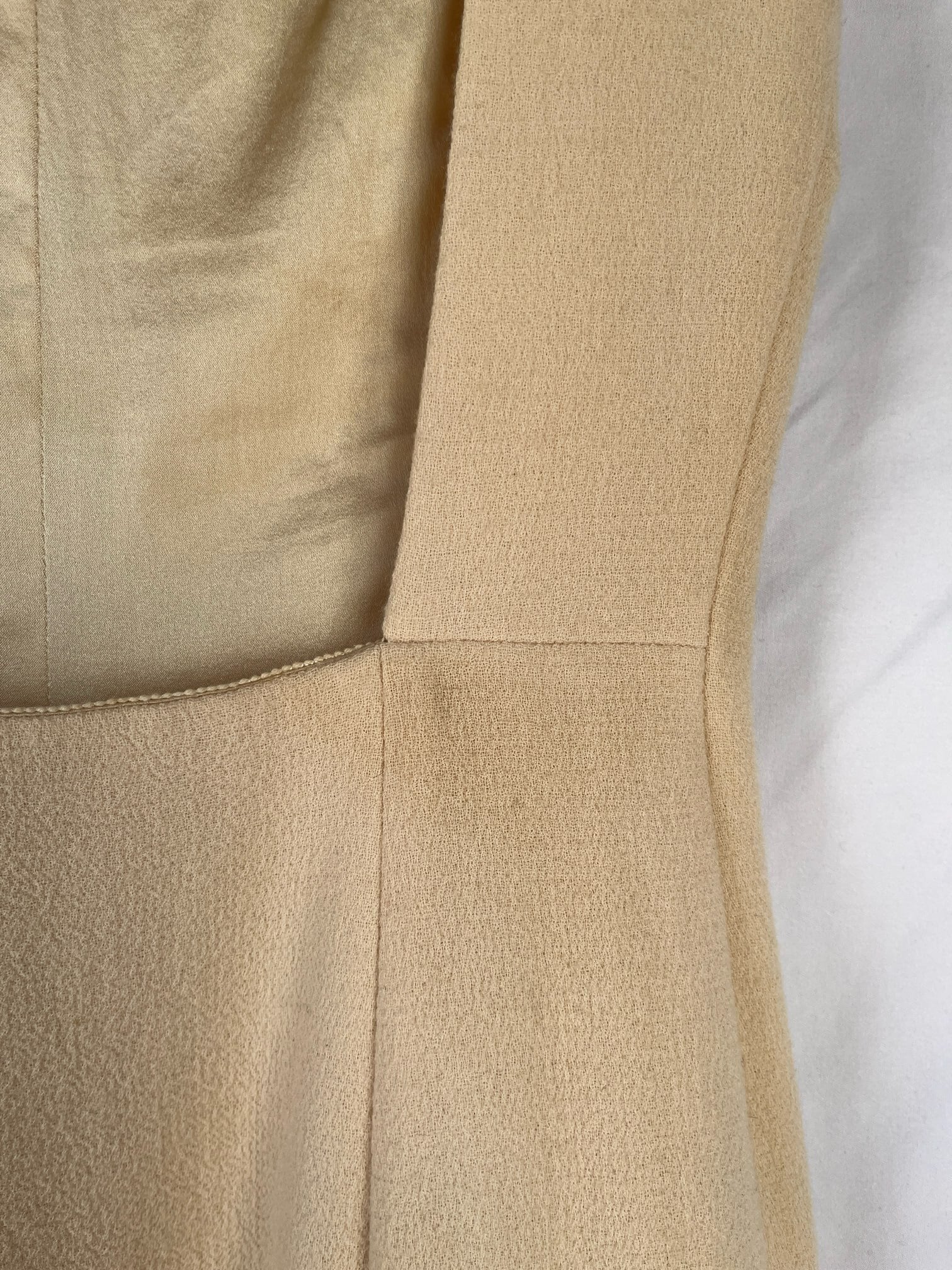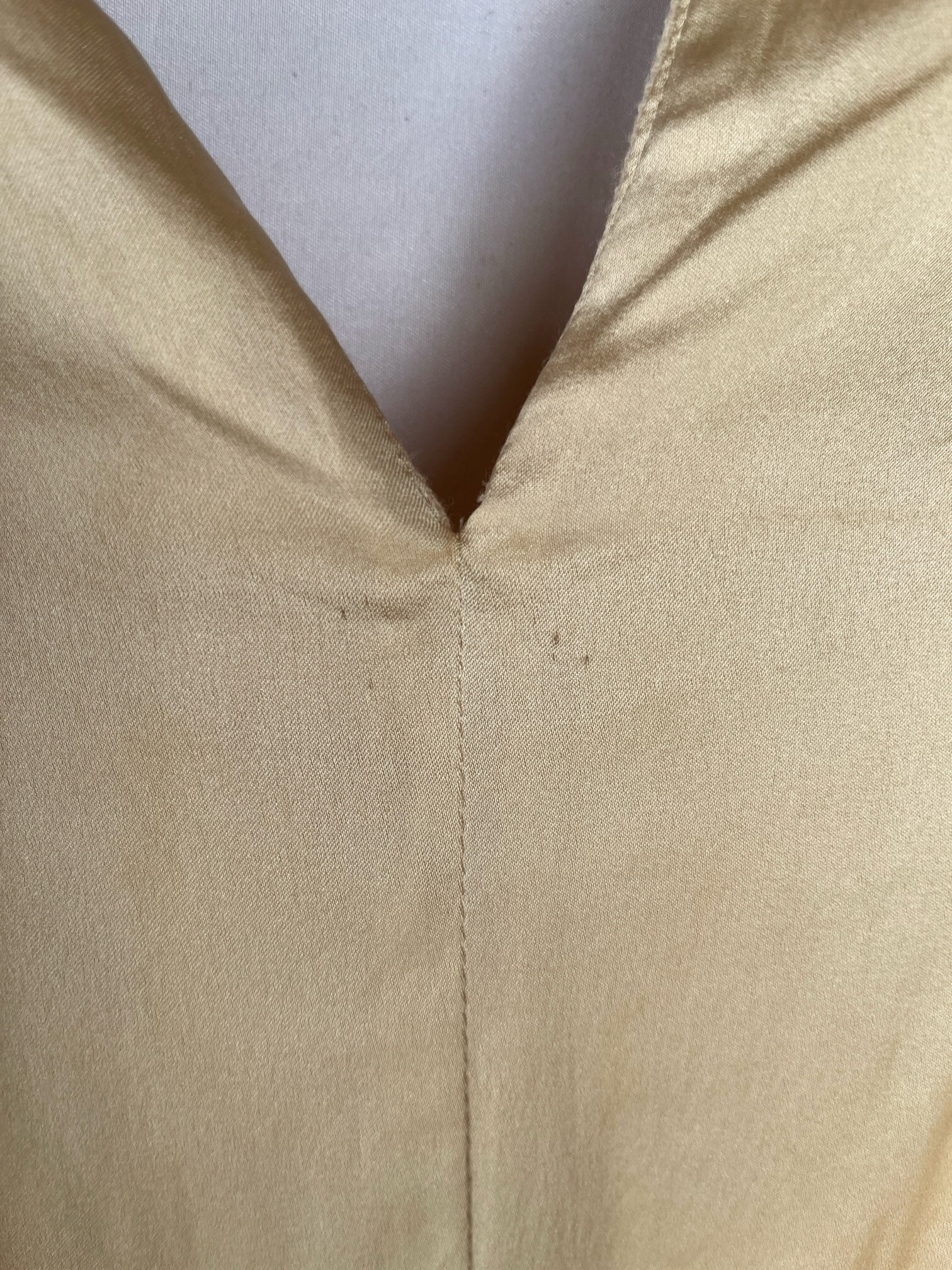 背中のカットラインは曲線が効いていて女性らしい丸みのあるデザインになっています。生地はふんわりと柔らかな手触りで、気品のある一枚です。