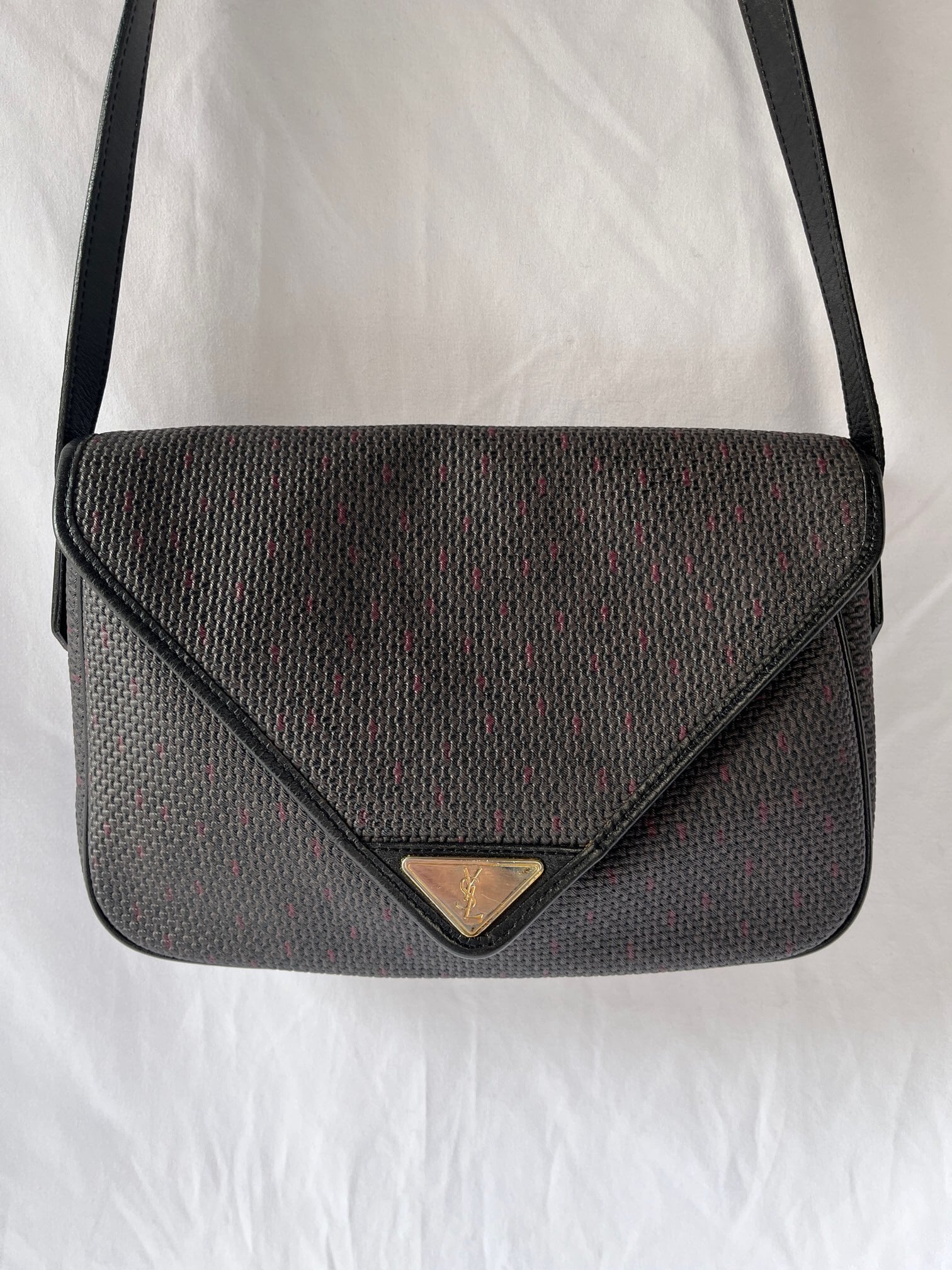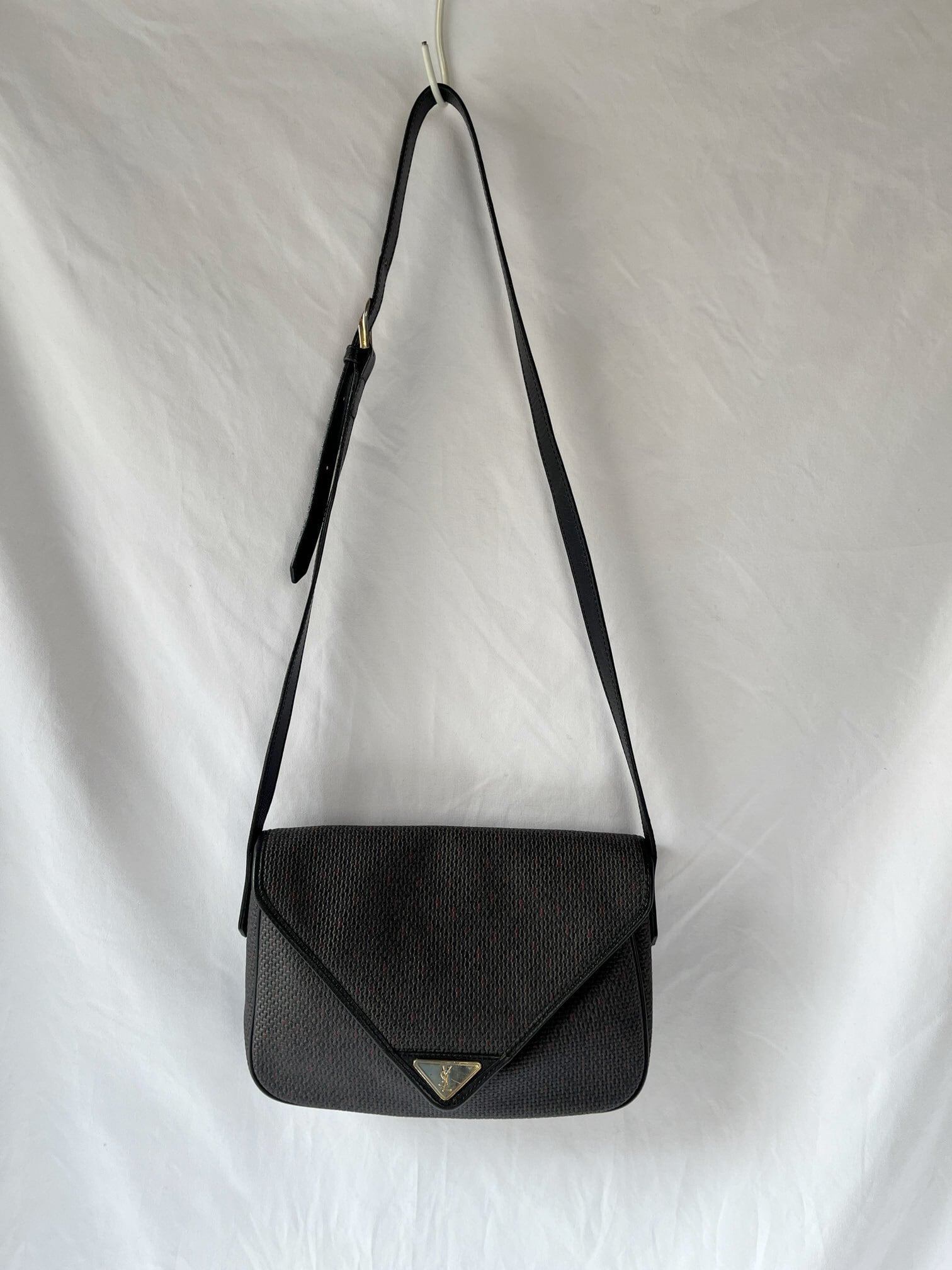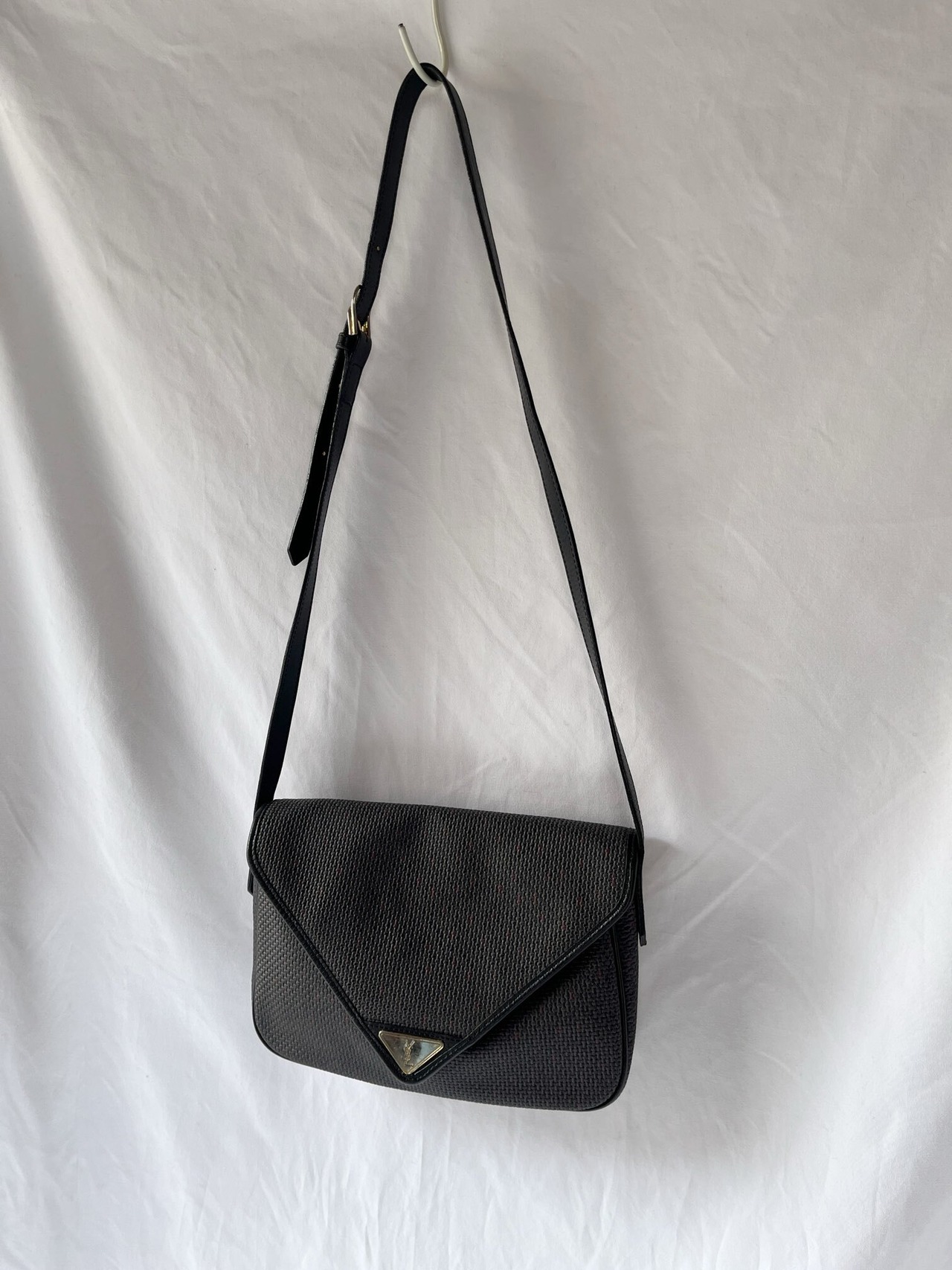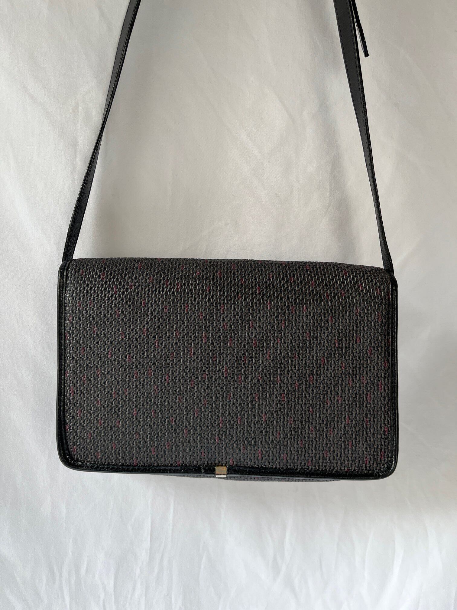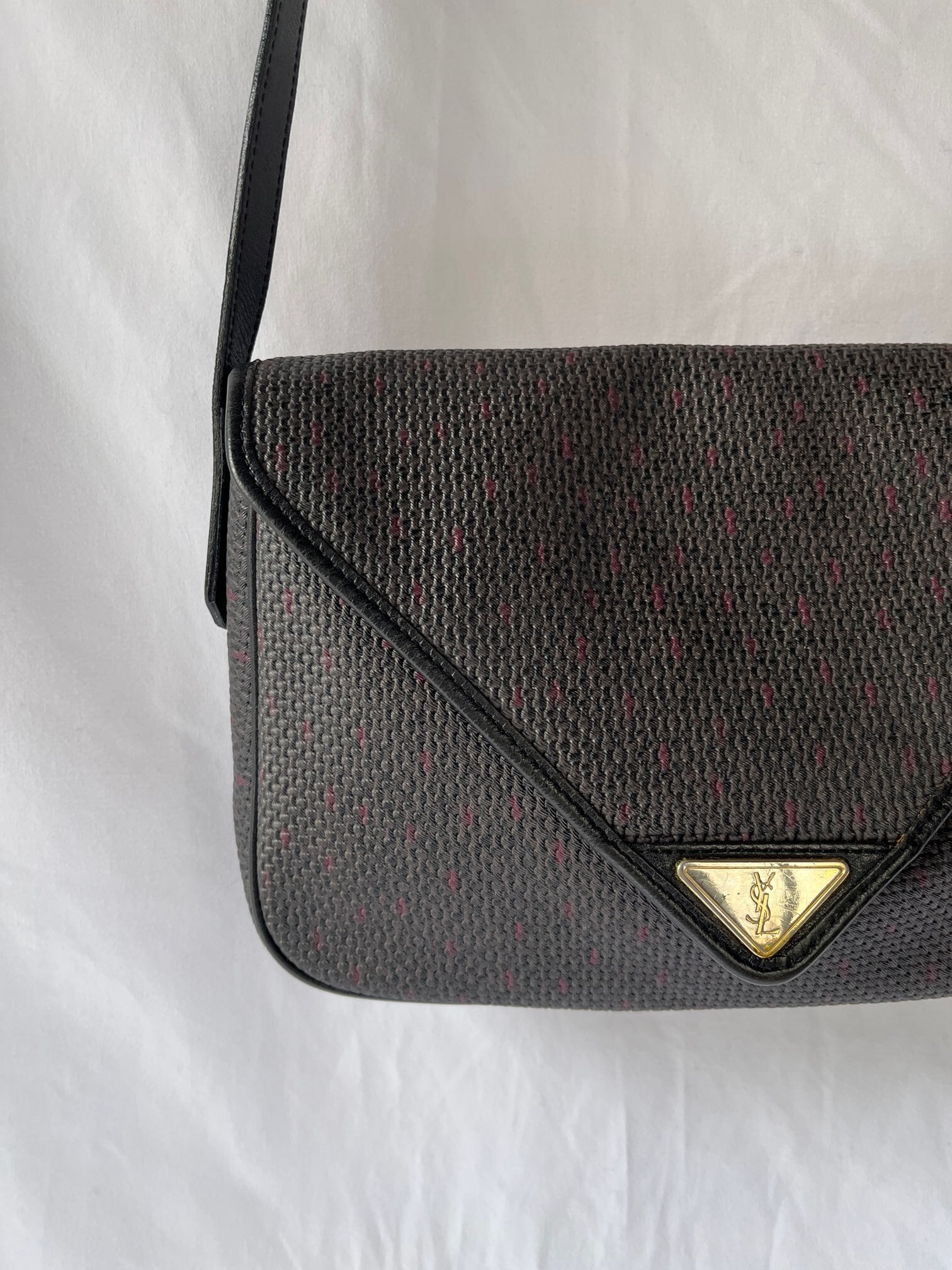 長方形のシェイプがユニークなYSL vintageショルダーバック。ダークトーンのベースにパープルのドットのようなモチーフがさりげなく小洒落たデザイン。マグネットボタンにしっかりと幅のあるシェイプが使い勝手バツグン★
