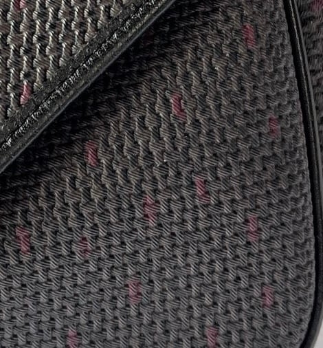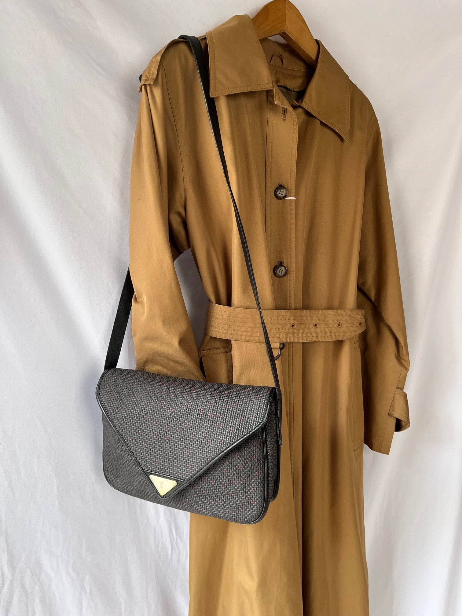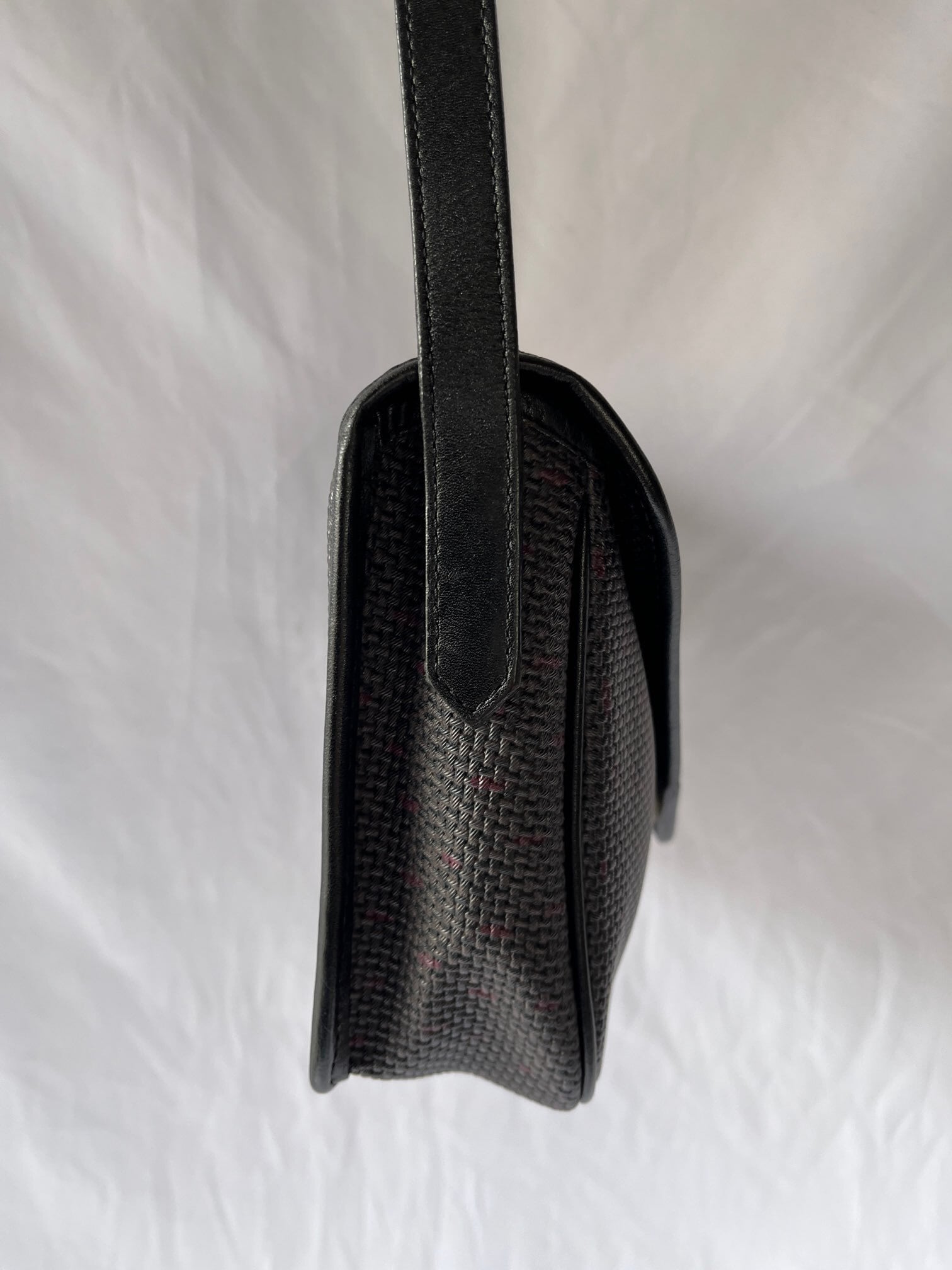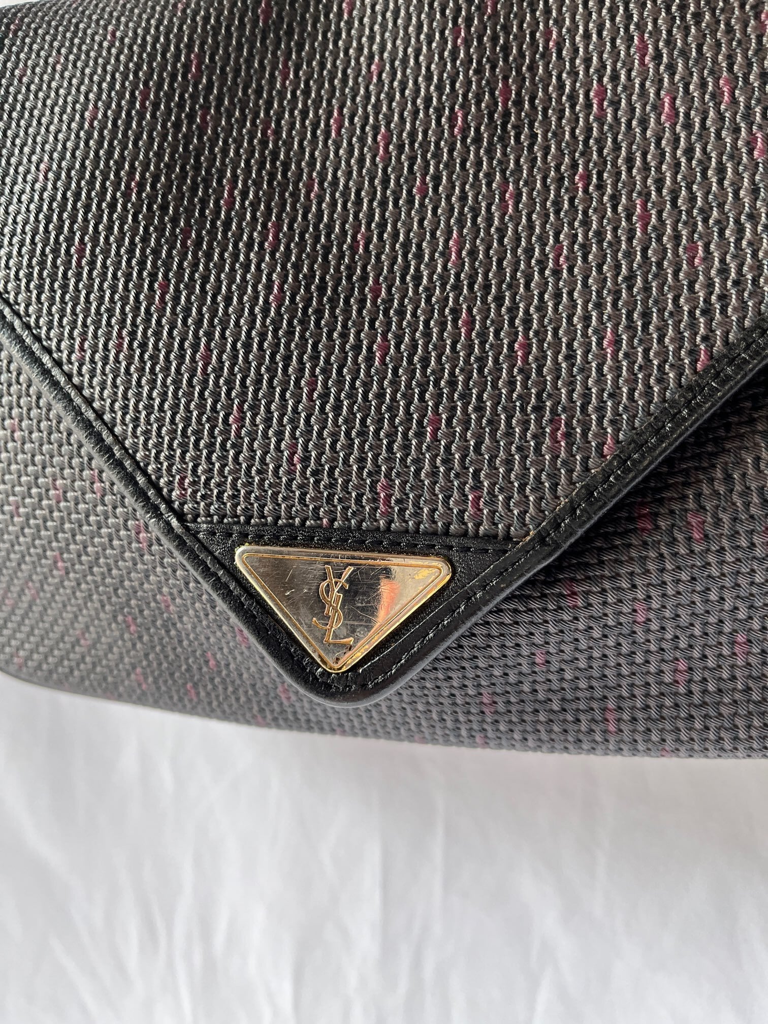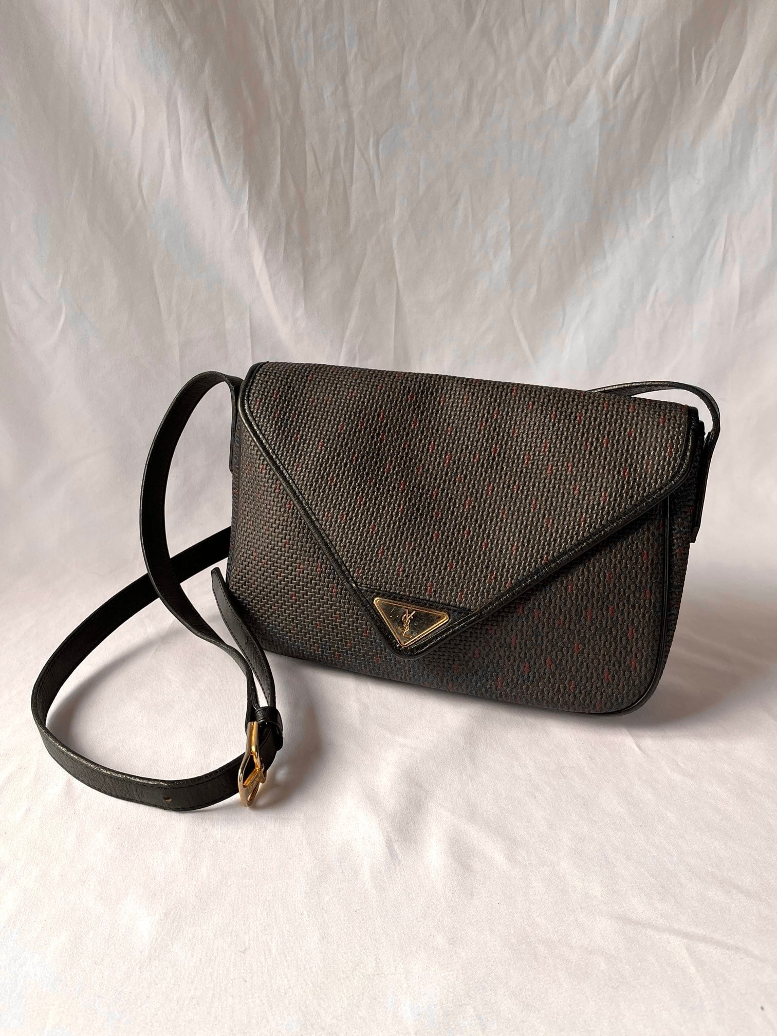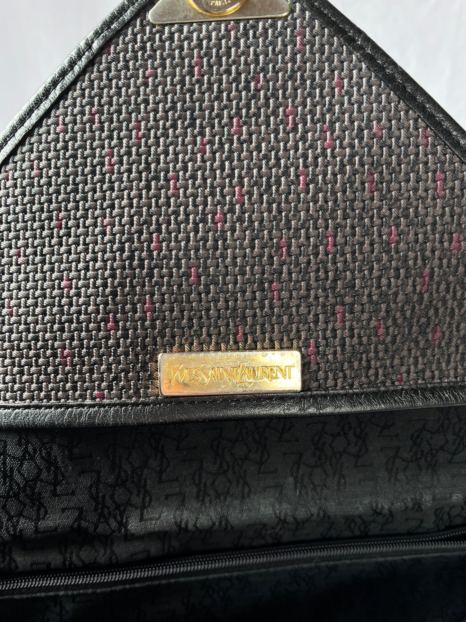 長方形のシェイプがユニークなYSL vintageショルダーバック。ダークトーンのベースにパープルのドットのようなモチーフがさりげなく小洒落たデザイン。マグネットボタンにしっかりと幅のあるシェイプが使い勝手バツグン★