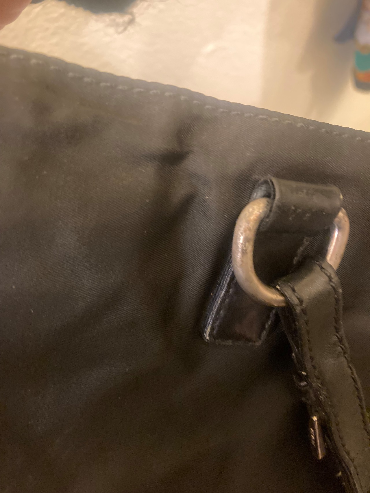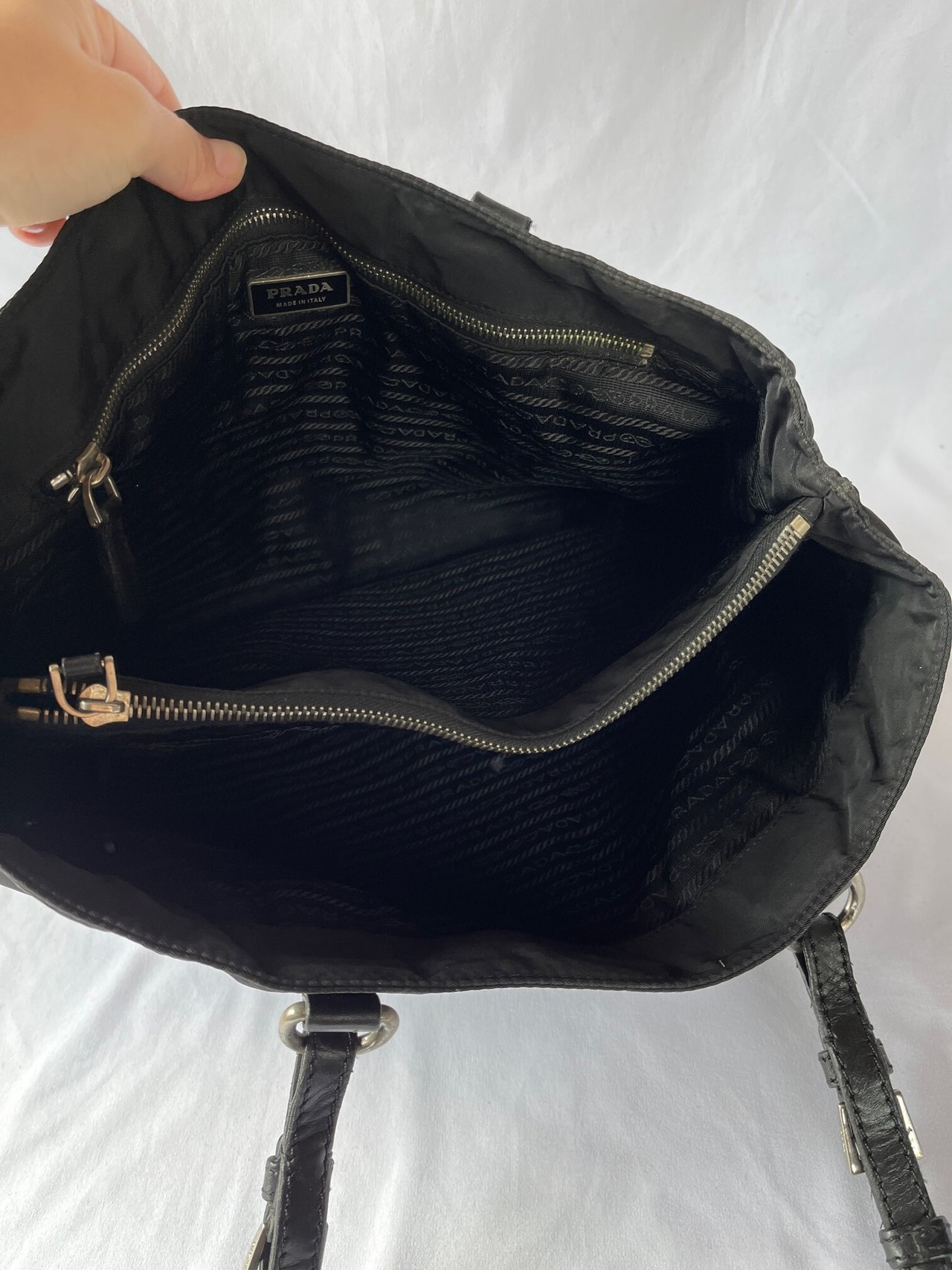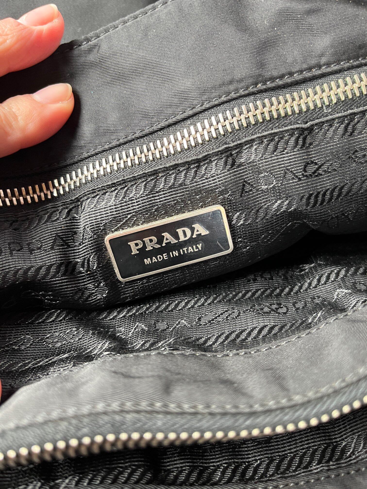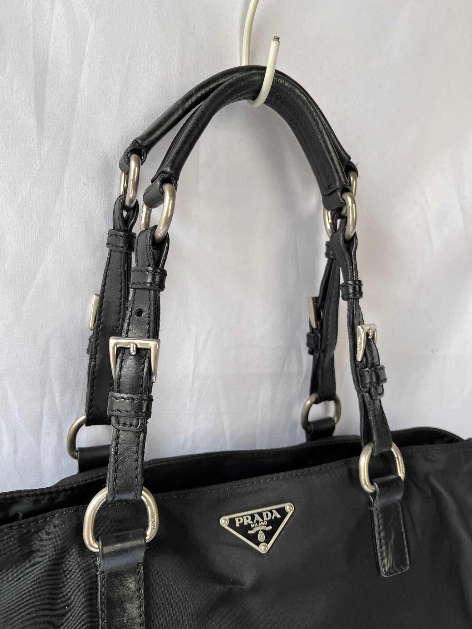 ブラックのナイロン地にPRADAの三角ロゴ、レザー素材のハンドルのトートバッグ。