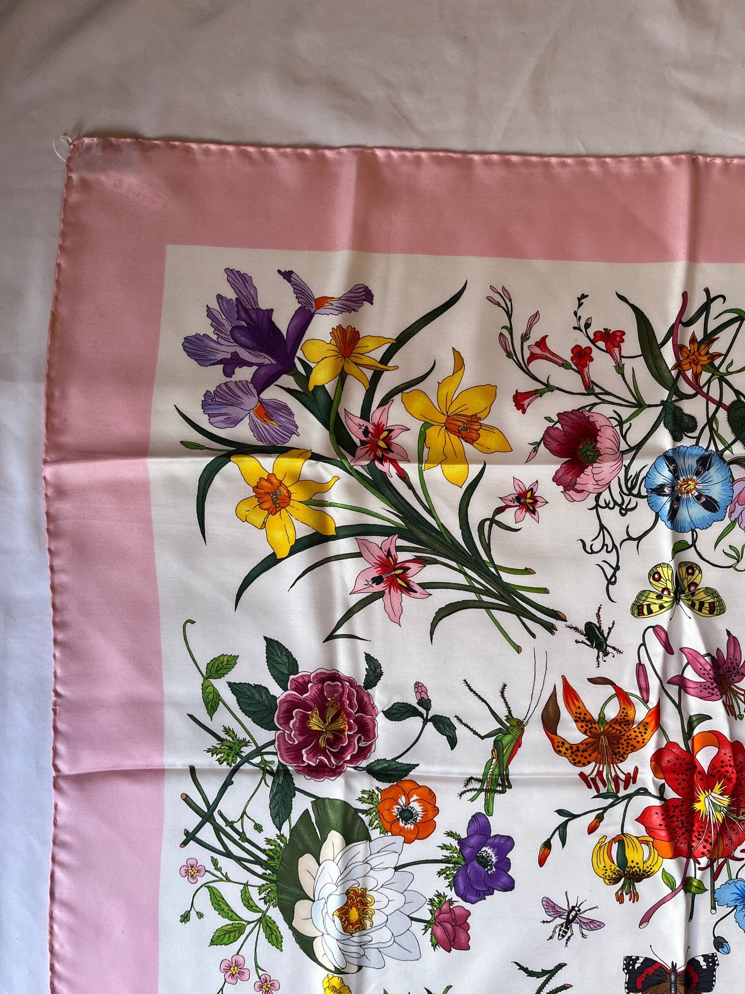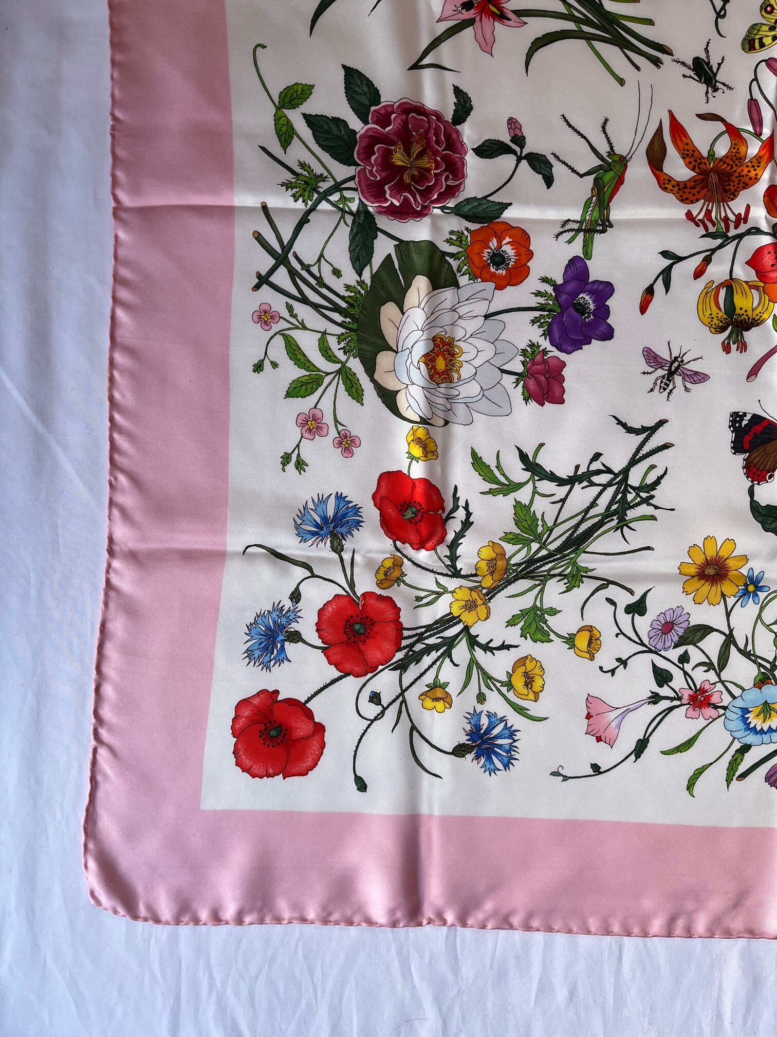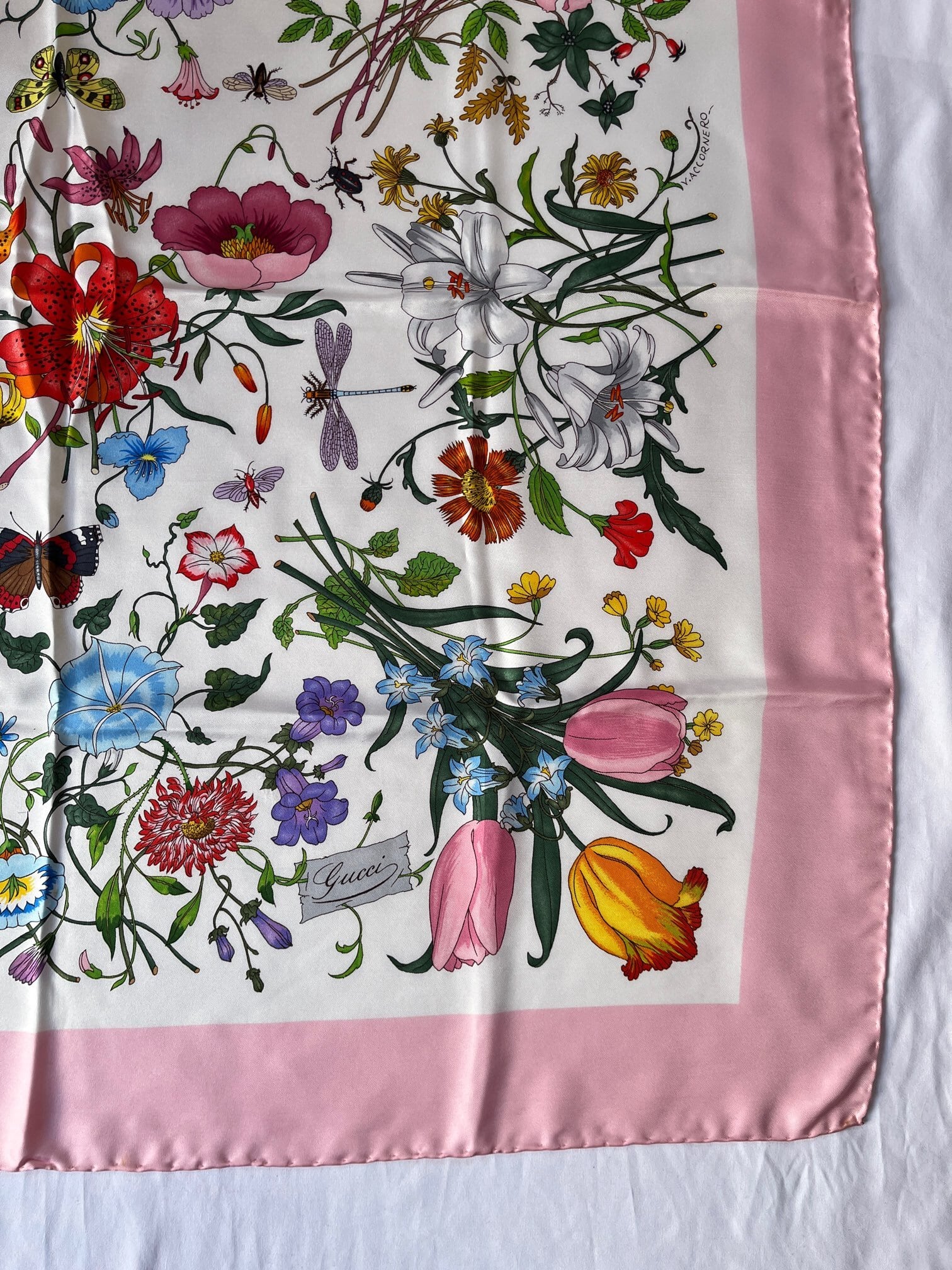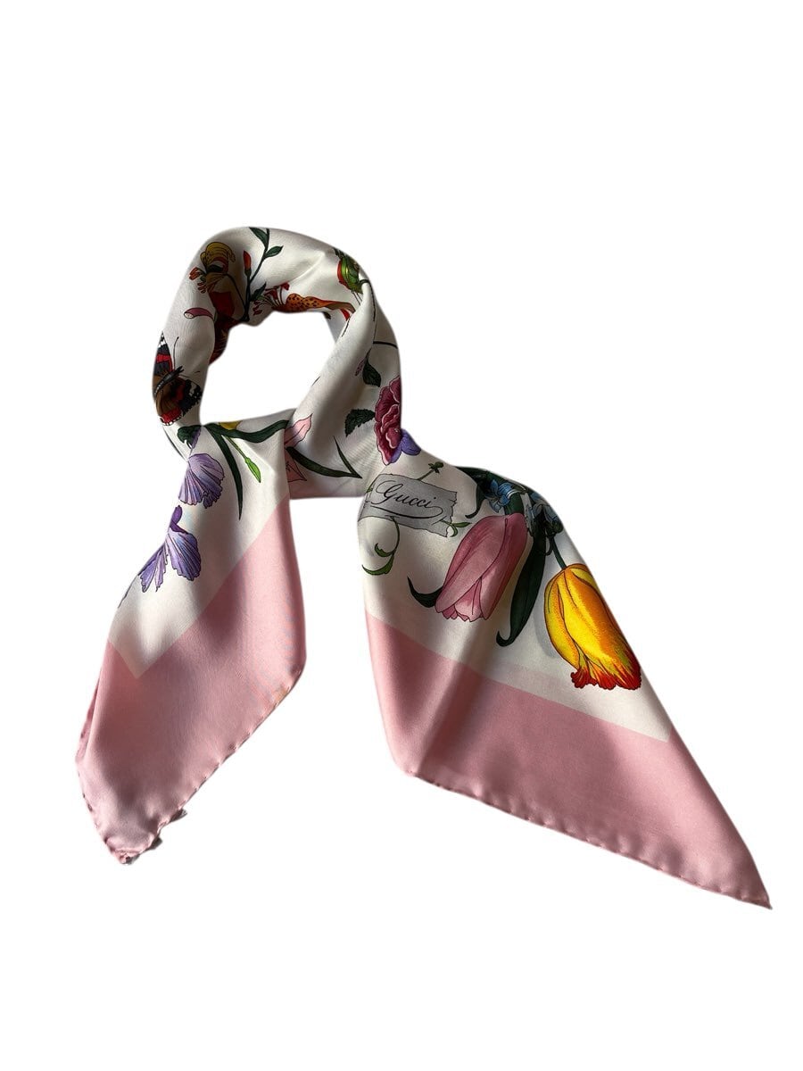 ホワイトにピンクのフチどりがかわいらしいGucel Vintage スカーフ。ユリやチューリップ、アサガオなどの美しい花々が咲き誇る絵柄☆ ハリのあるSilk 素材で手触りの良さも魅力的です。