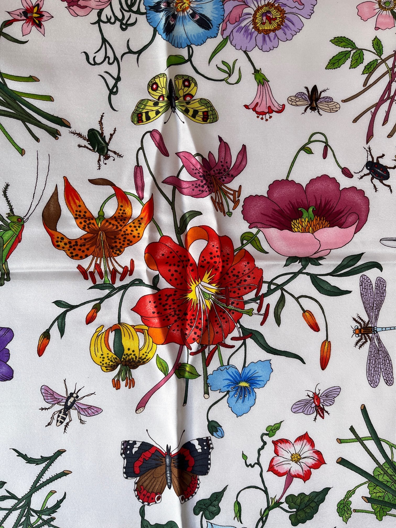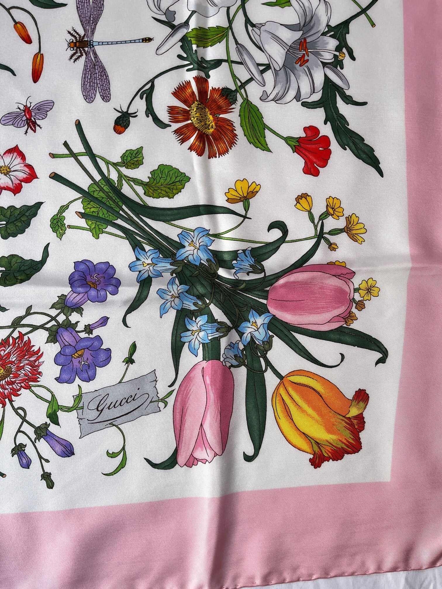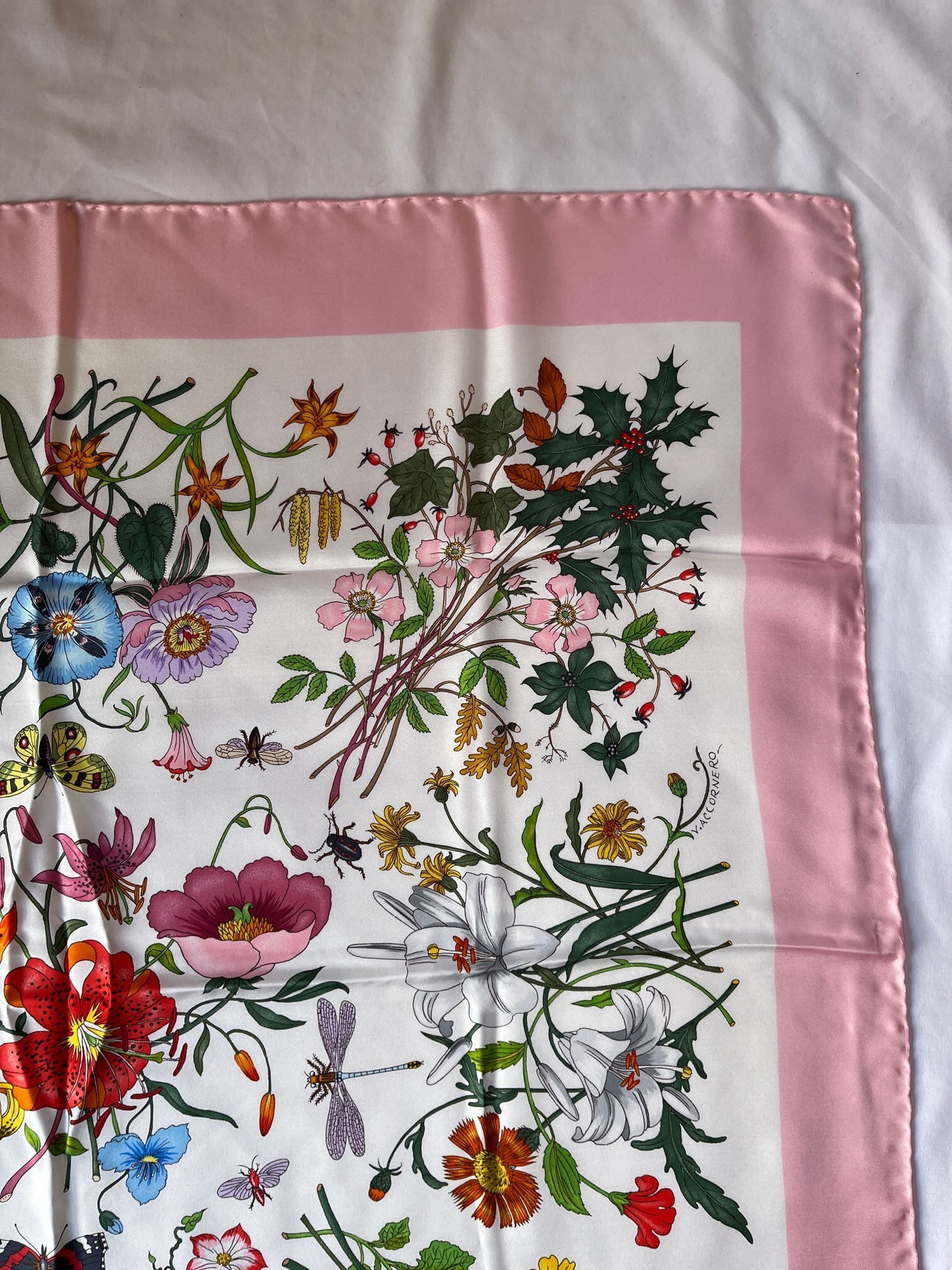 ホワイトにピンクのフチどりがかわいらしいGucel Vintage スカーフ。ユリやチューリップ、アサガオなどの美しい花々が咲き誇る絵柄☆ ハリのあるSilk 素材で手触りの良さも魅力的です。