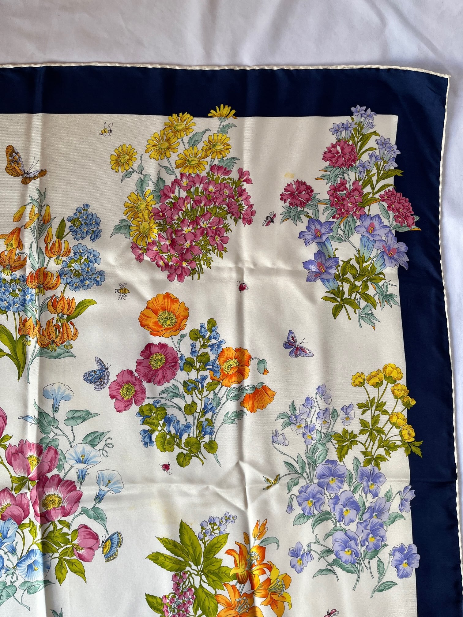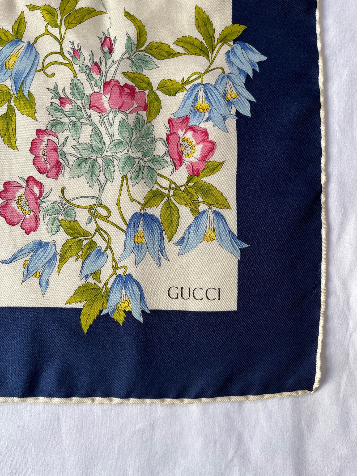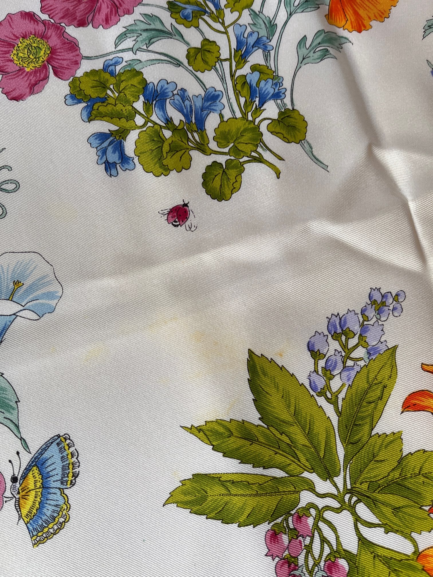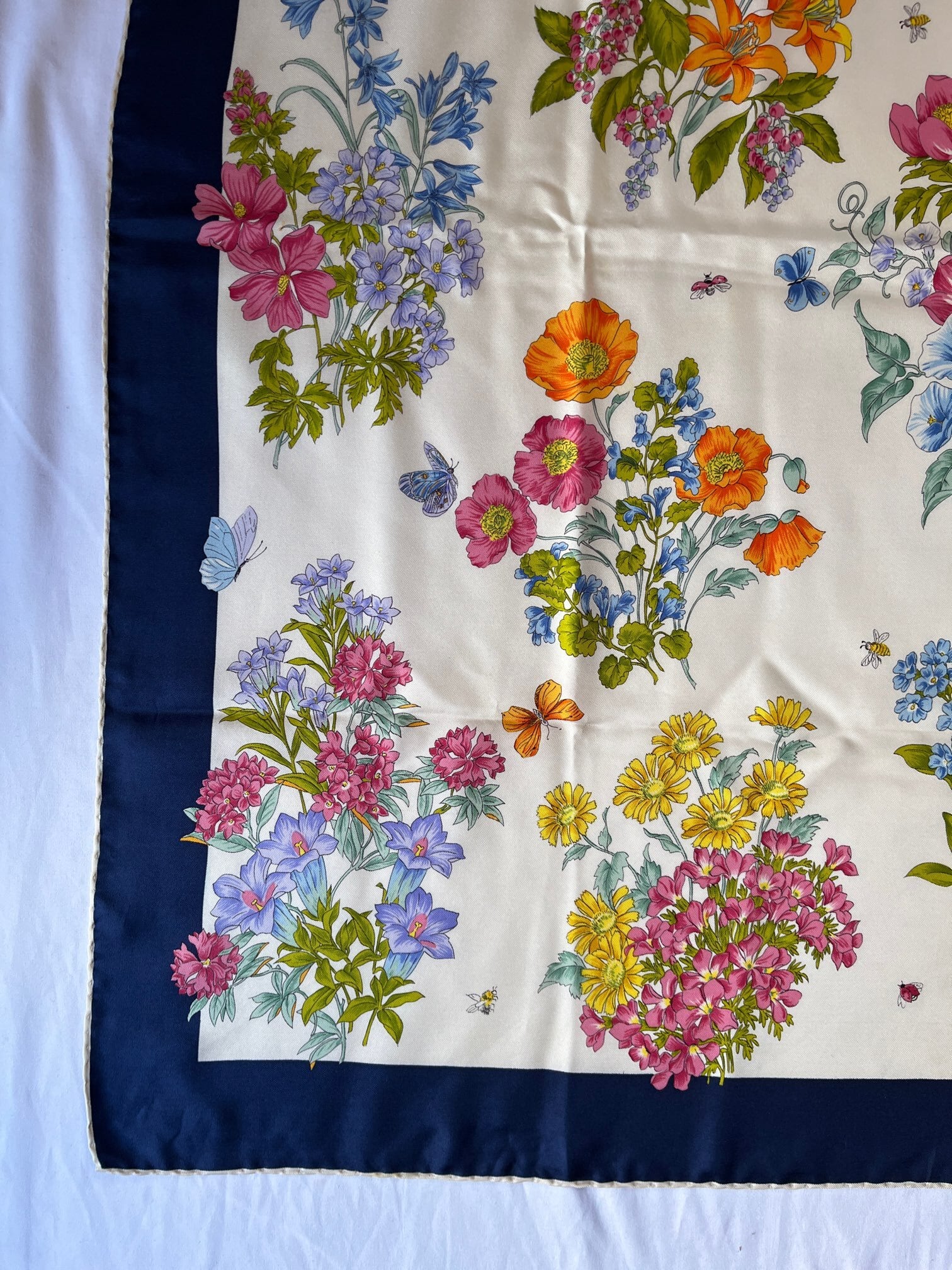 オフホワイトにネイビーのフチドリがさわやかなGUCCI Vintage スカーフ。色鮮やかな花々にチョウやてんとう虫など華やかなモチーフが魅力的。とろんとした質感で滑らかな手肌が魅力の一品です。