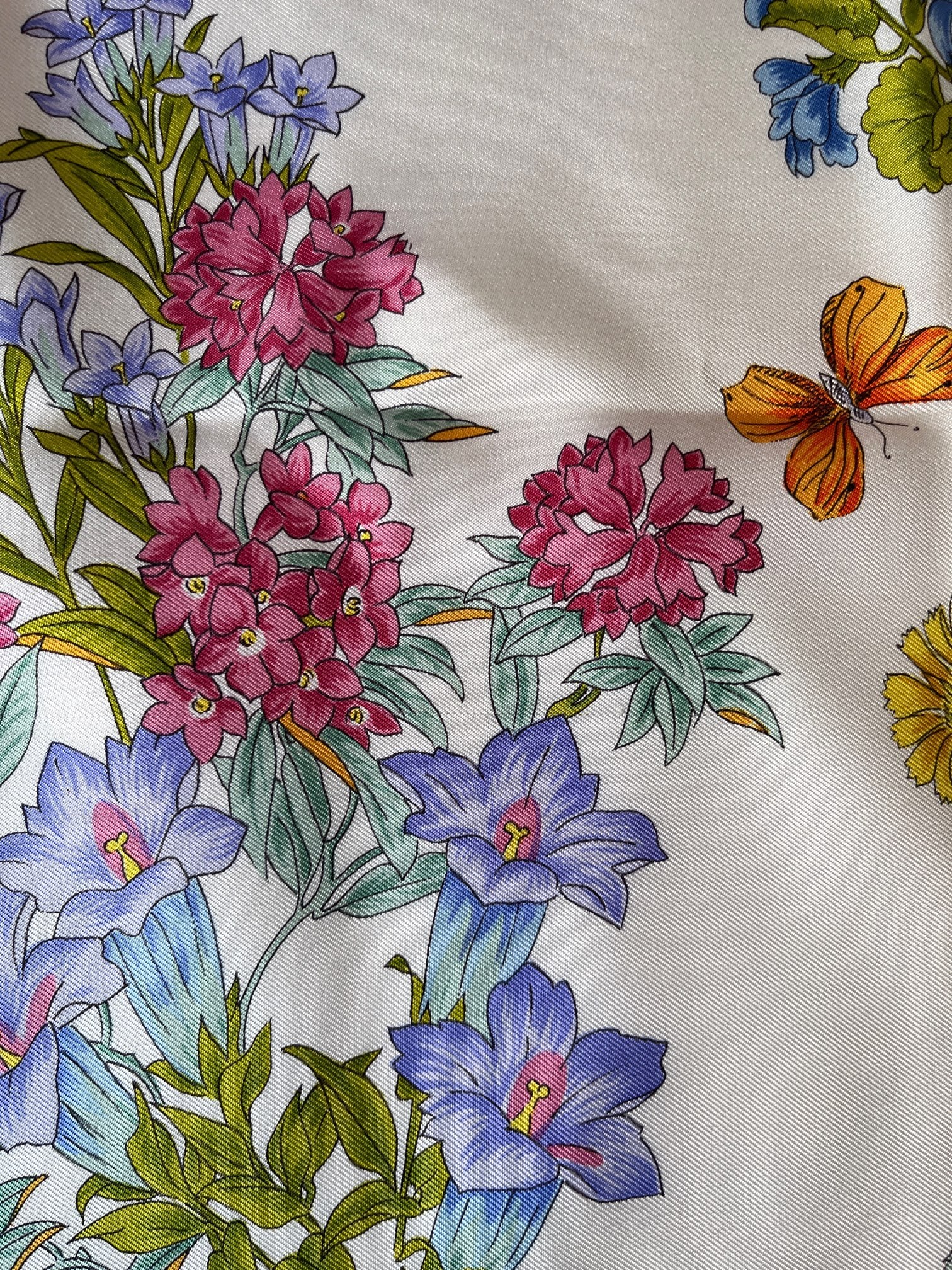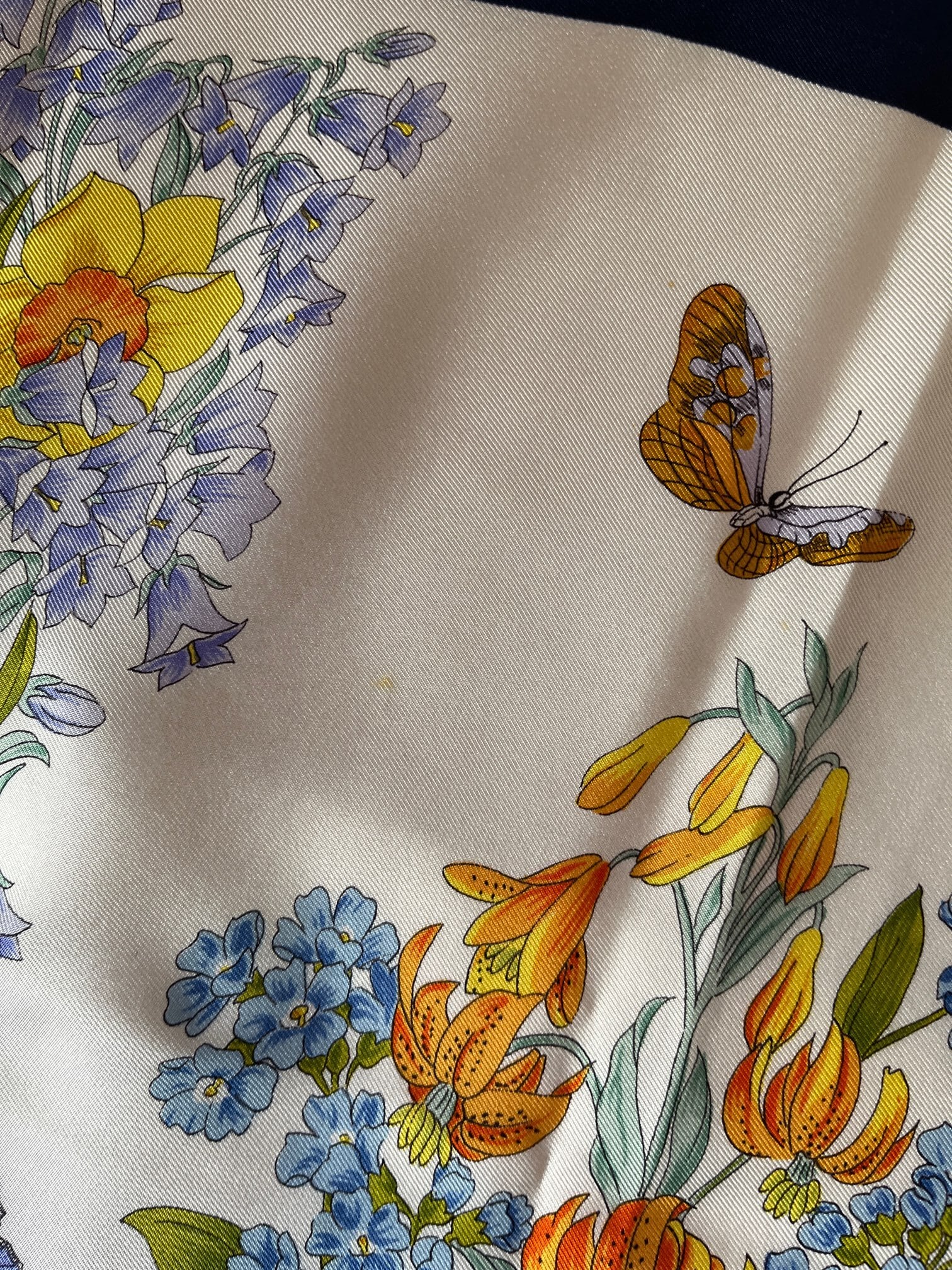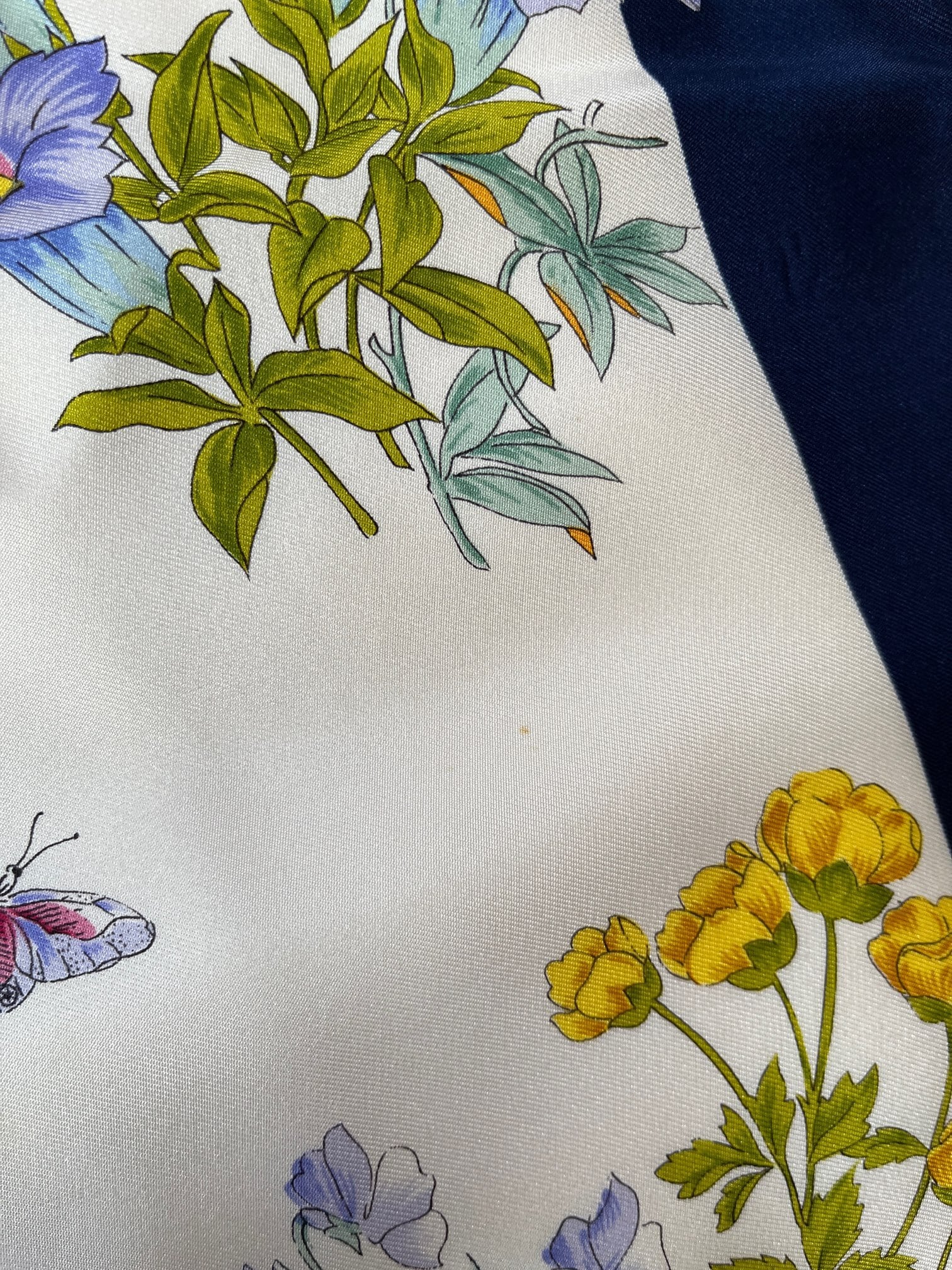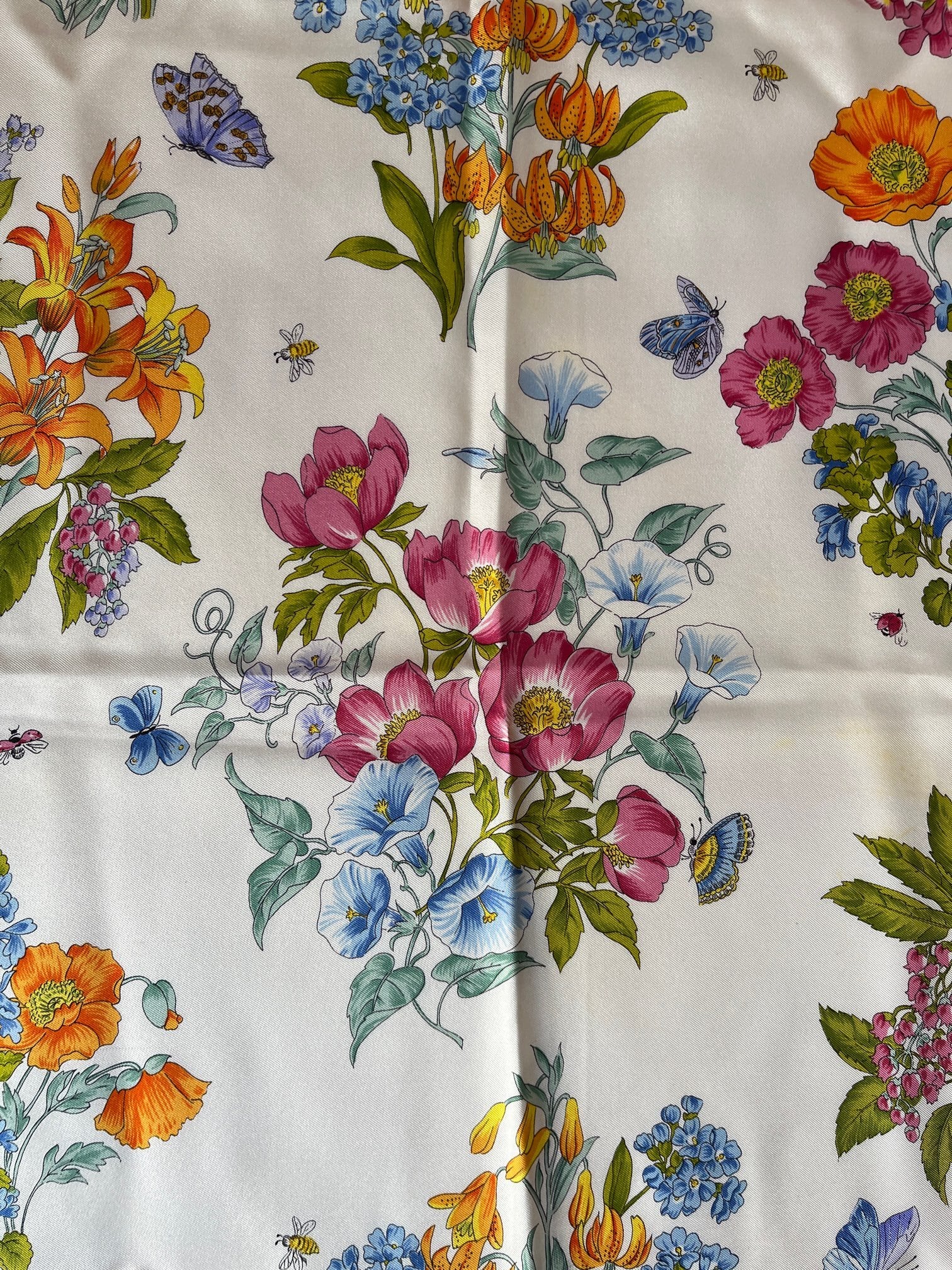 オフホワイトにネイビーのフチドリがさわやかなGUCCI Vintage スカーフ。色鮮やかな花々にチョウやてんとう虫など華やかなモチーフが魅力的。とろんとした質感で滑らかな手肌が魅力の一品です。