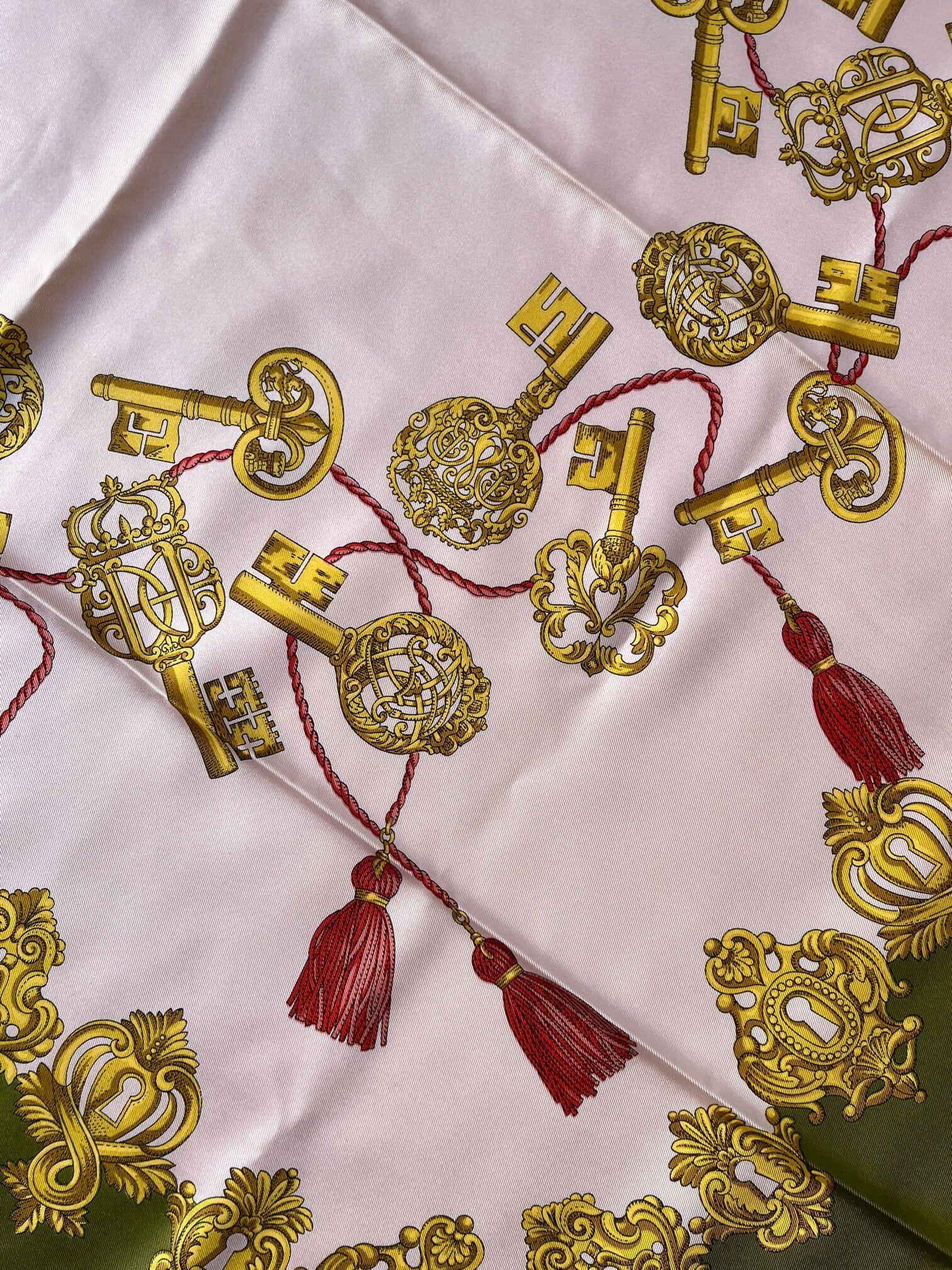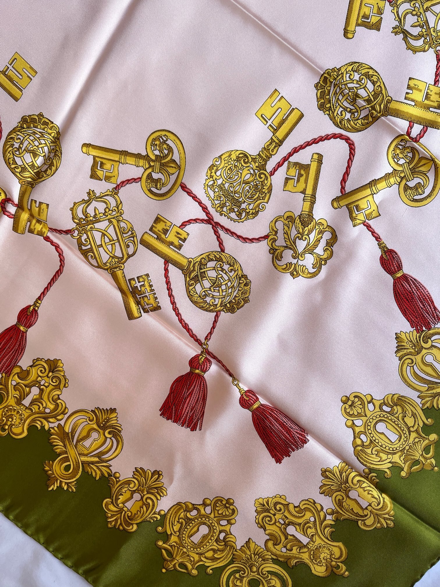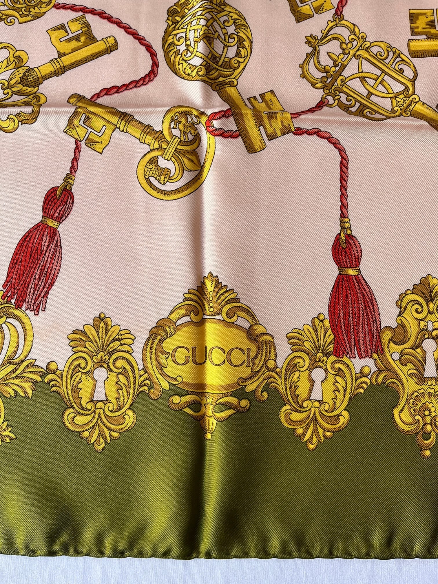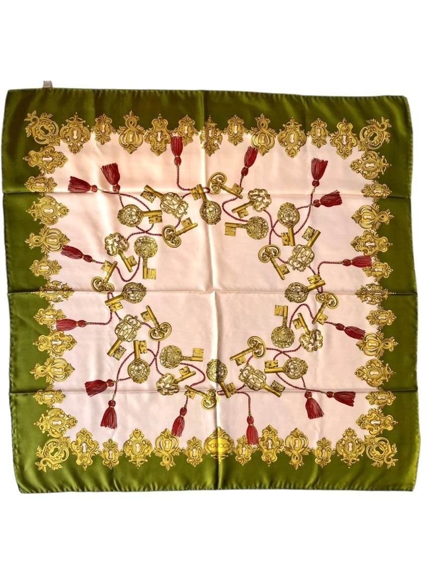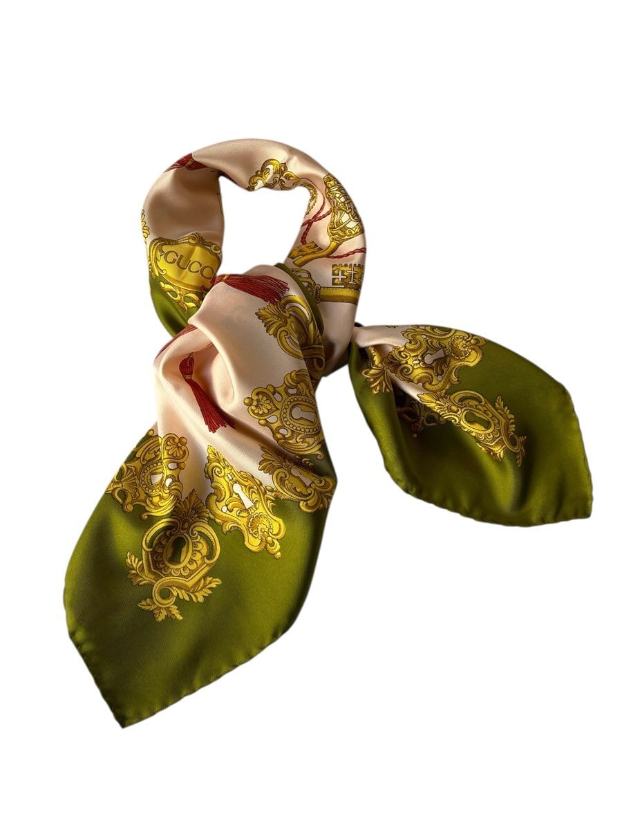 キーモチーフがユニークなGUCCI Vintageスカーフ。ペールピンクのベースにカーキのフチドリがエッジの効いたカラーリング。