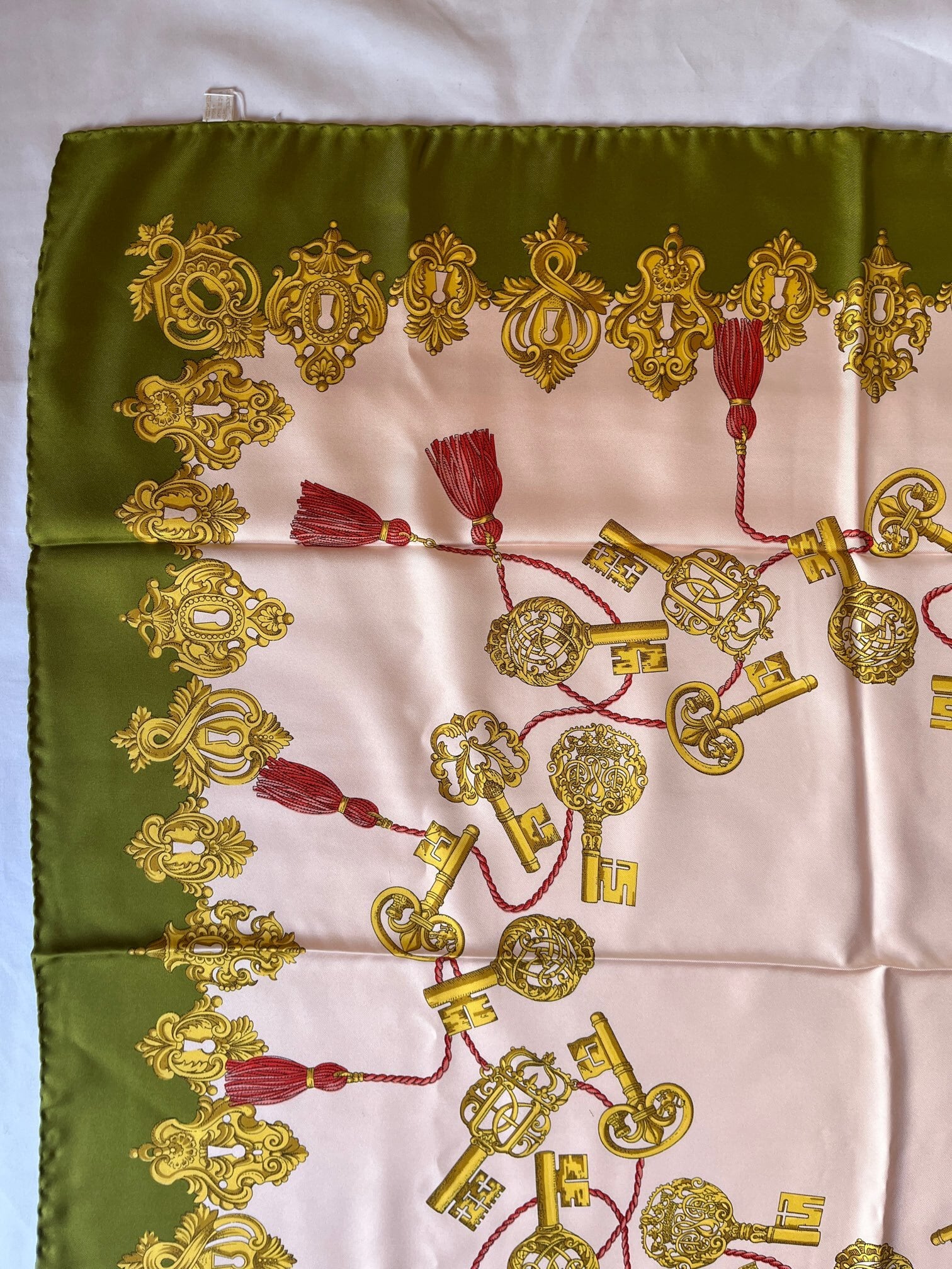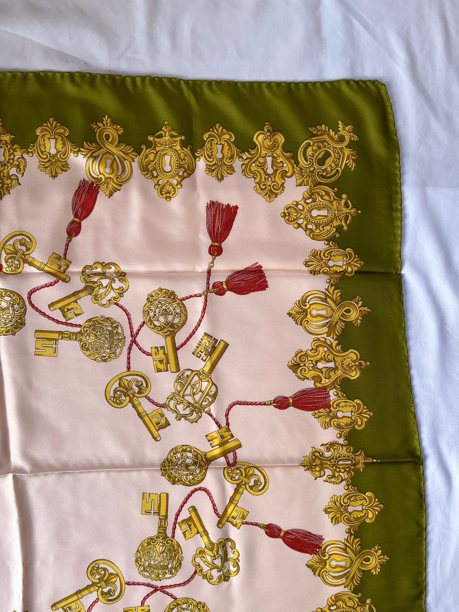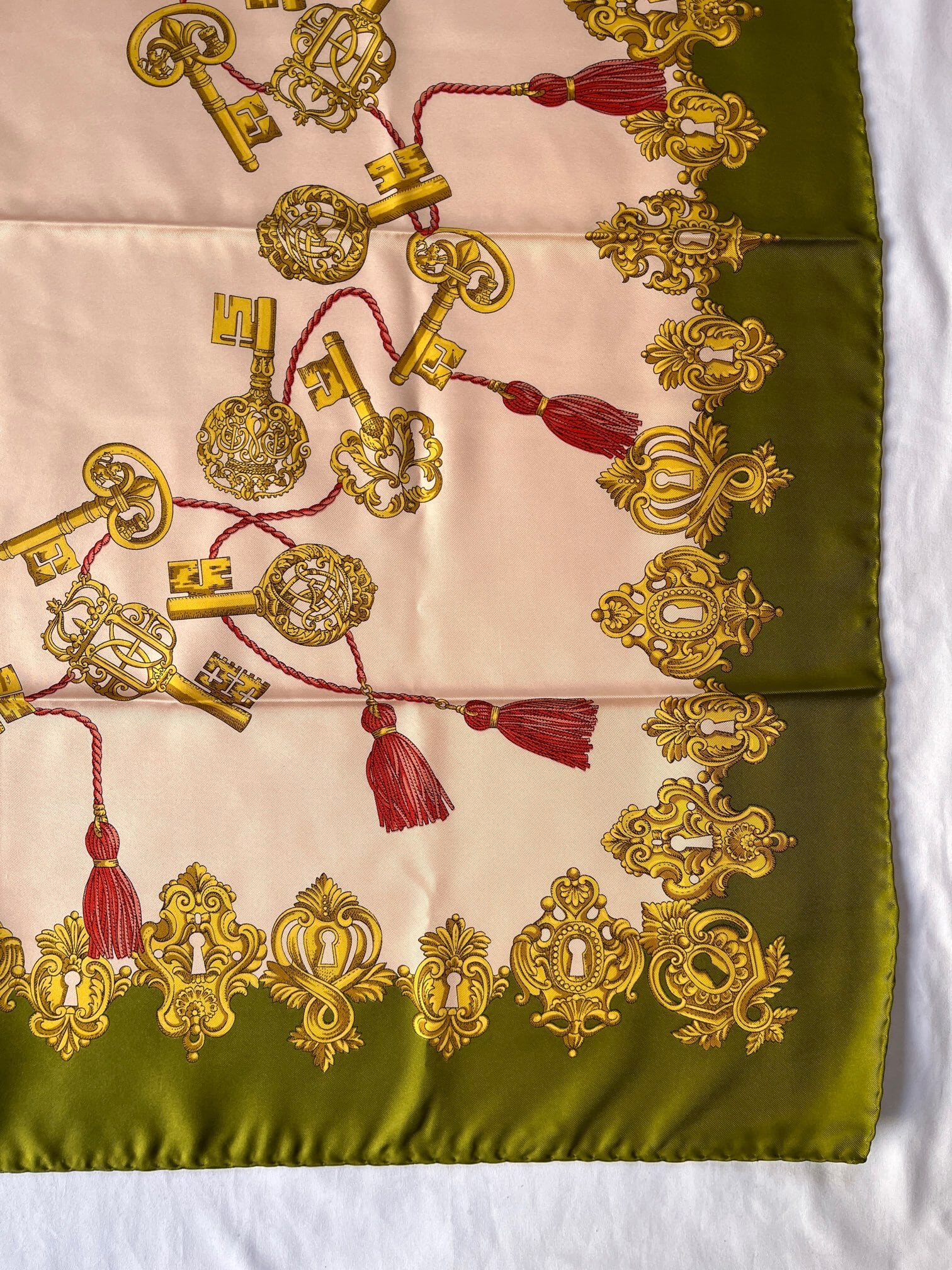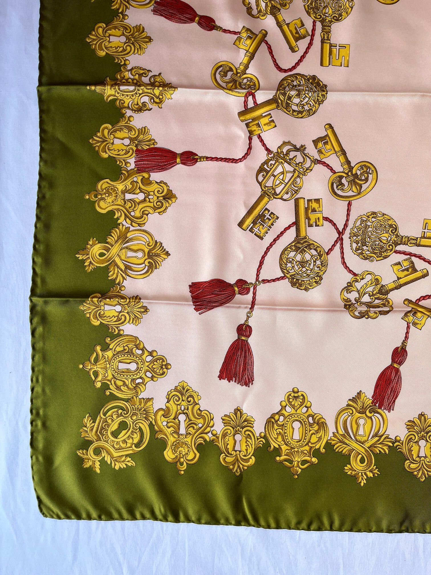 キーモチーフがユニークなGUCCI Vintageスカーフ。ペールピンクのベースにカーキのフチドリがエッジの効いたカラーリング。
