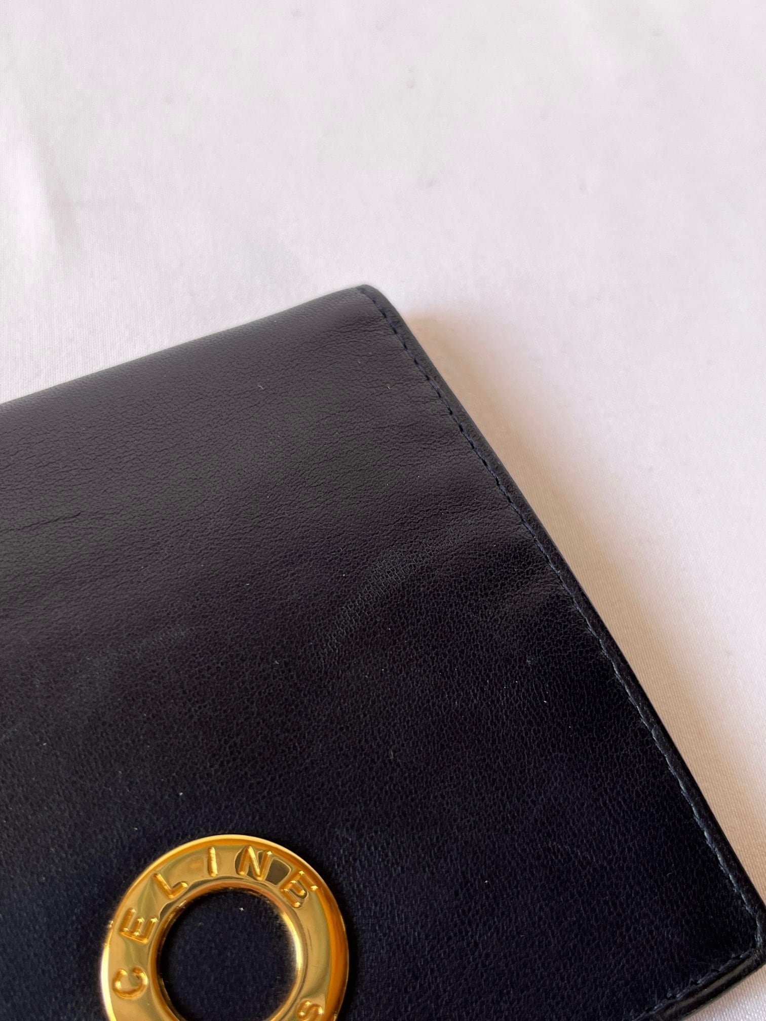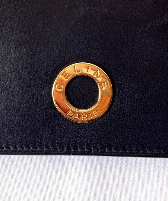 ネイビーのレザー地にゴールドのサークルロゴが映えるCeline 80's Vintage おりたたみ財布。