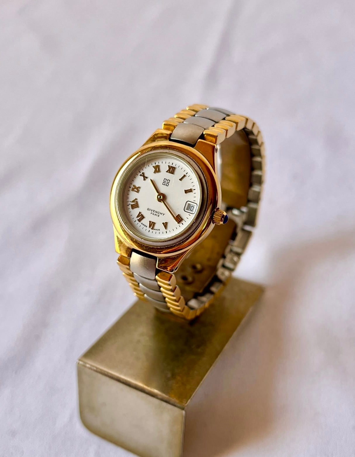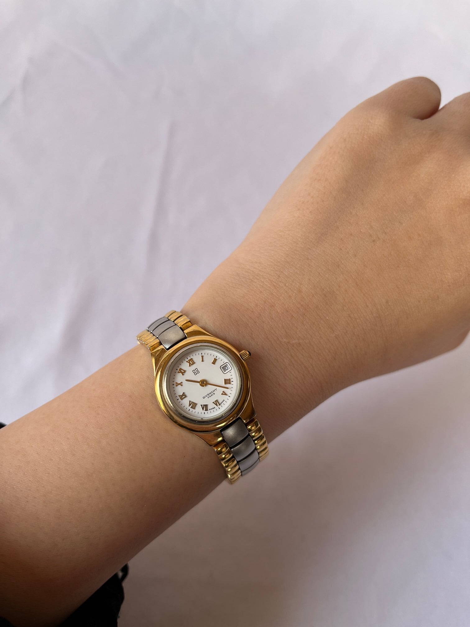 ホワイトの文字盤がさわやかなGivenchy vintage腕時計。マットな質感のシルバーとつやのあるゴールドメタルのベルトがエレガントなデザイン。デイト(日付)入りで機能面も優れた一品です。