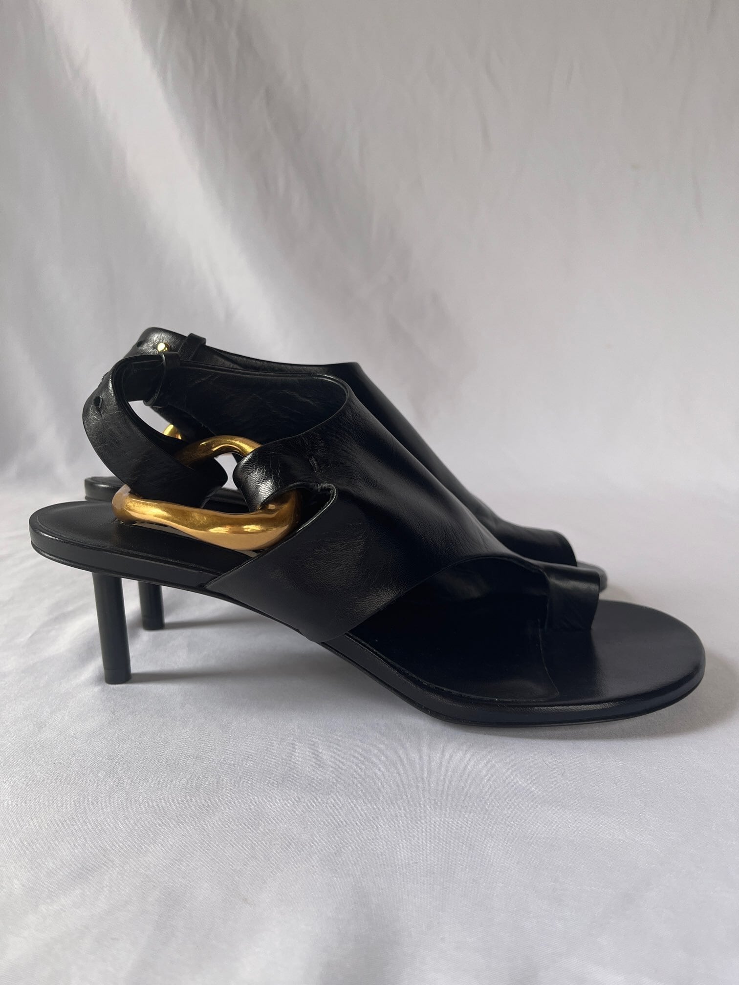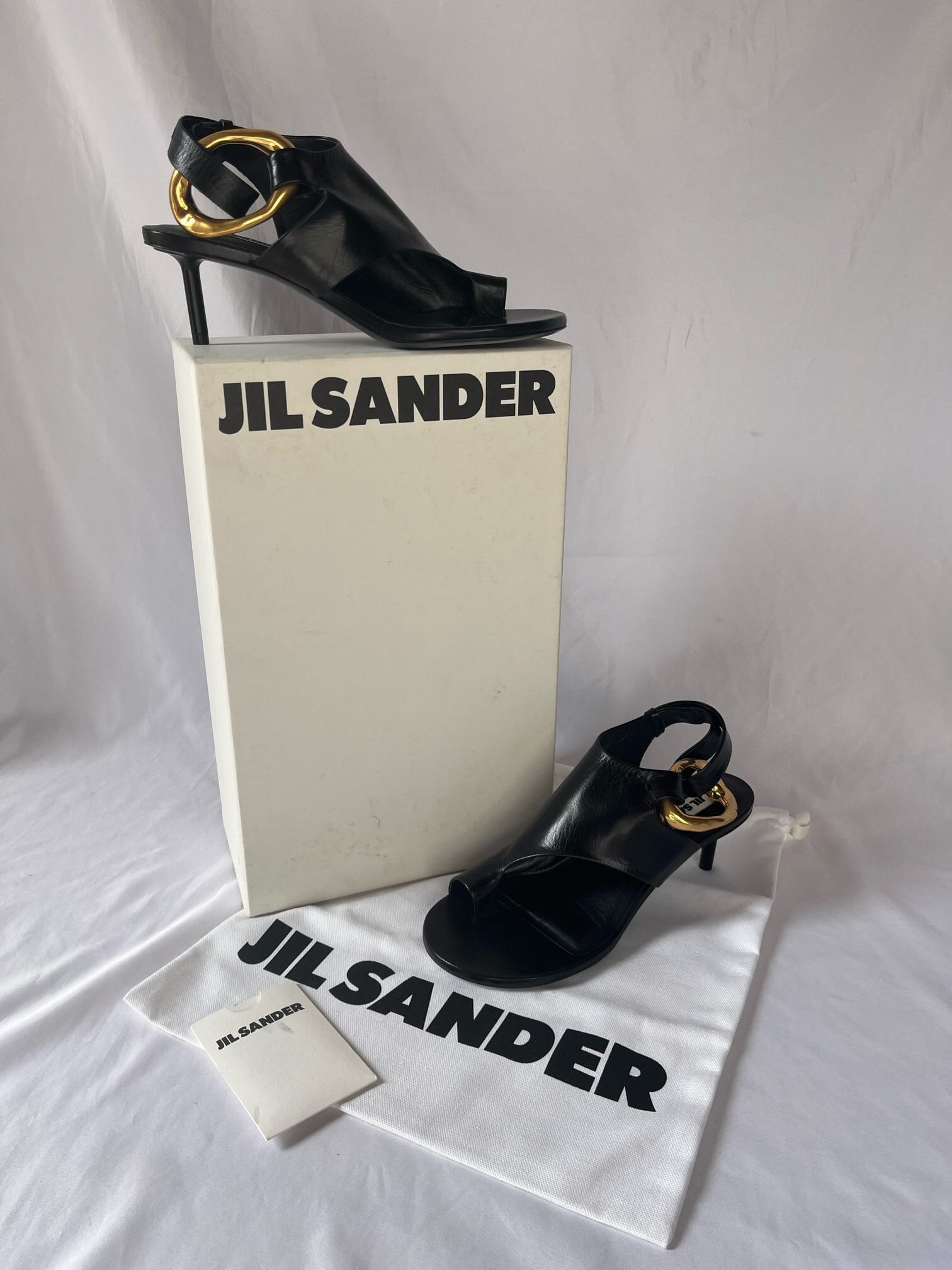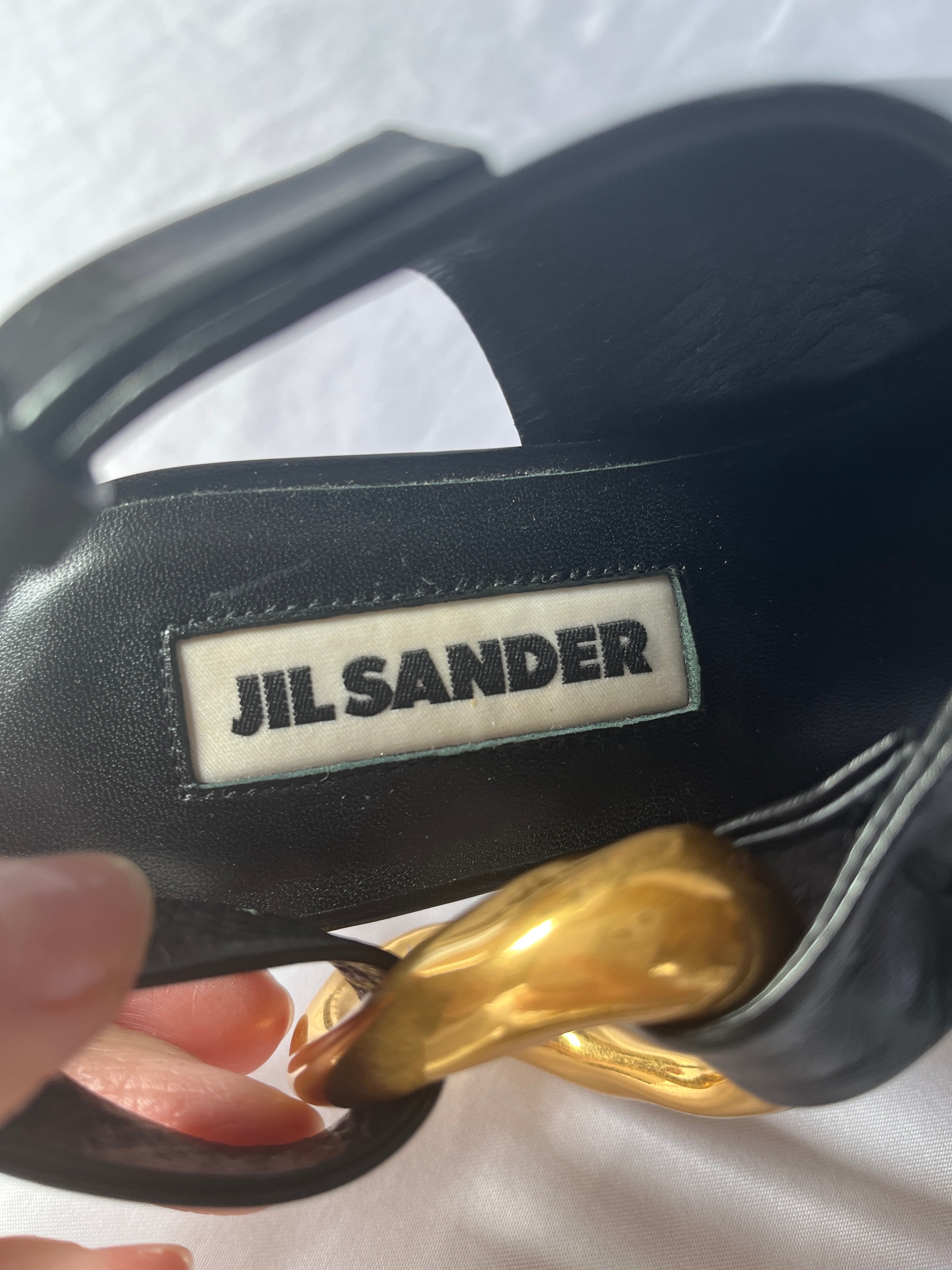 JIL SANDAR “Black Leather”Gold Metal Sandals with Box
