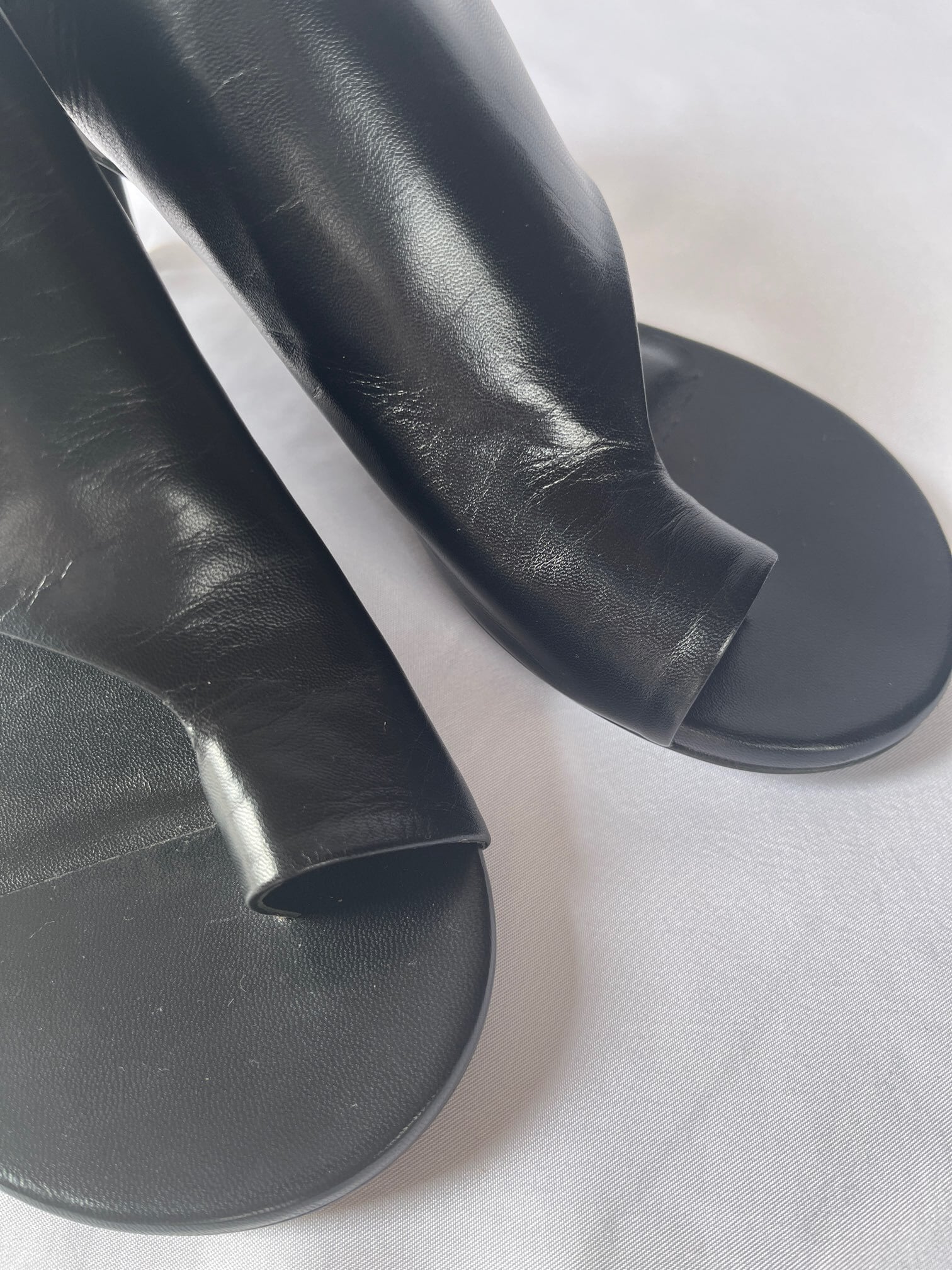 ブラックレザーにゴールドのうねりのあるメタル金具が アクセントに効いたJIL SANDERのトングサンダル。甲を優しく包み込むようなデザインがエレガントな印象。ピンヒールとのバランス感が絶妙な一品です。