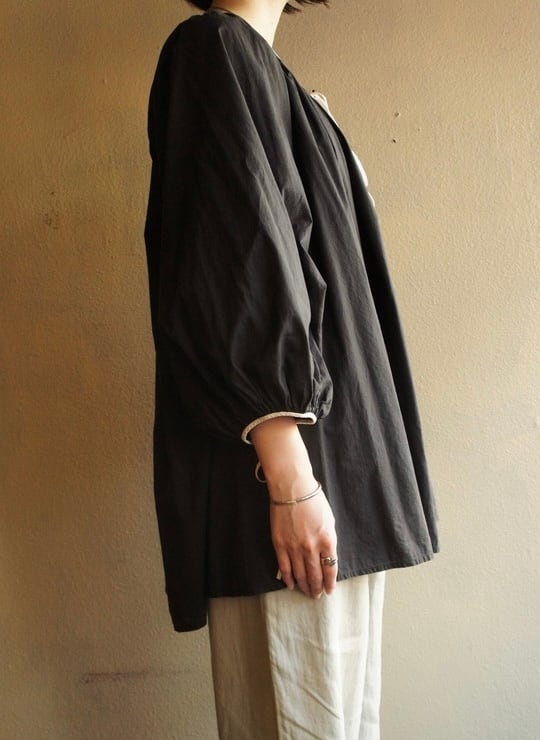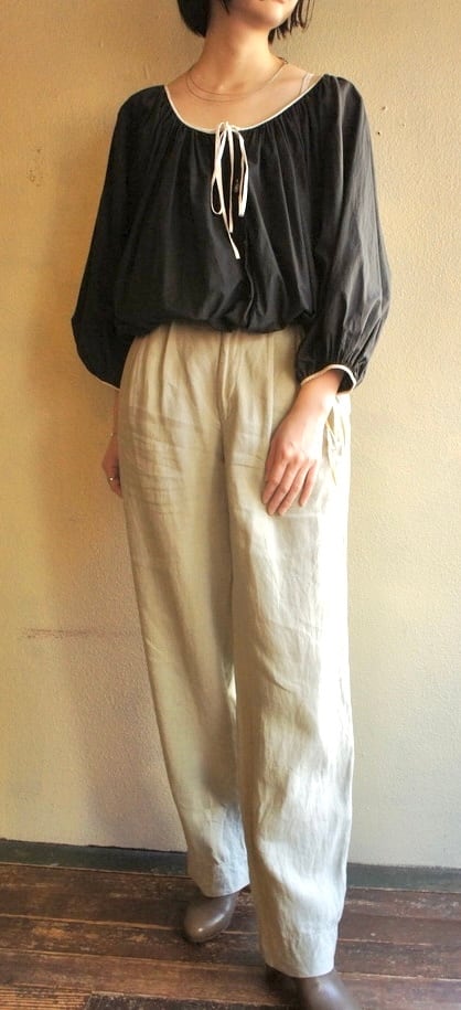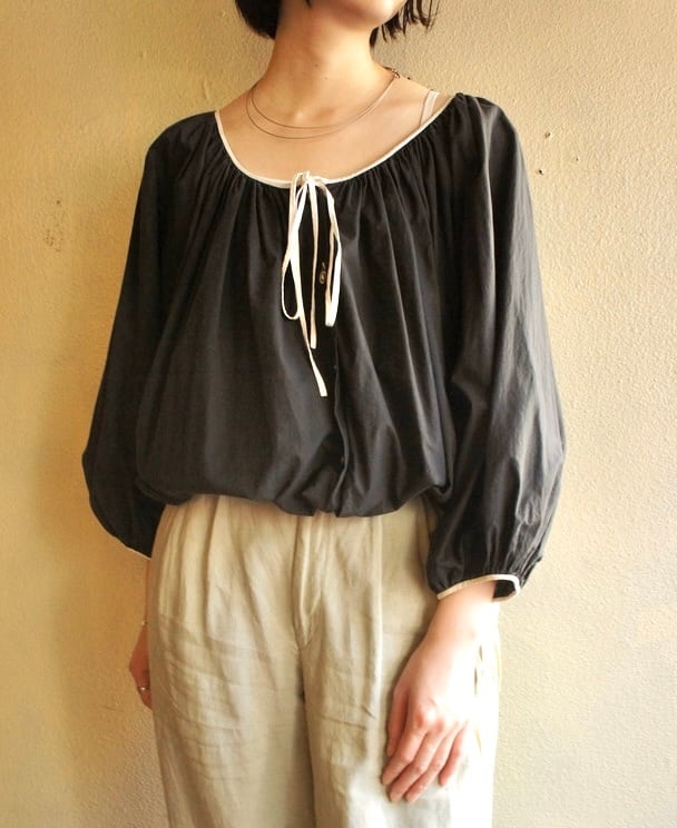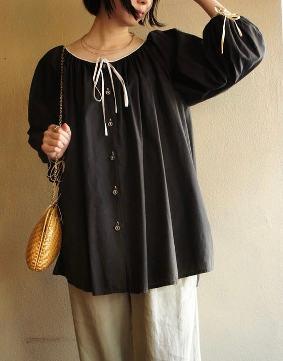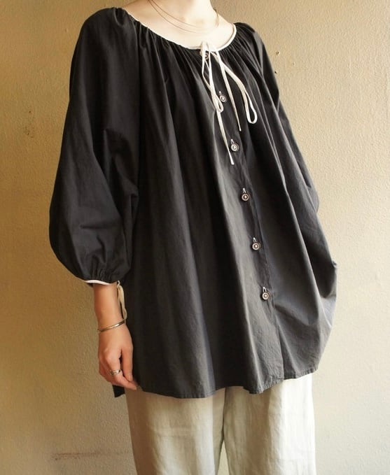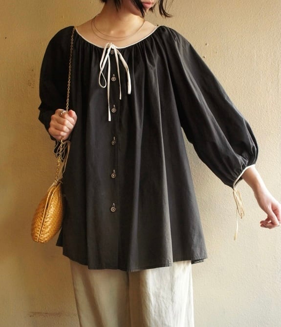ギャザーのたっぷりと入ったふんわりとしたシルエットが女性らしい一枚。