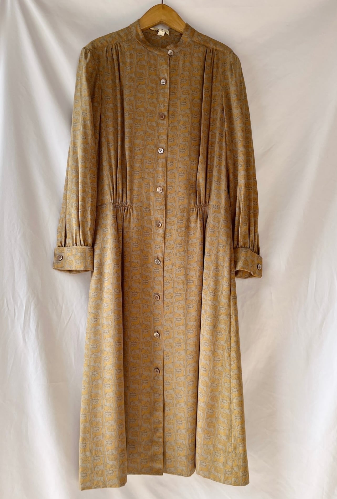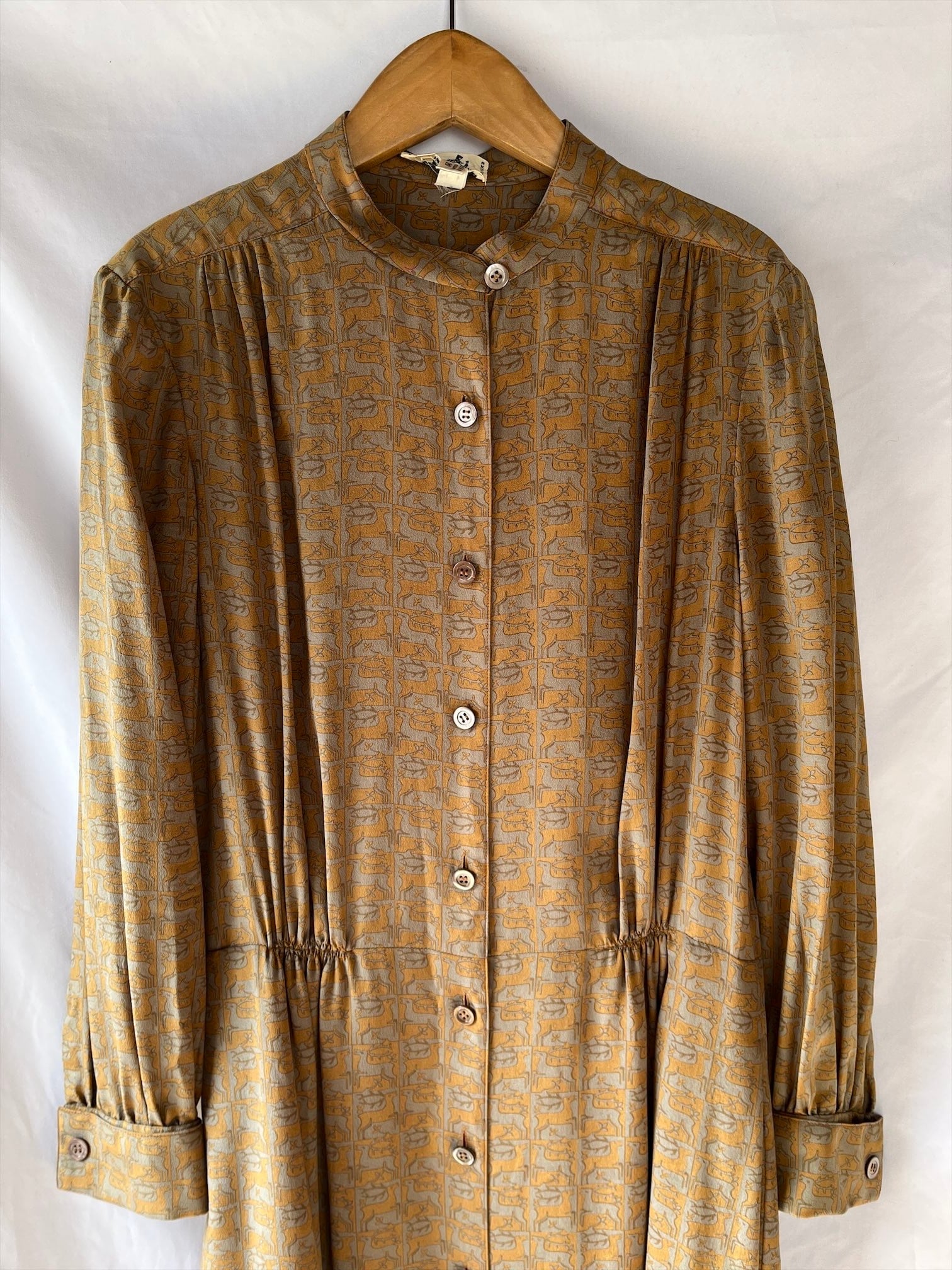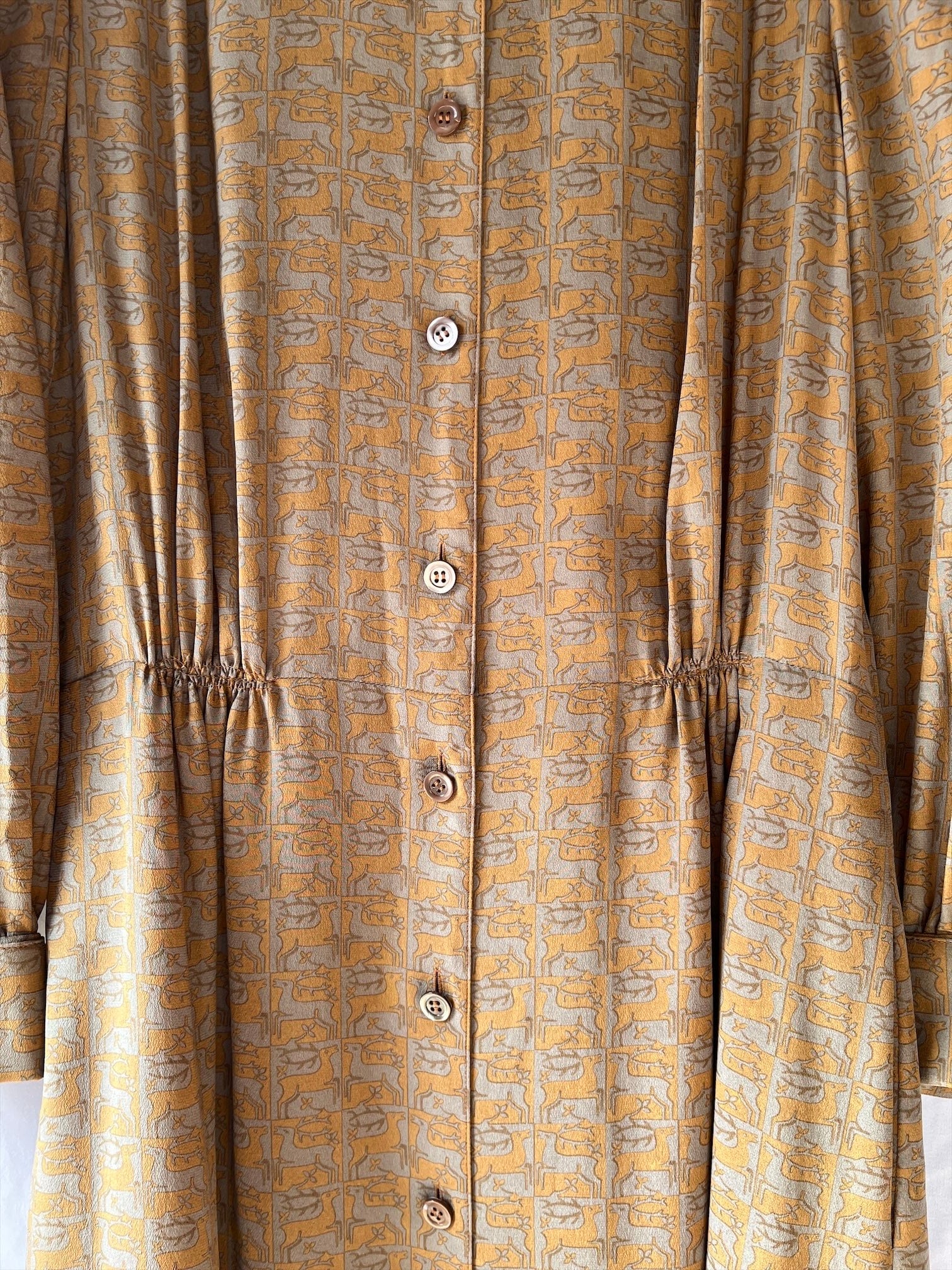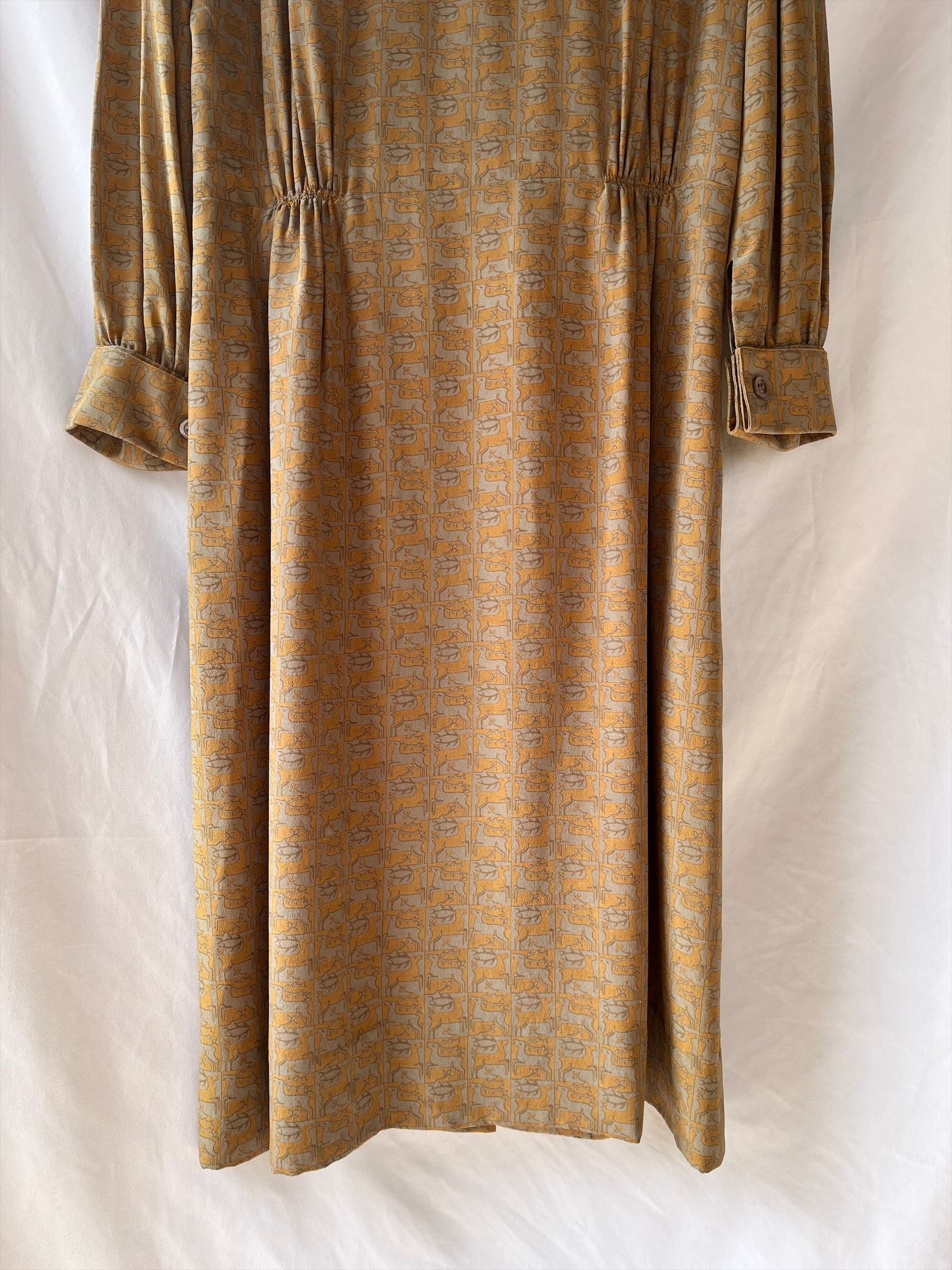 HERMES 80's "Deer Motif"Khaki×Lt.Brown Silk Dress