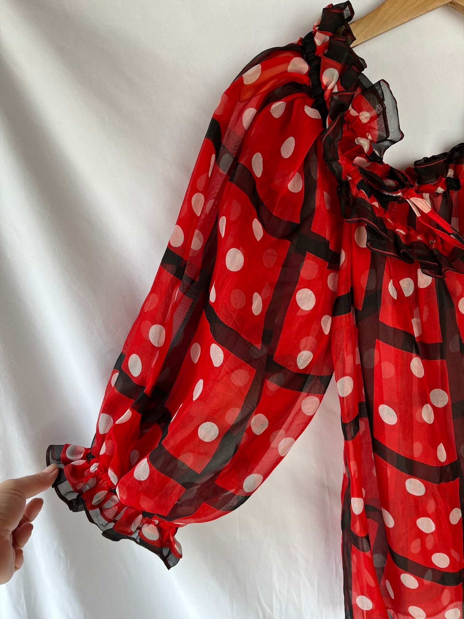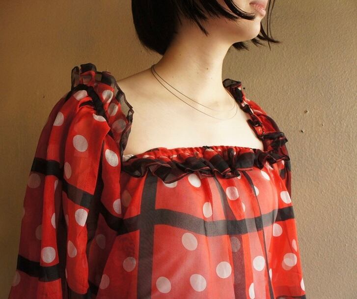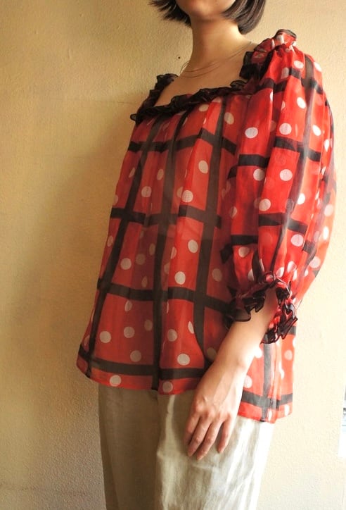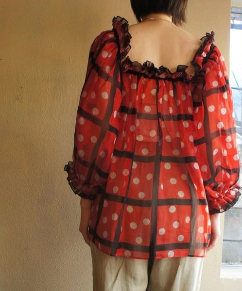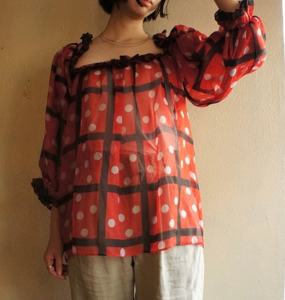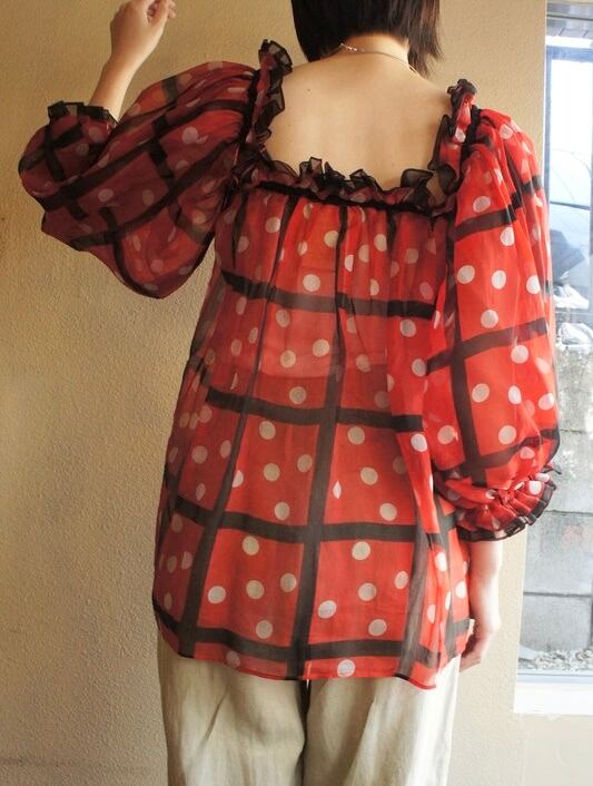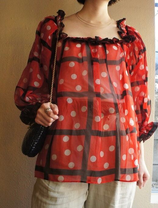 赤いシフォン地に白い水玉と黒いチェックの絵柄がcuteなYSL 70-80's rivegauche vintage ブラウス、レア!。