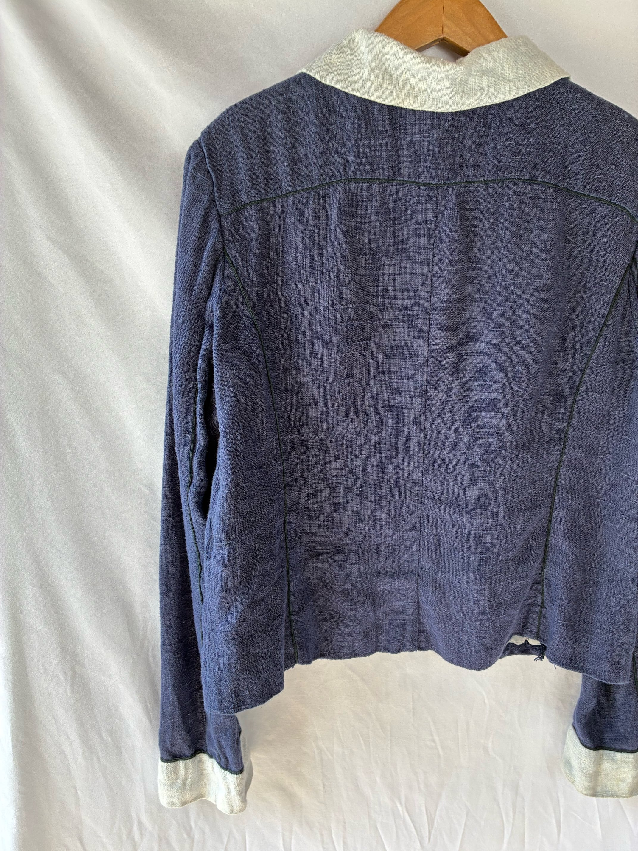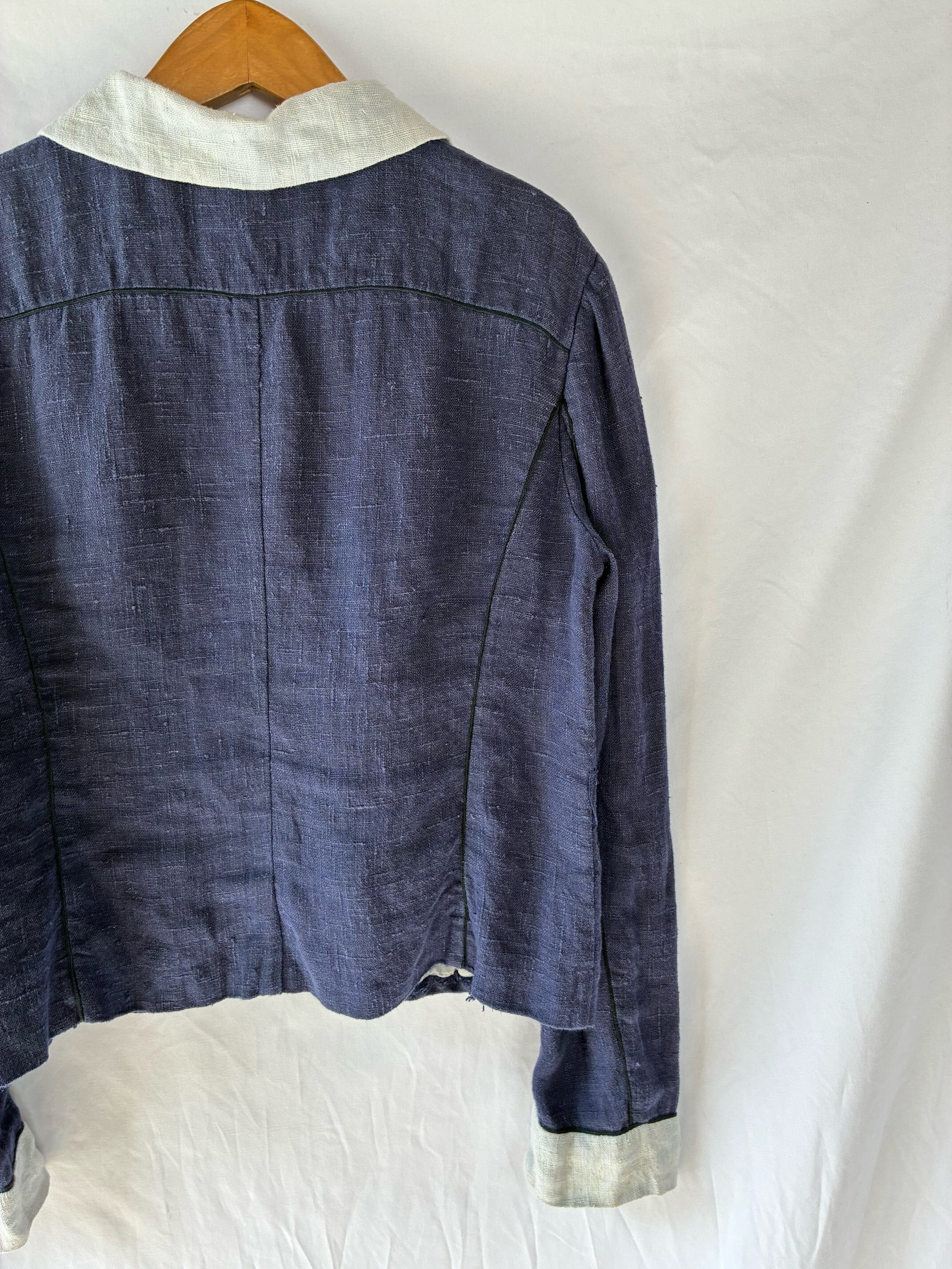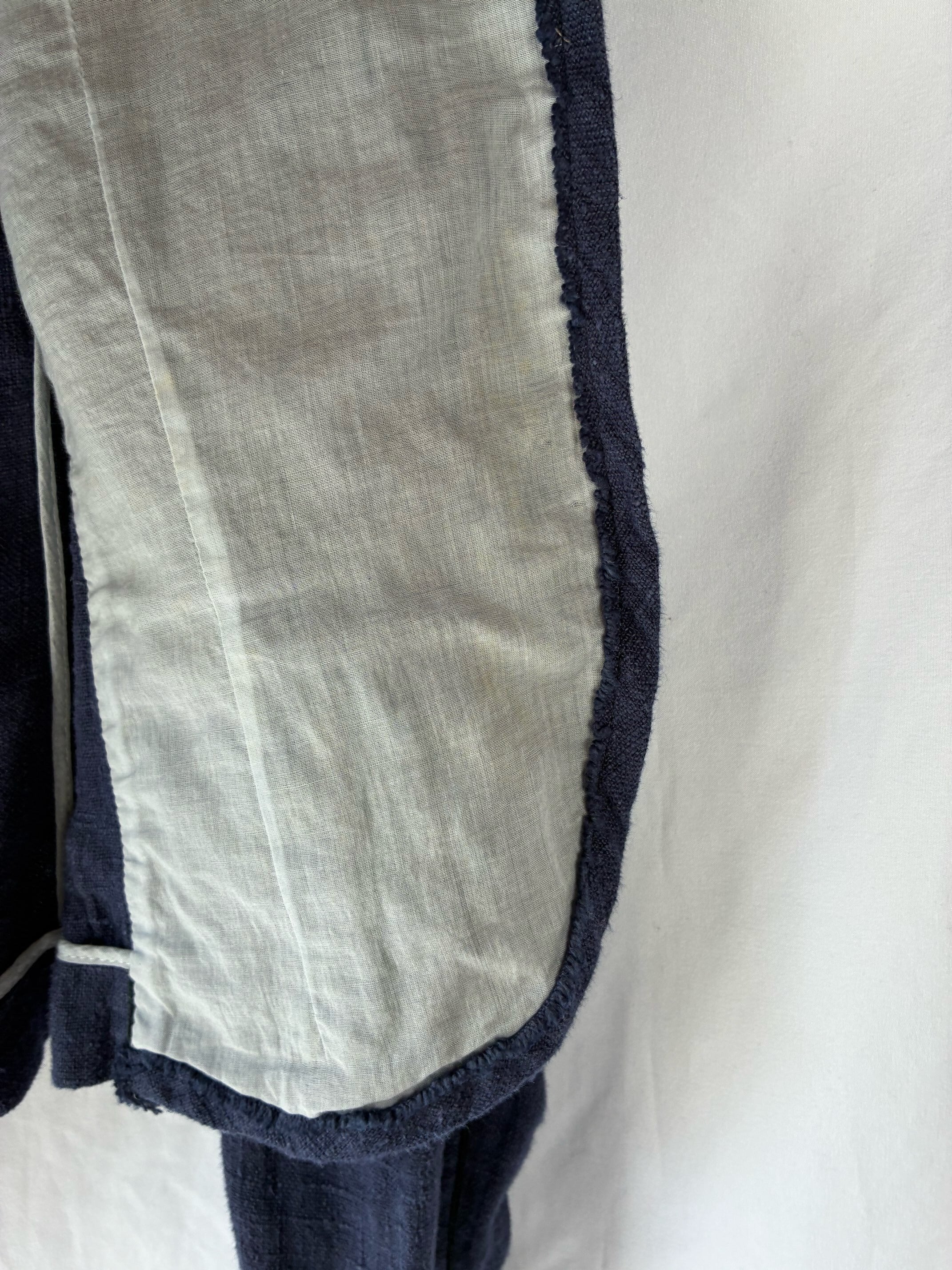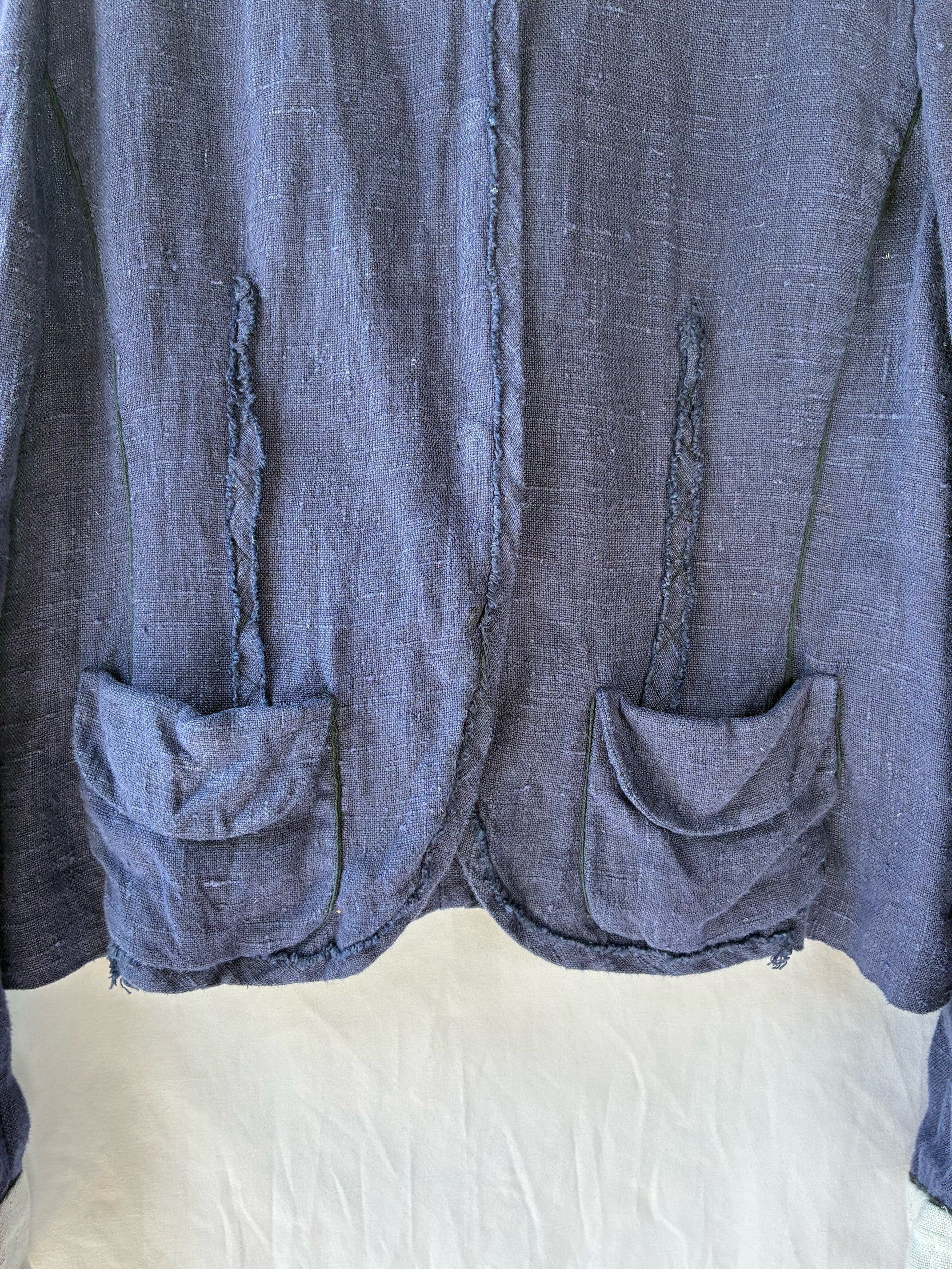 リネンの柔らかい風合いが魅力的。ミニポケットにフリンジ風のパイピングがアクセントに 効いた一枚です。