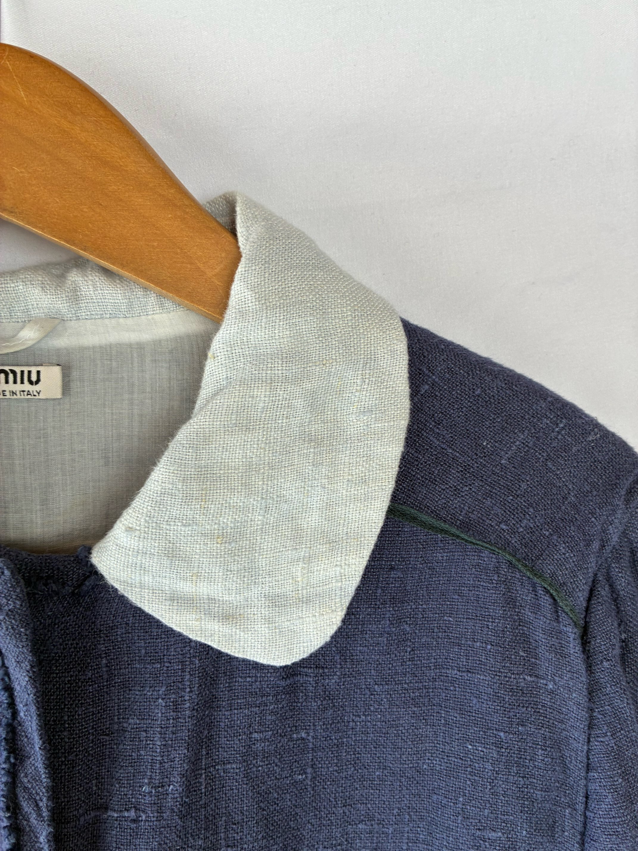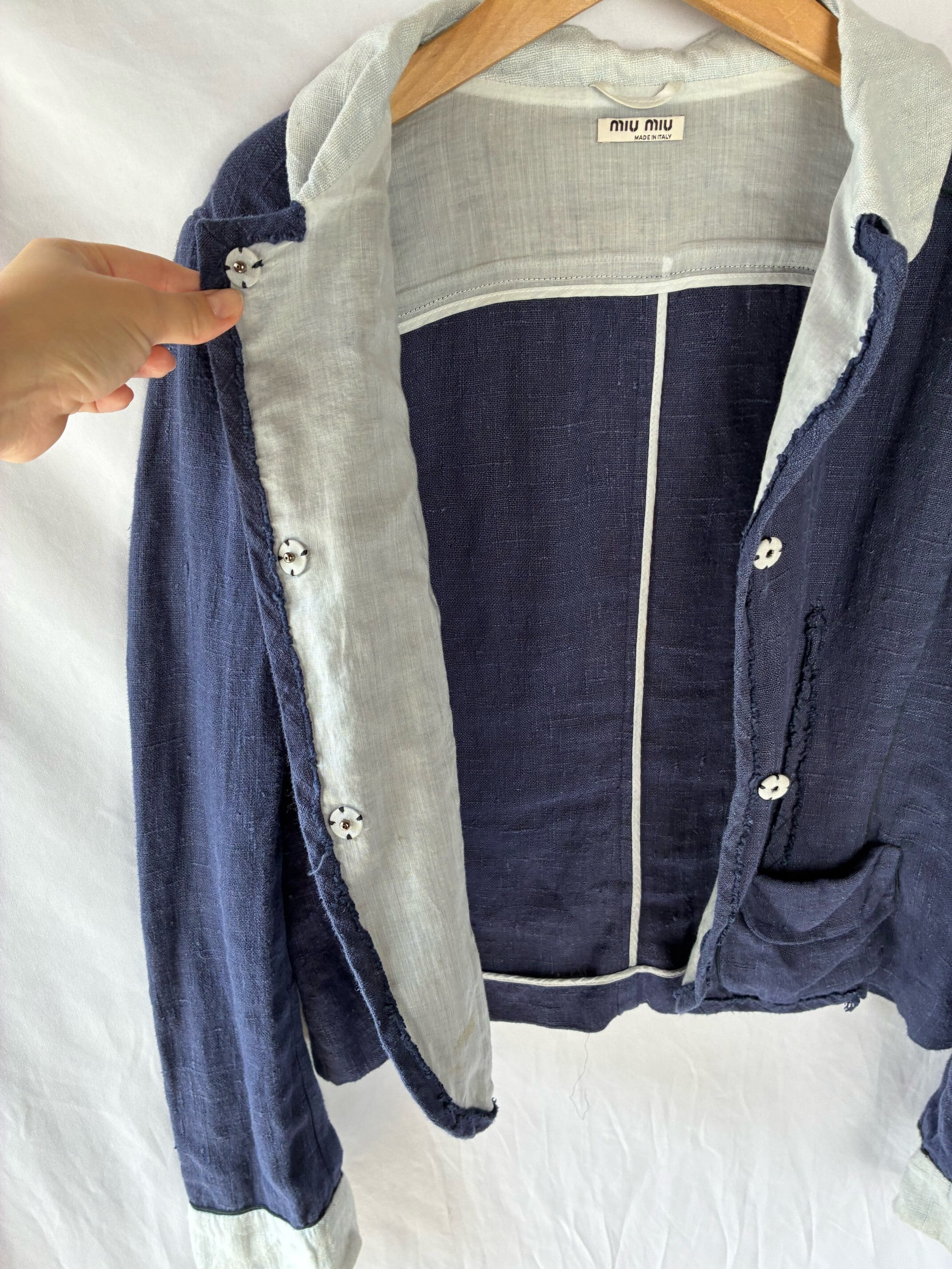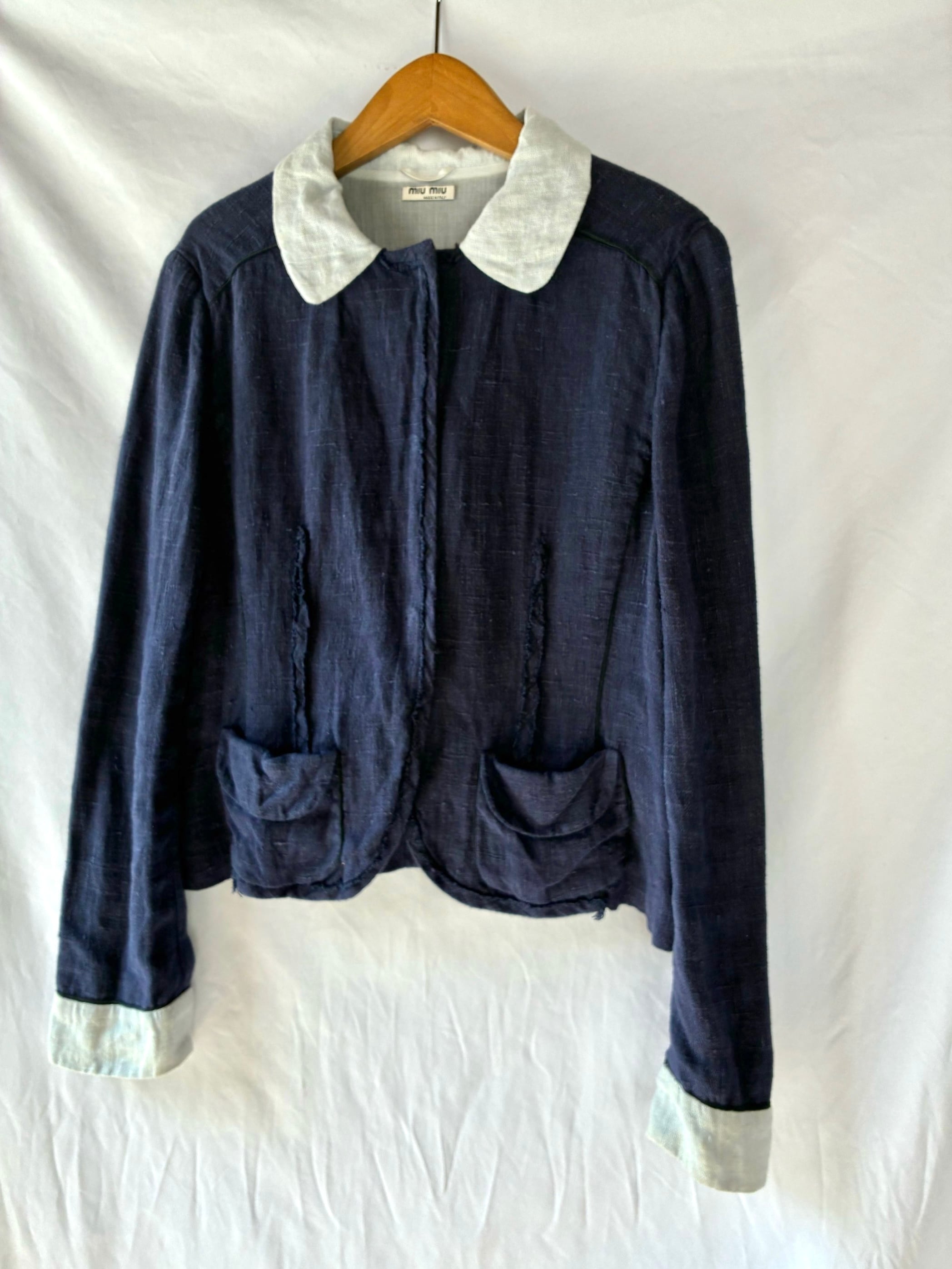 ネイビー×アイスグレーのバイカラーがユニークなmiu miuのジャケット。