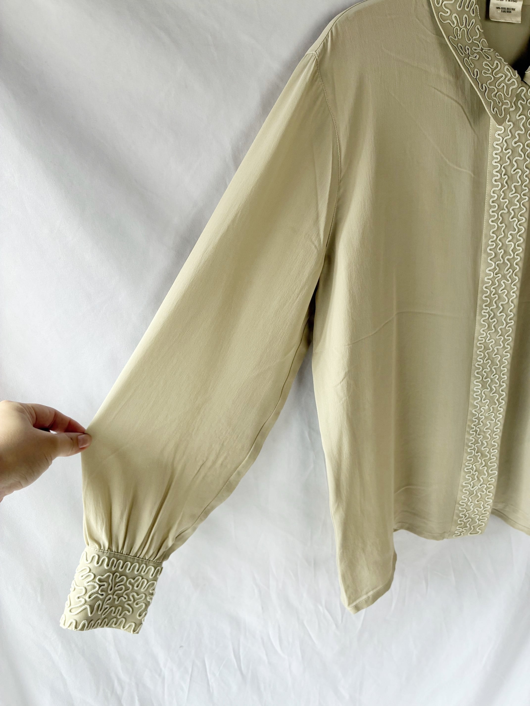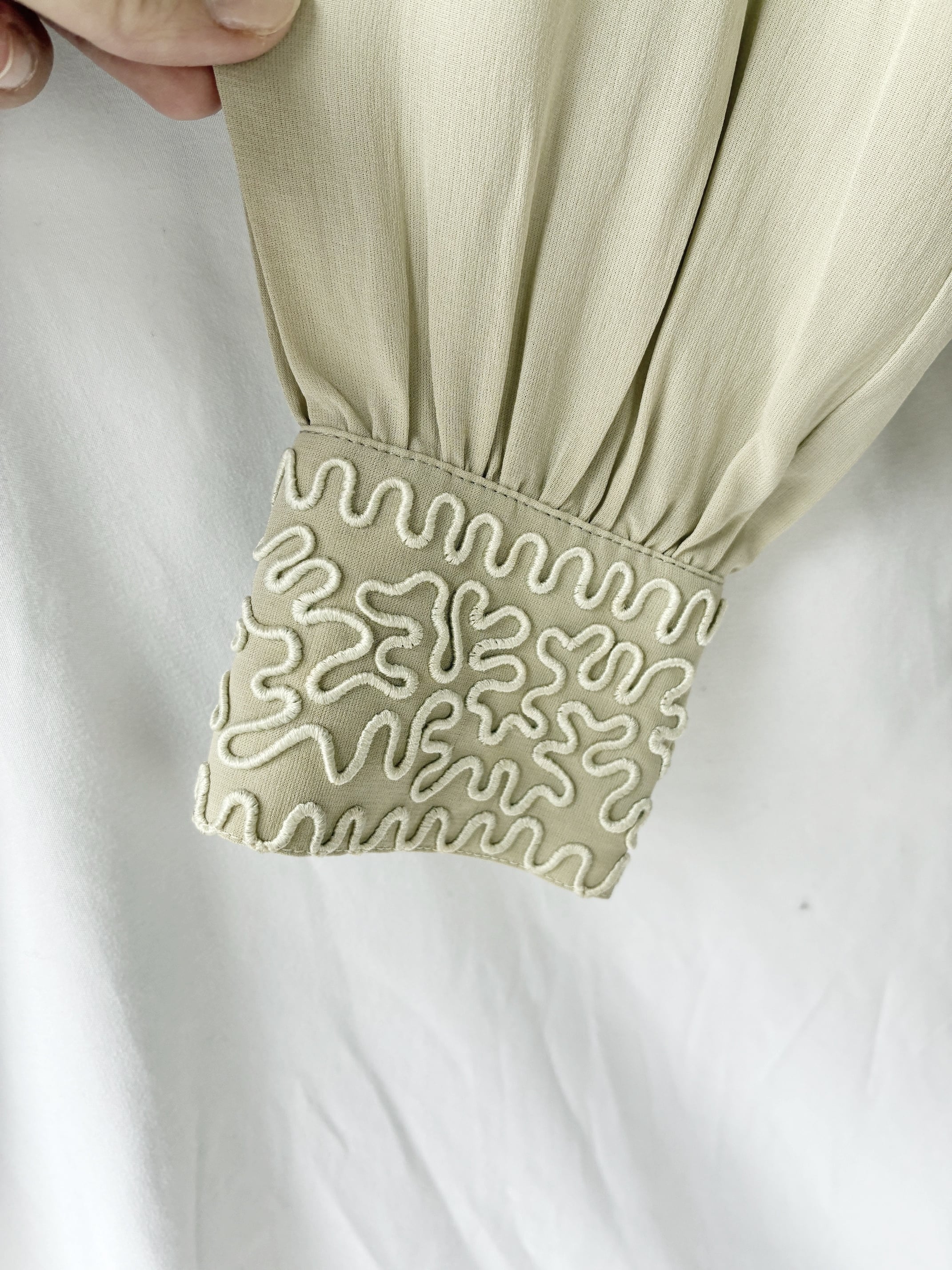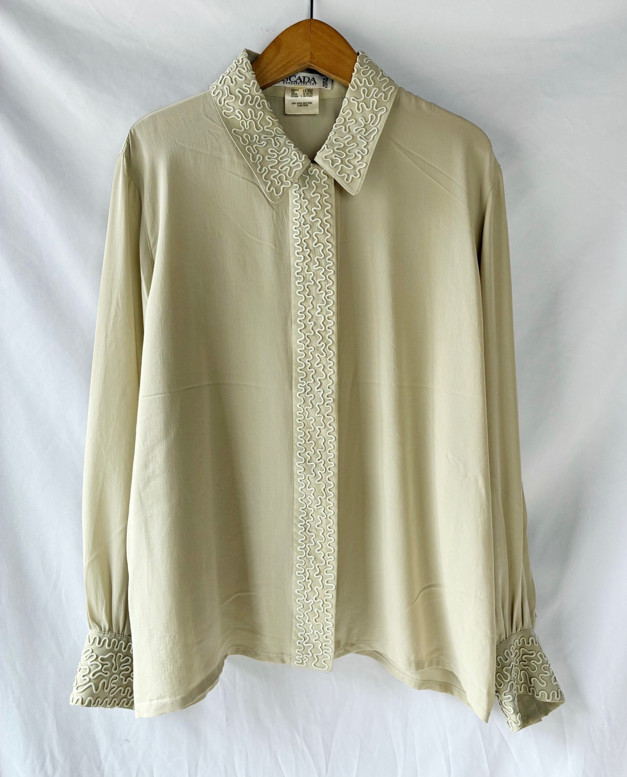 うねりのある刺繍デザインが目をひくESCADA Silk ブラウス。Lt. Khakiの色味がシックで落ちついた印象が魅力的。サラっとしたSilk材で着心地の良い一枚です。