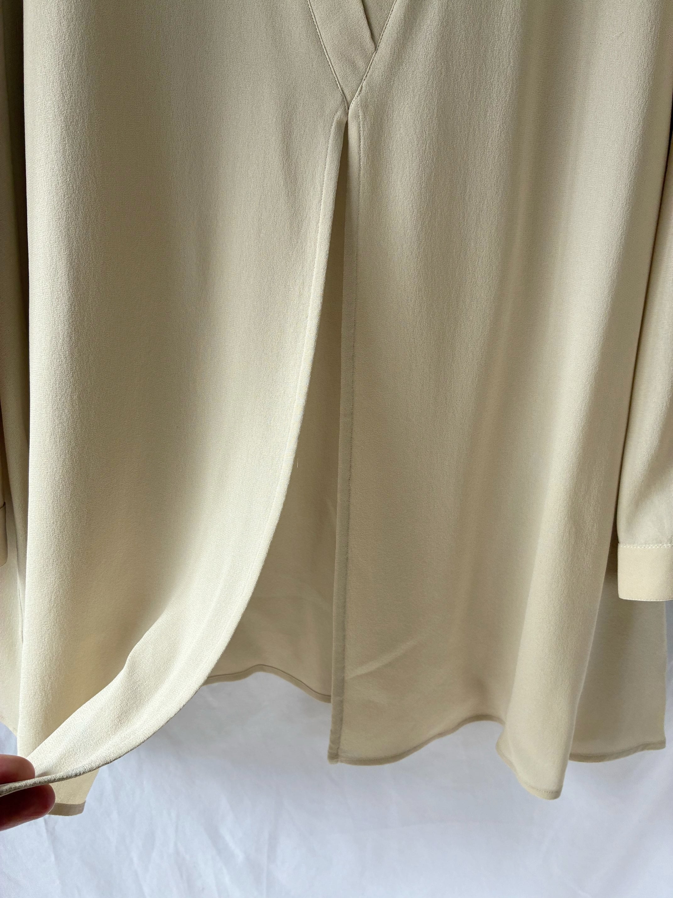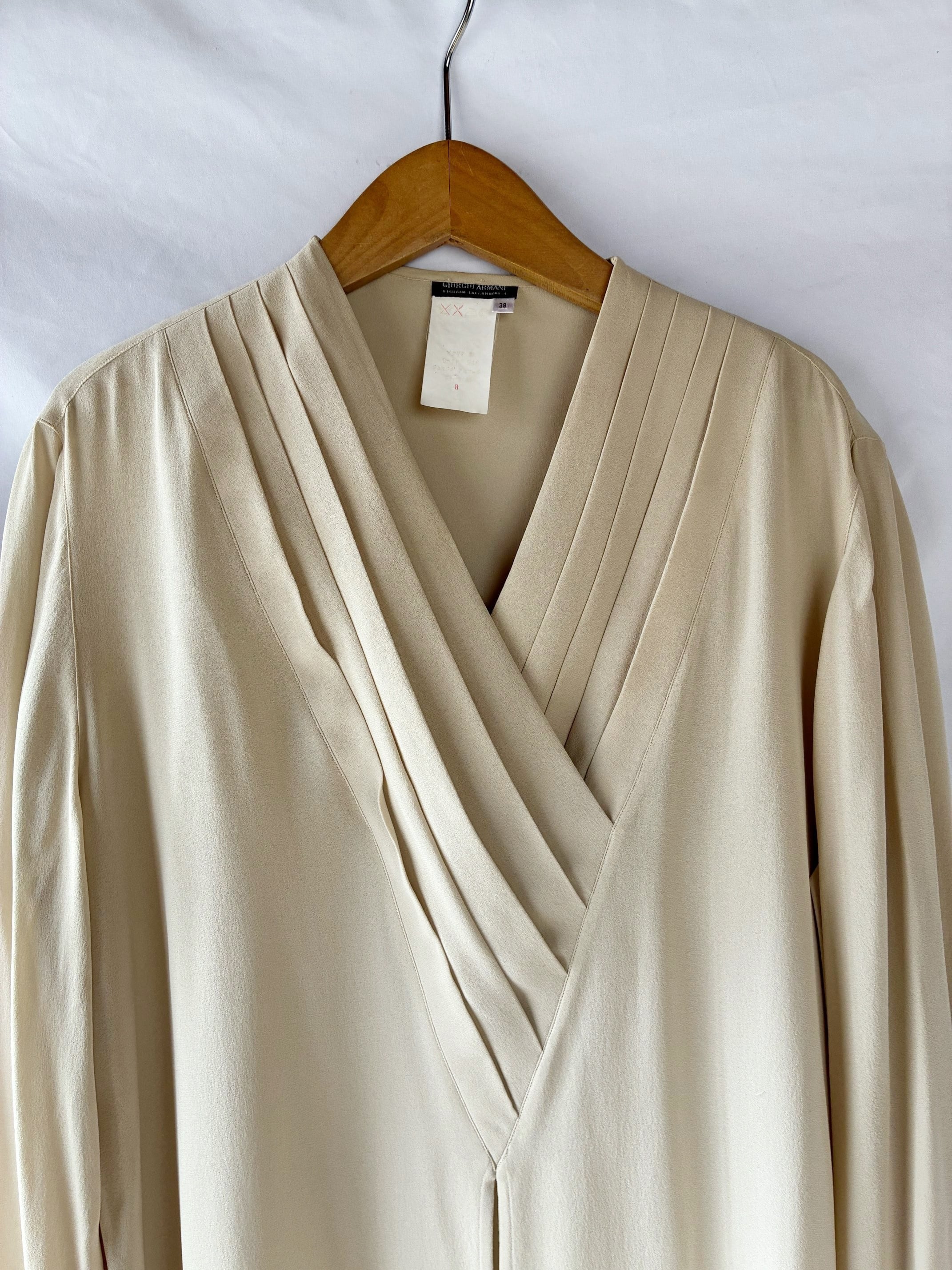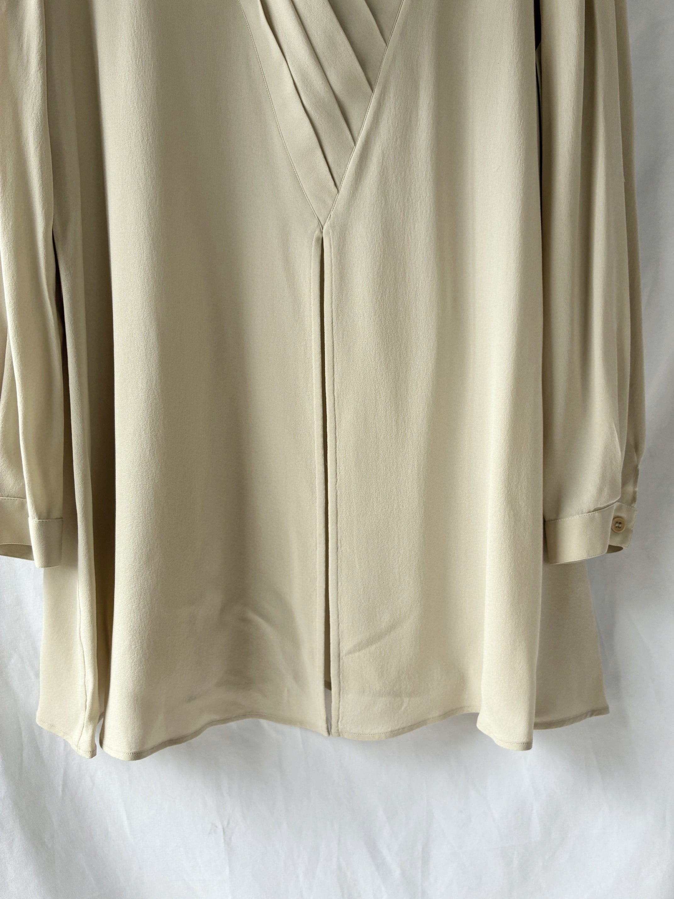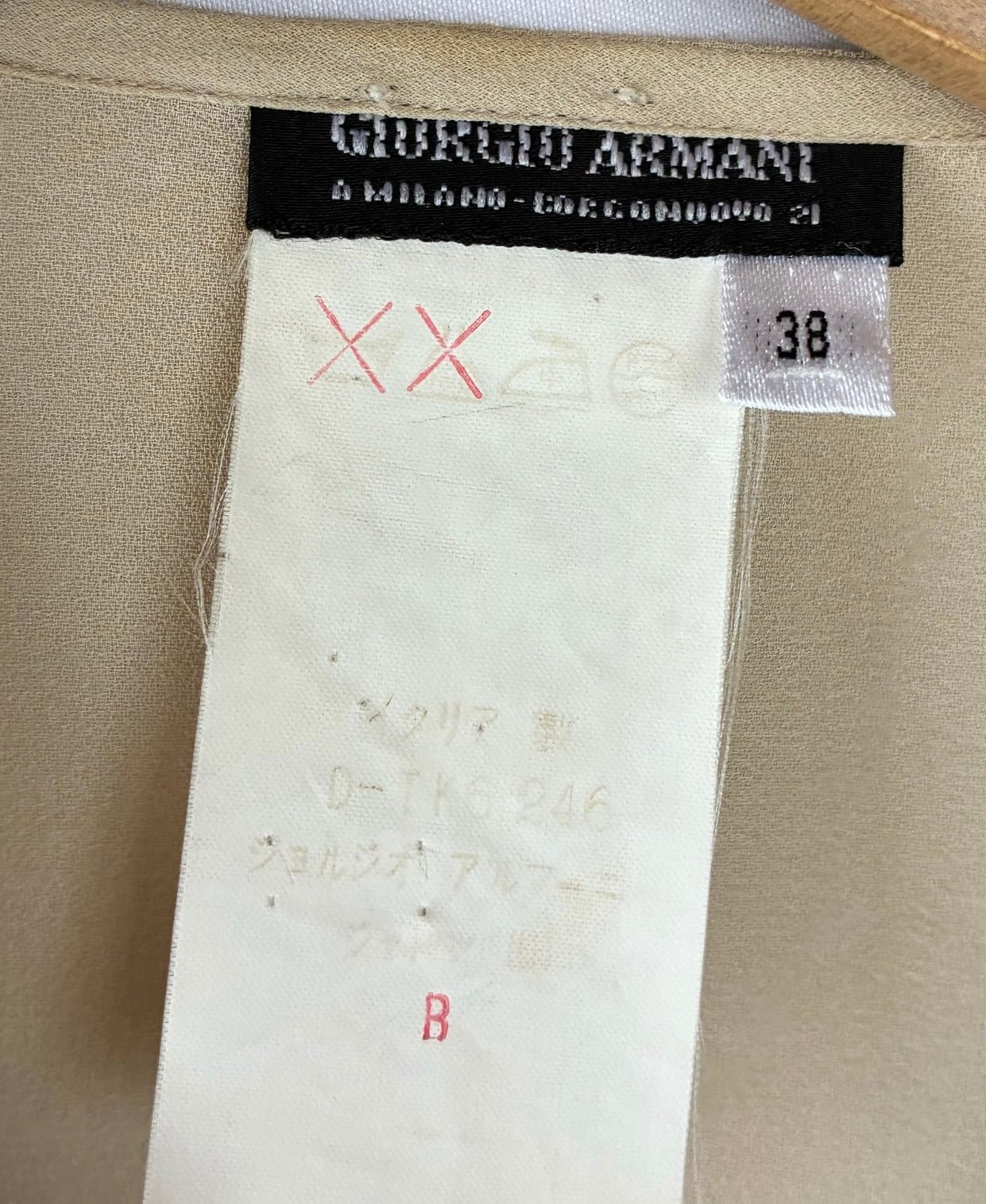グレージュの淡い色味がムーディーなARMANI Vintage ブラウス。やや長めの丈感がモードな印象。Vネックに沿ったギャザーが動きのあるデザイン。 さらりとしたSilk素材で着心地の良い一枚です。