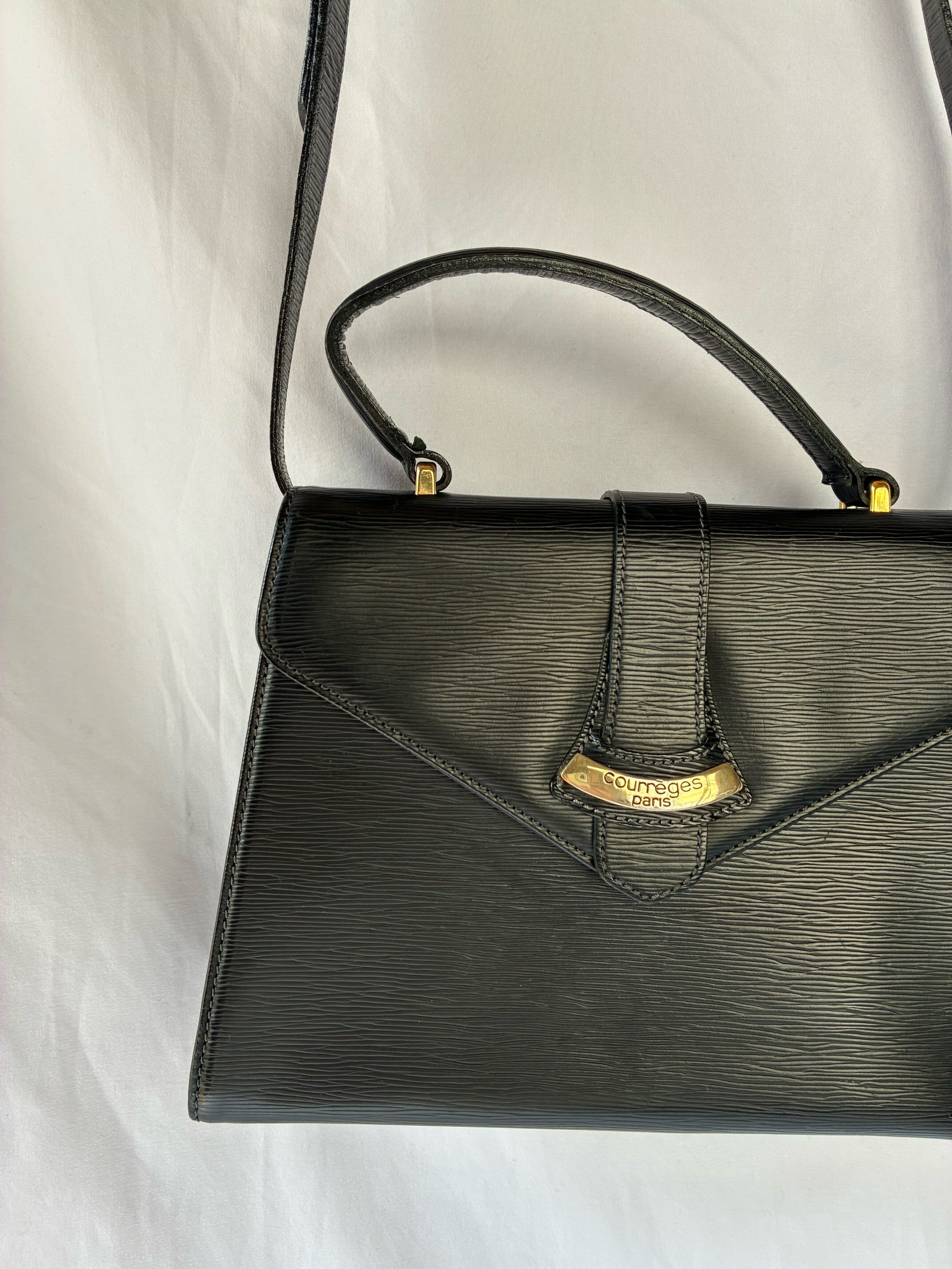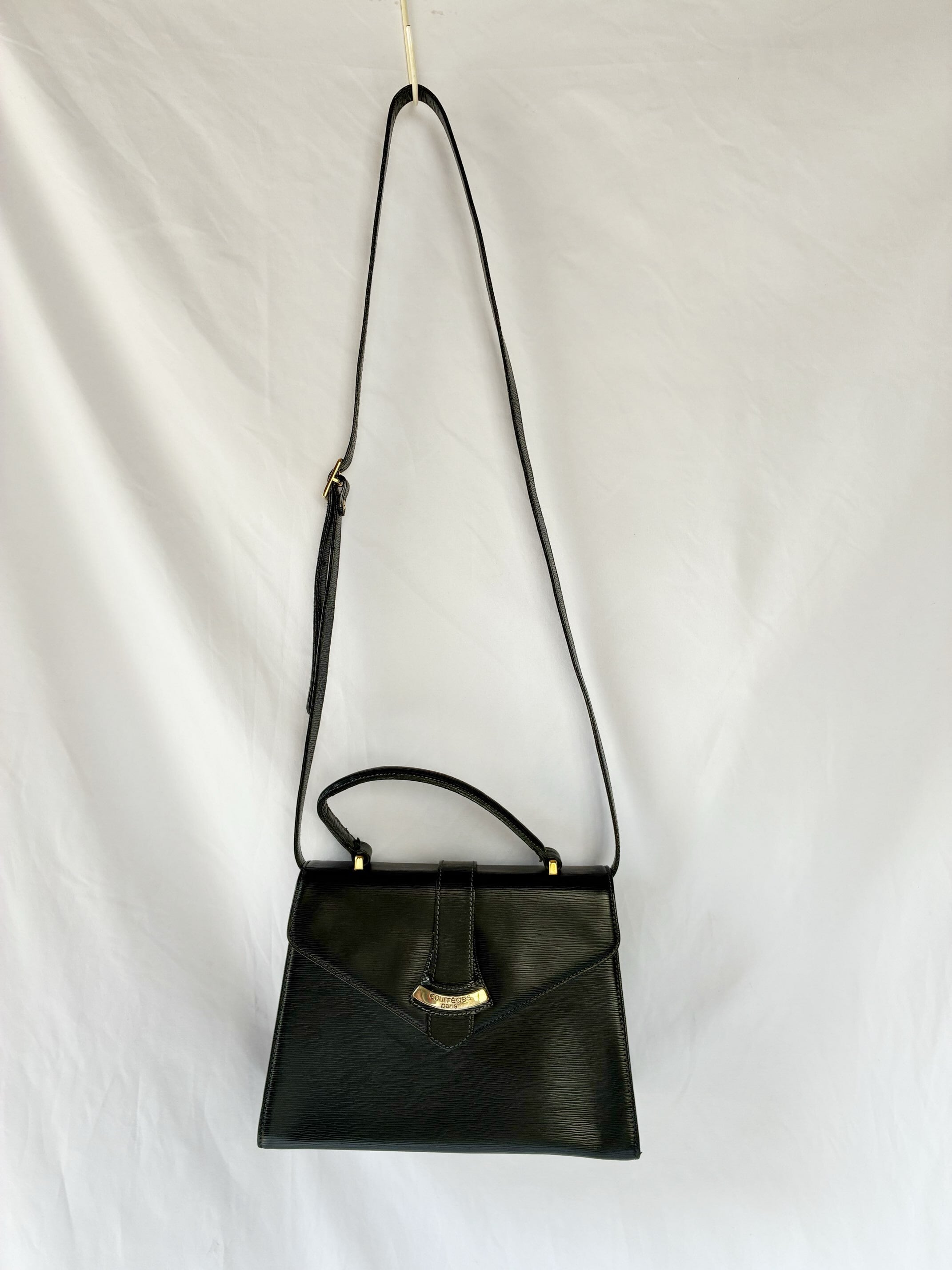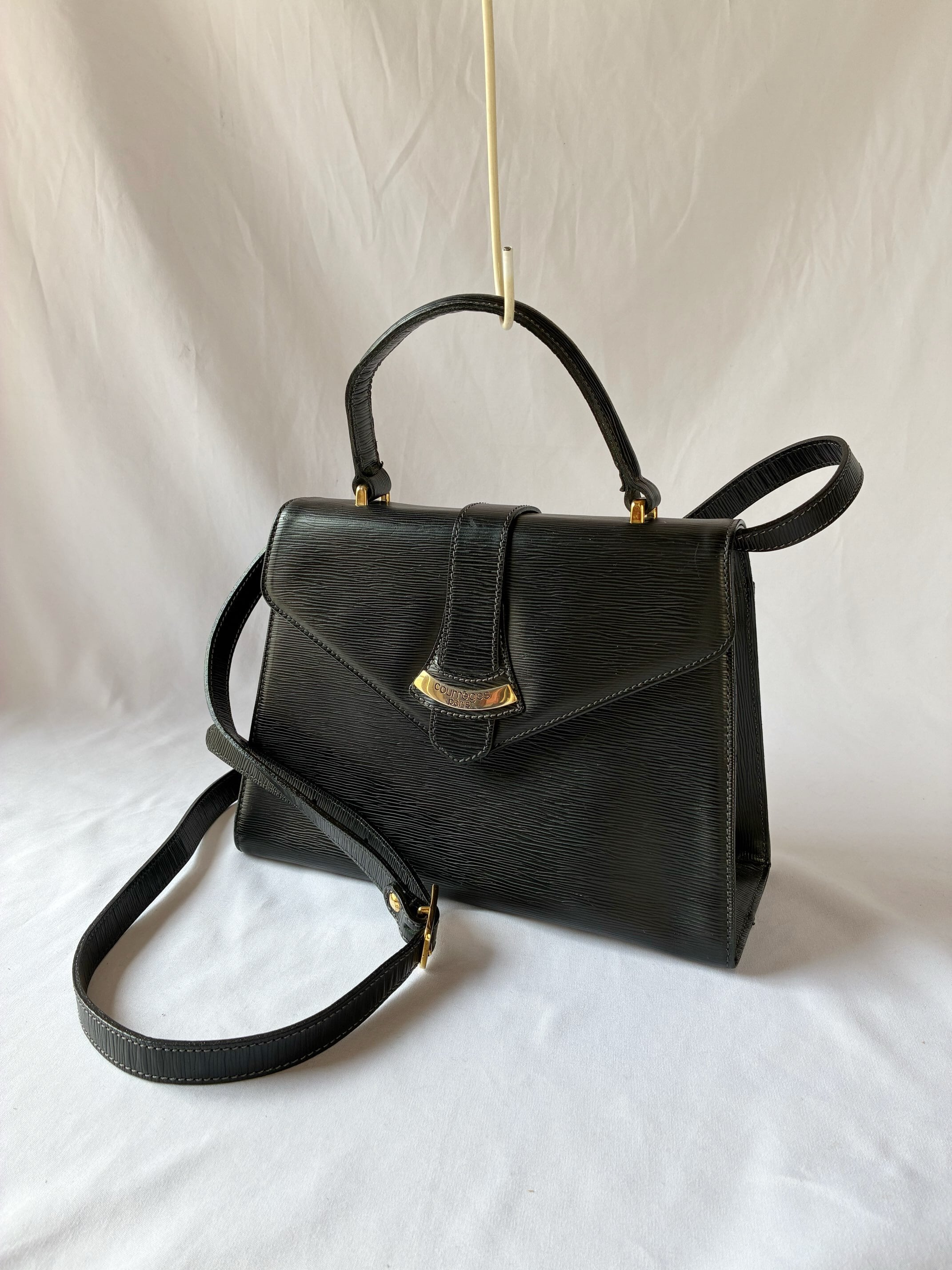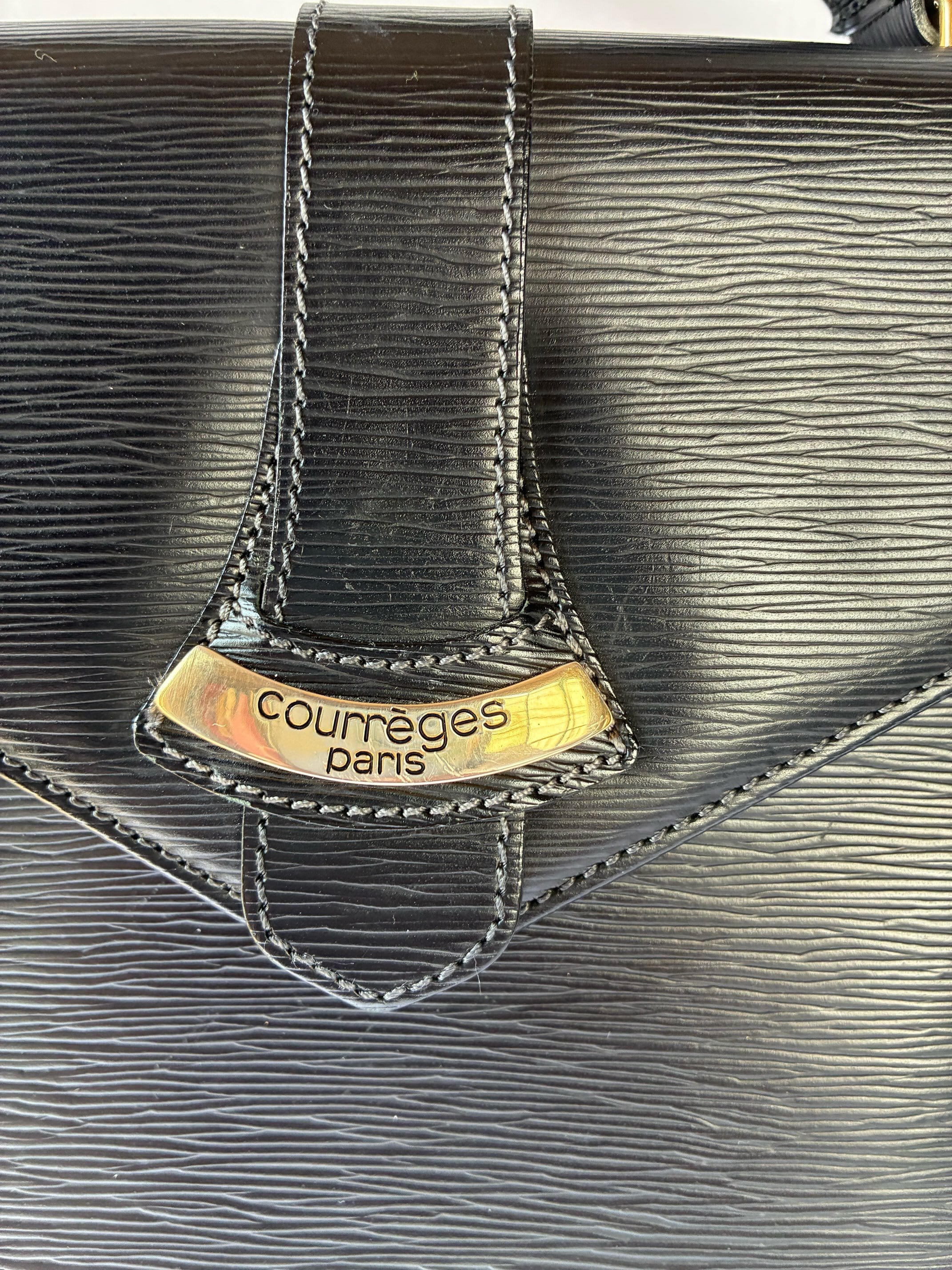 ブラックレザーにゴールドのメタルロゴが映えるCourreges Vintage ショルダーBag.