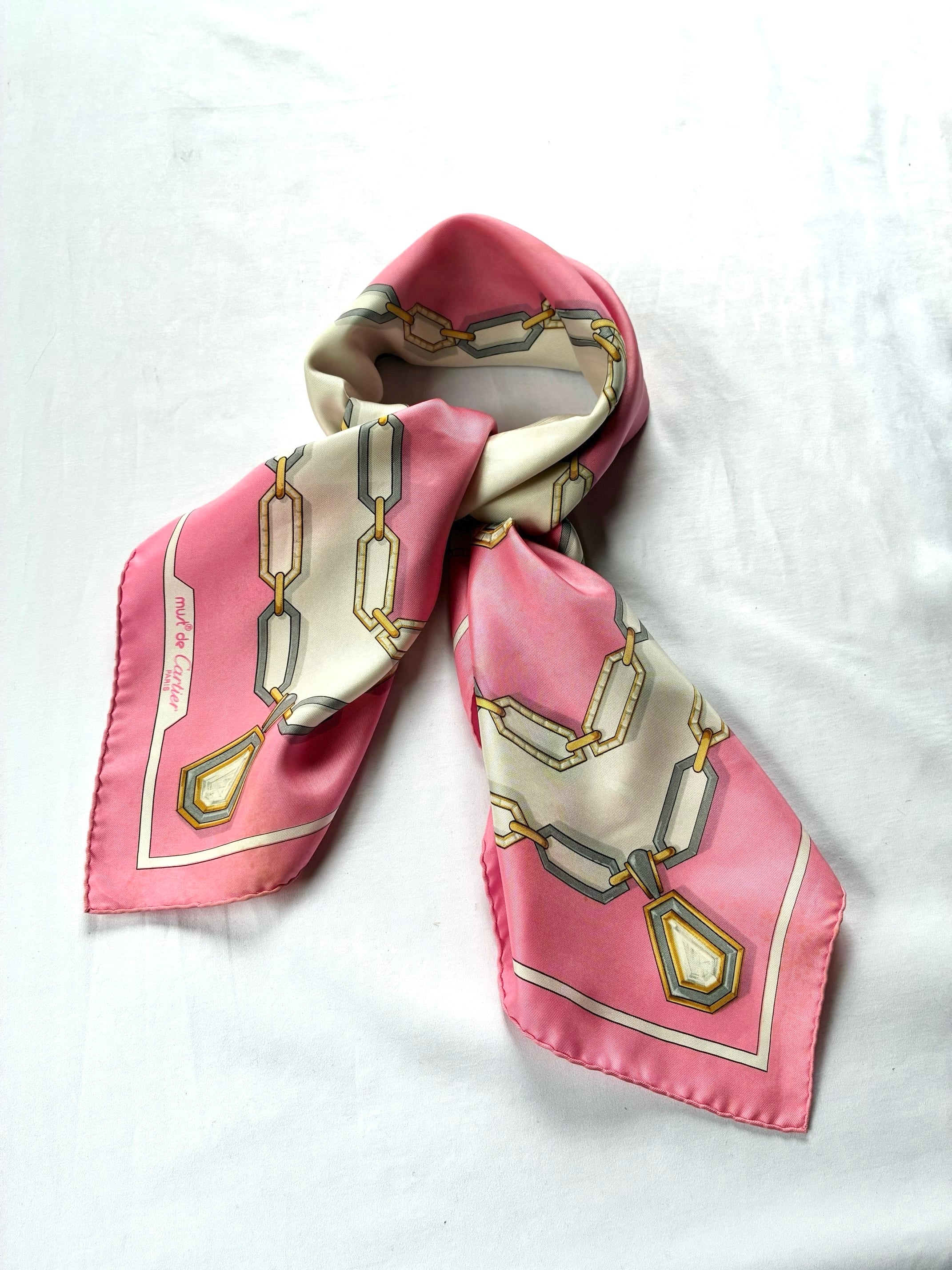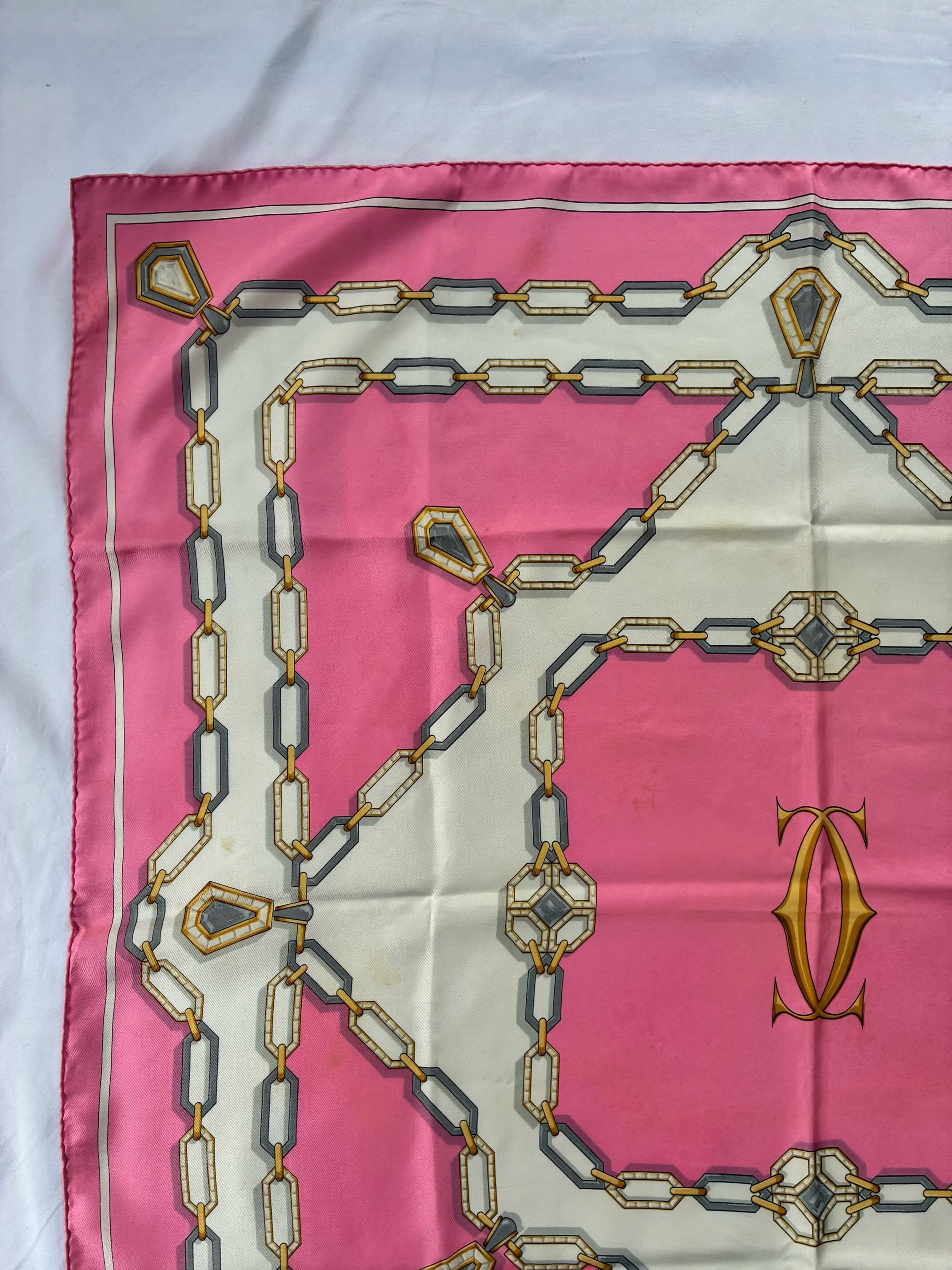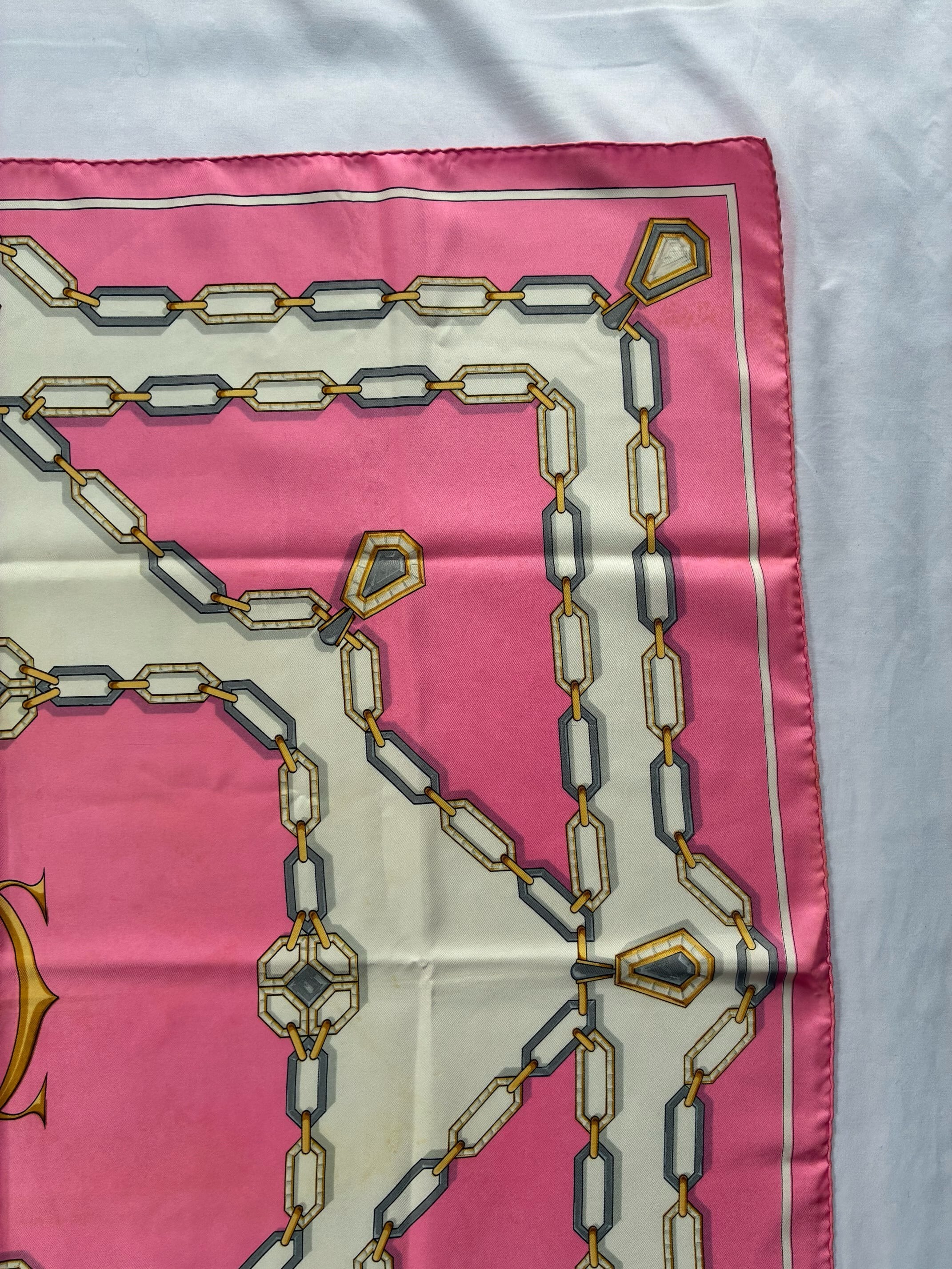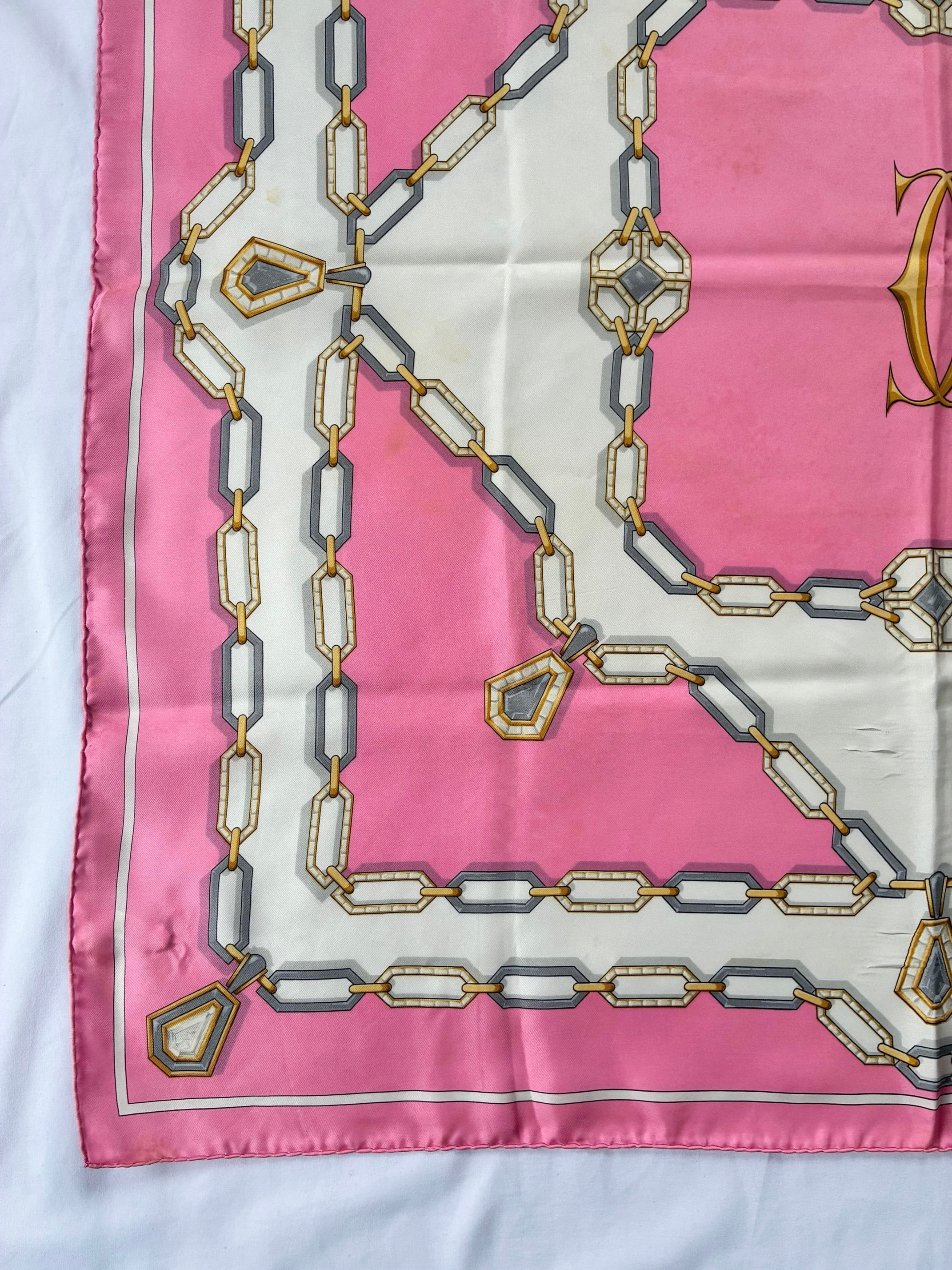 センターのゴールドロゴが目をひくCartier Vintage スカーフ。ピンク×ホワイトのバイカラーがかわいらしいカラーリングご珍しい。ゴールドとシルバーのチェーン モチーフがアクセントに効いた一枚です。