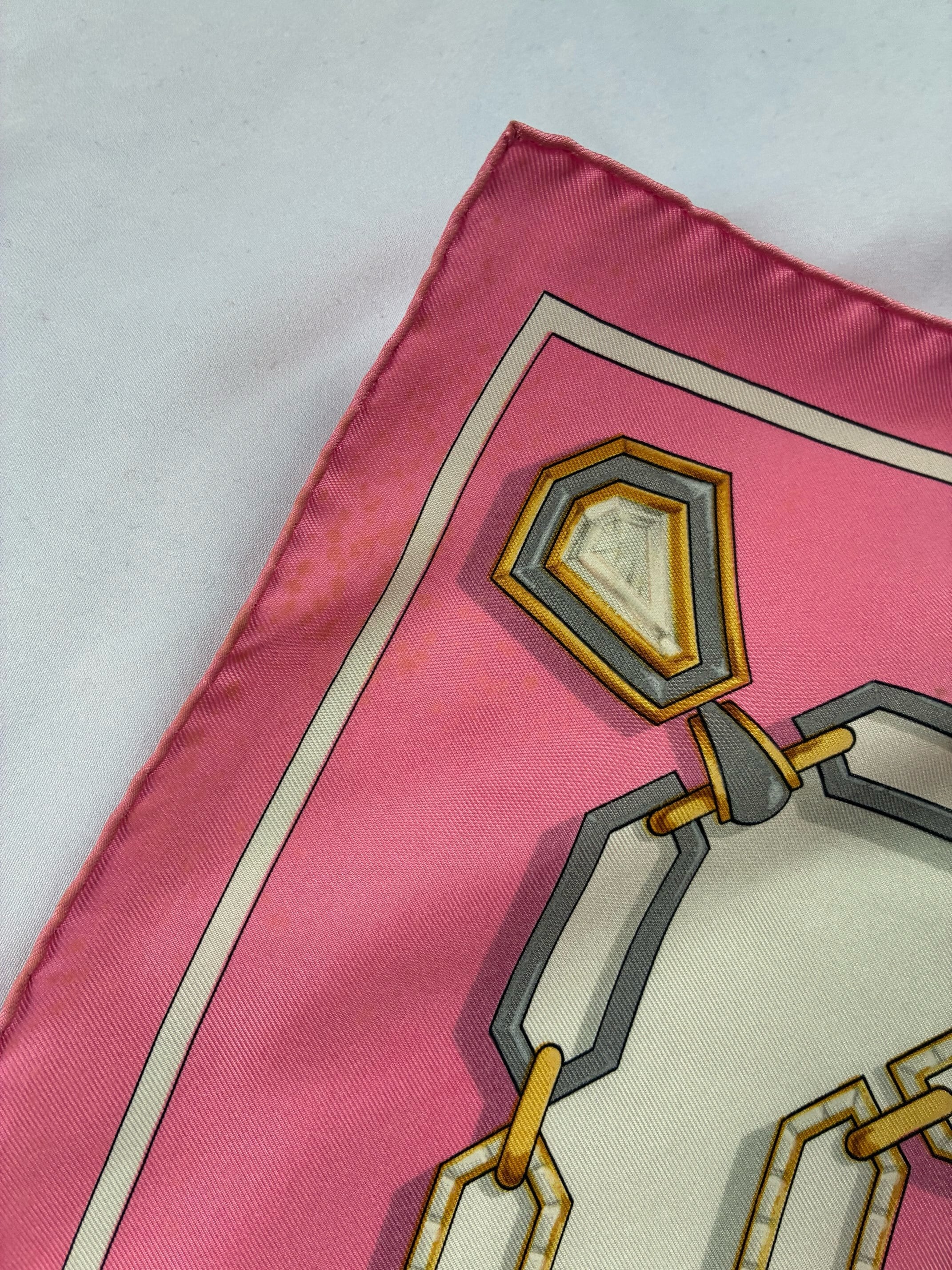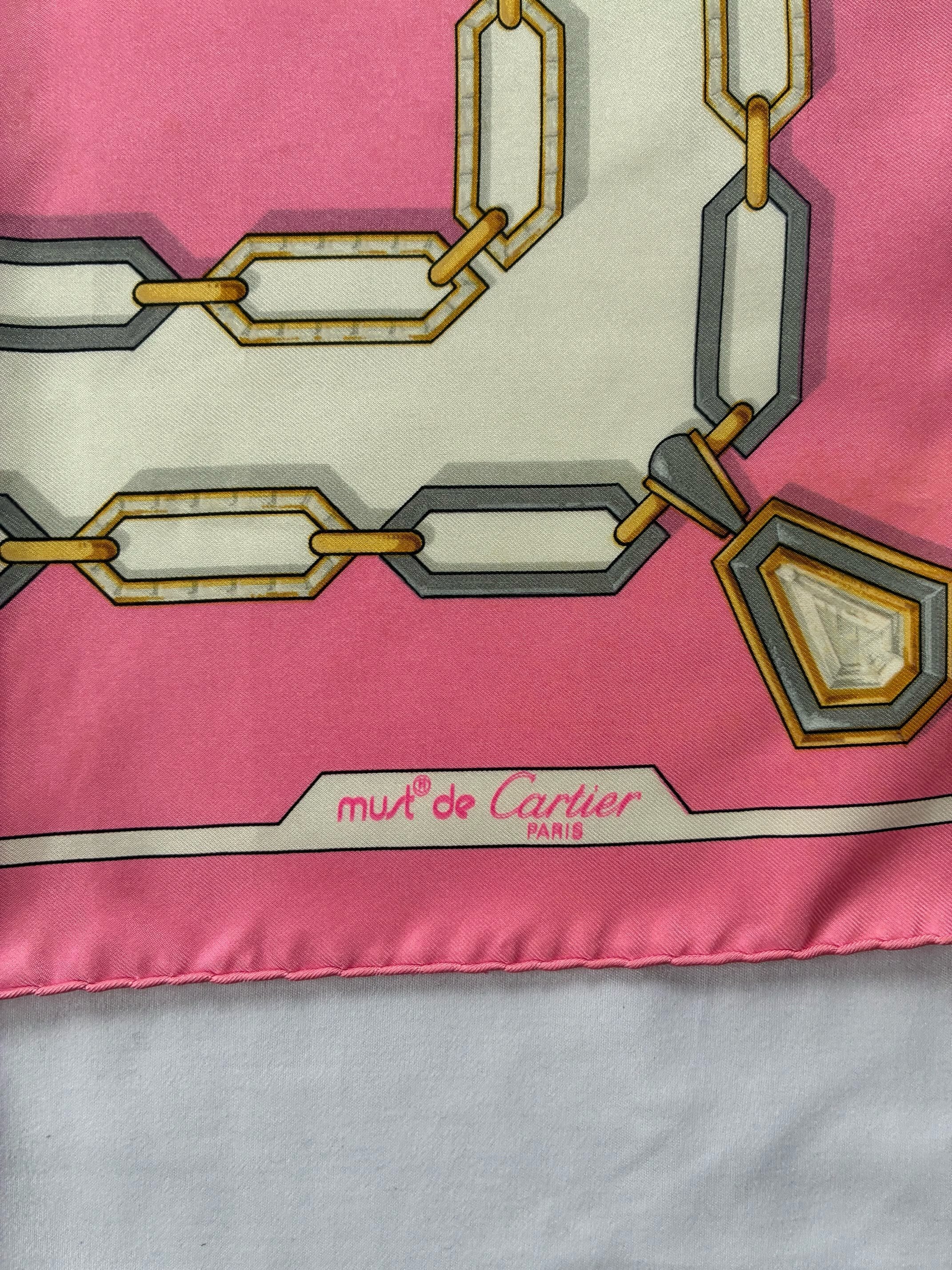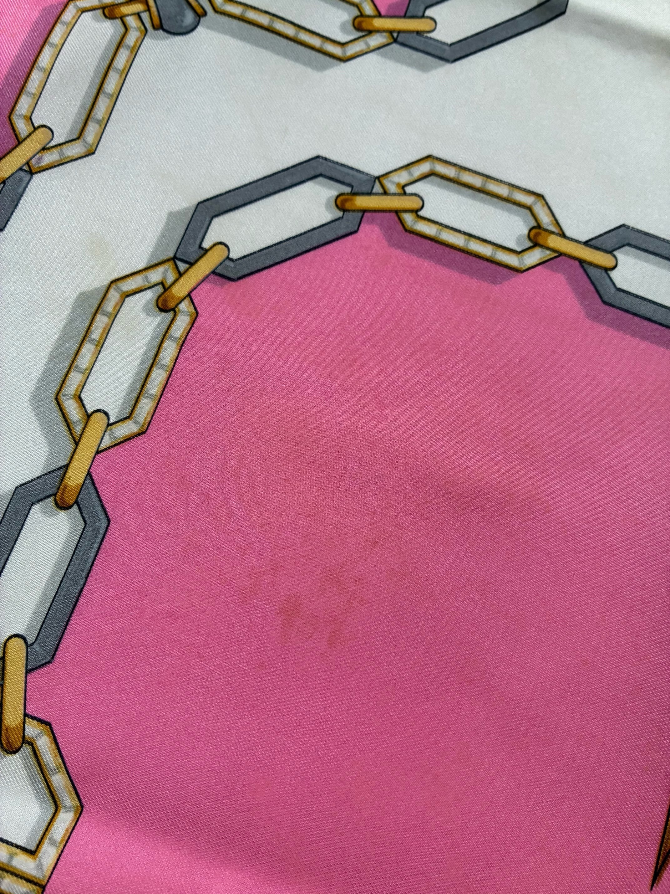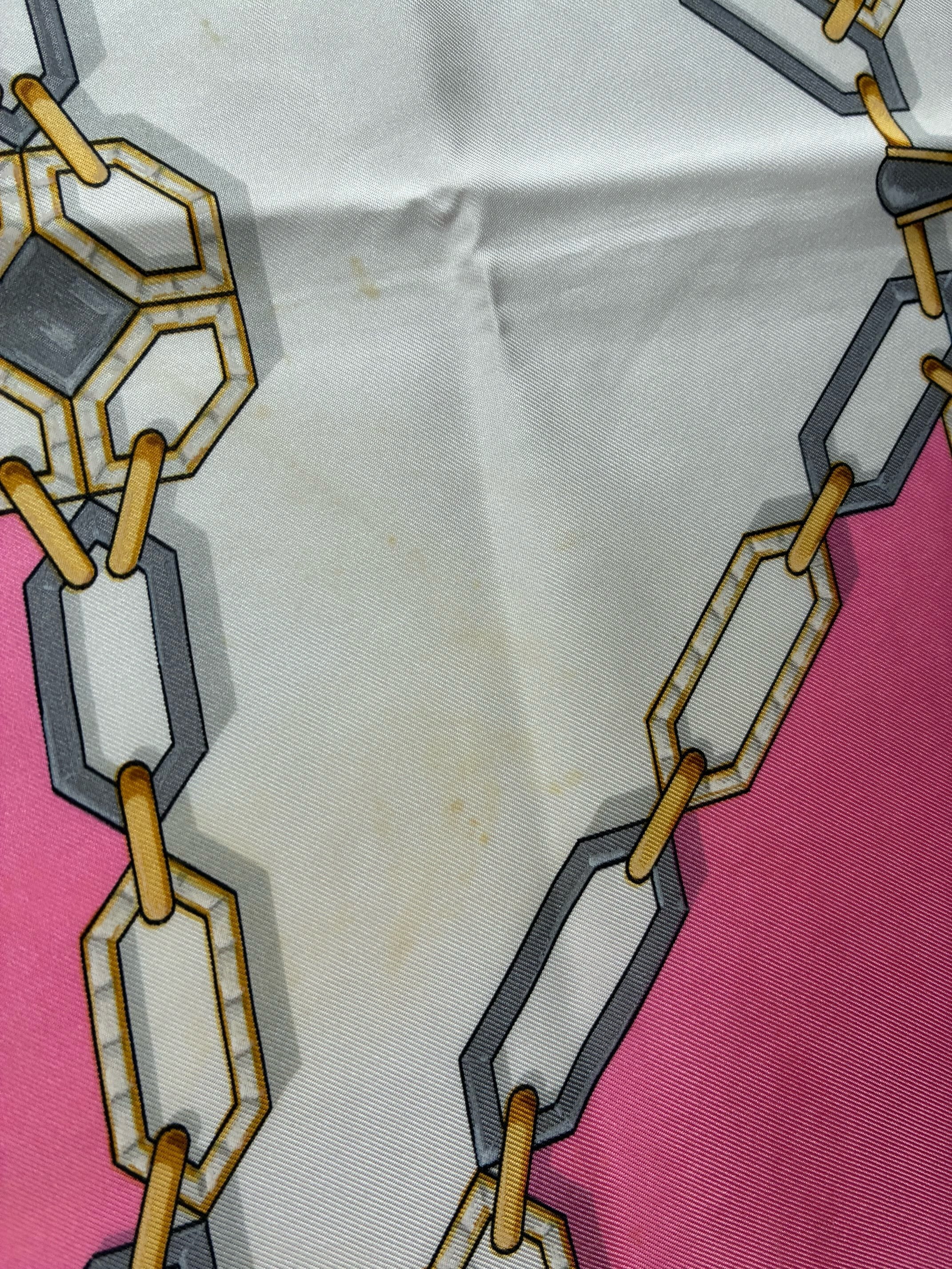 センターのゴールドロゴが目をひくCartier Vintage スカーフ。ピンク×ホワイトのバイカラーがかわいらしいカラーリングご珍しい。ゴールドとシルバーのチェーン モチーフがアクセントに効いた一枚です。